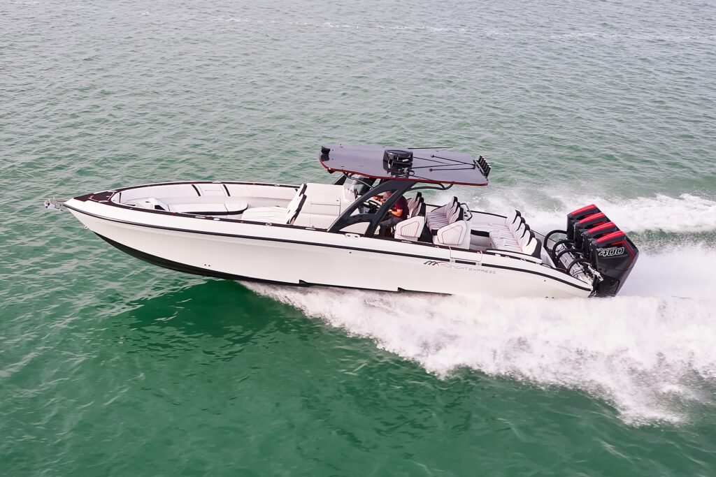 The Midnight Express 34′ Open combines luxury and performance in a sleek and versatile design, perfect for any marine adventure.