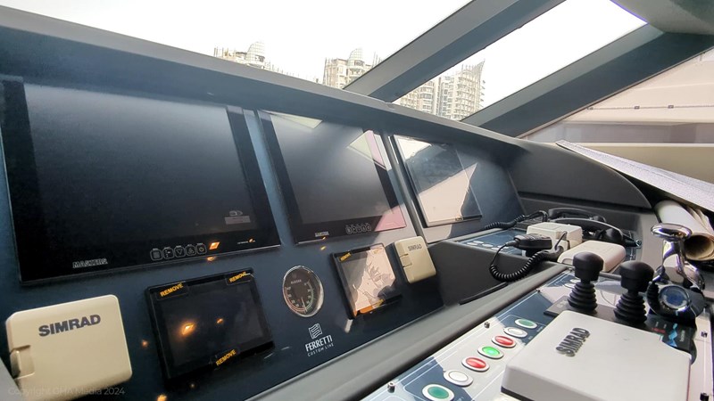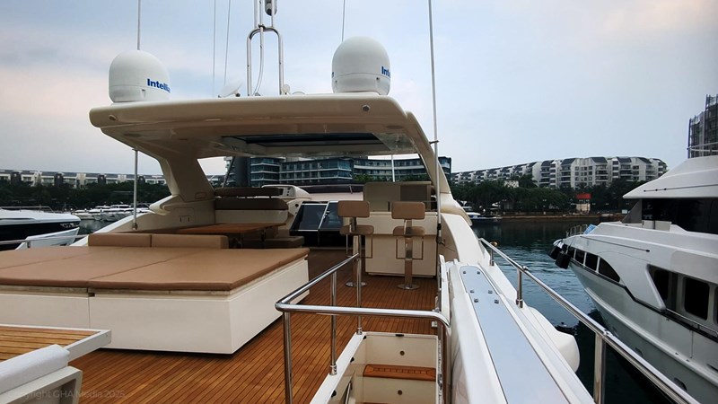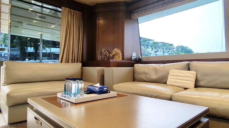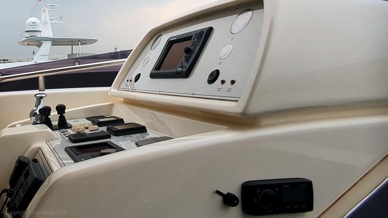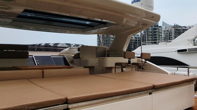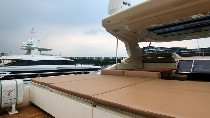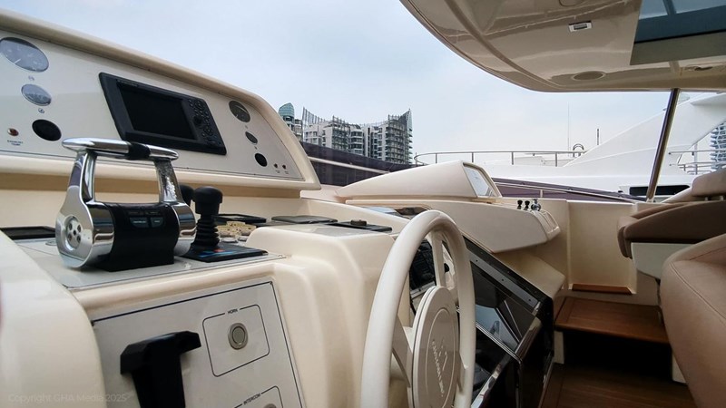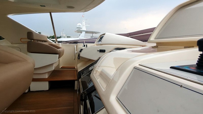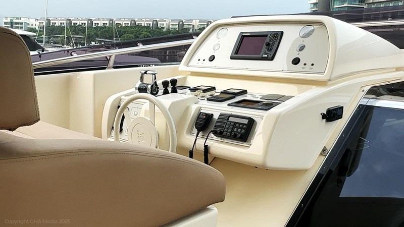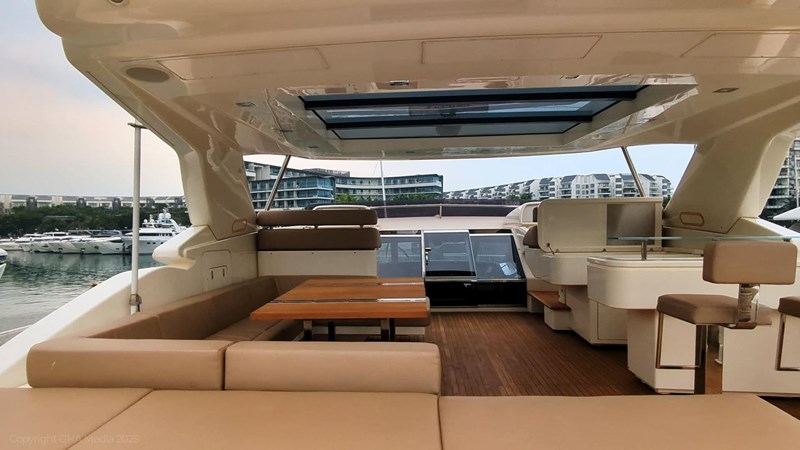 The interior is bright, spacious, and finished in classic Ferretti styling. Outdoor areas are well laid out, with a large
