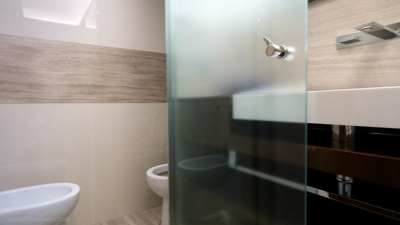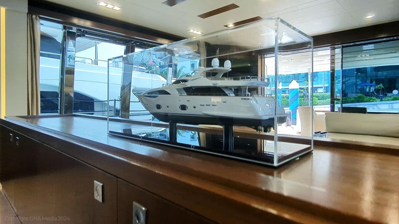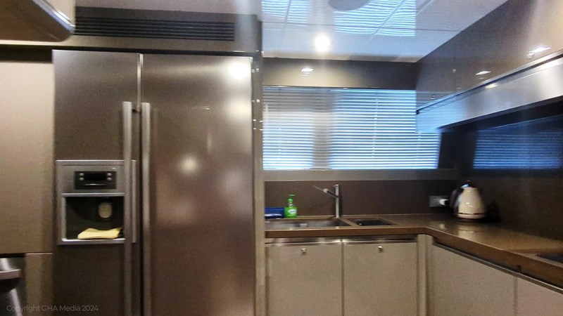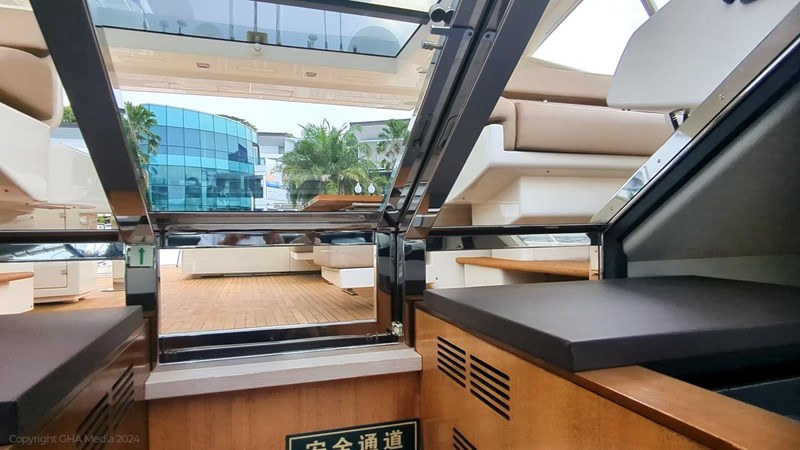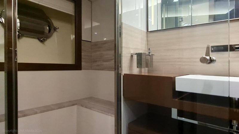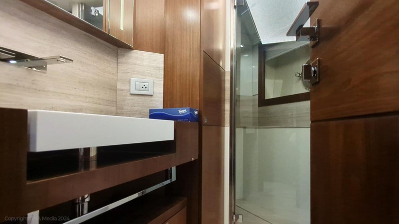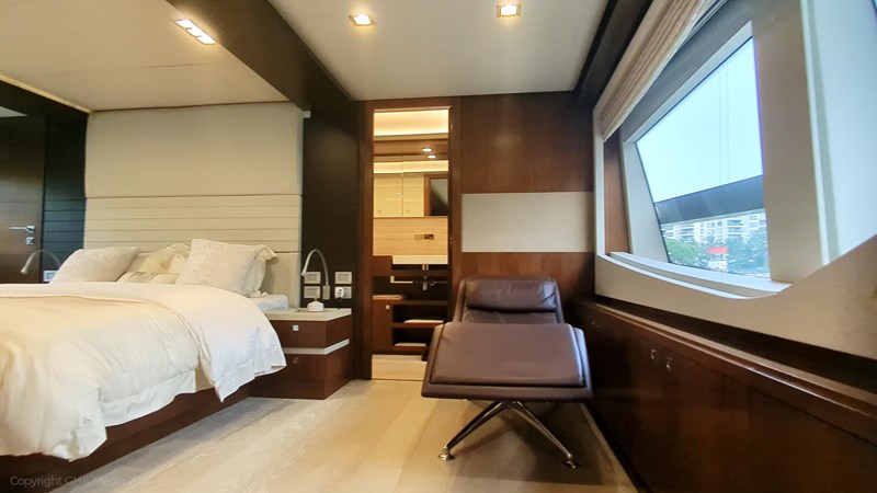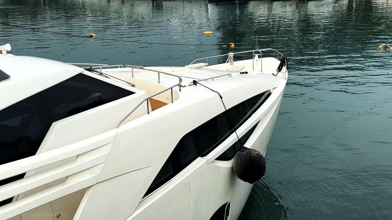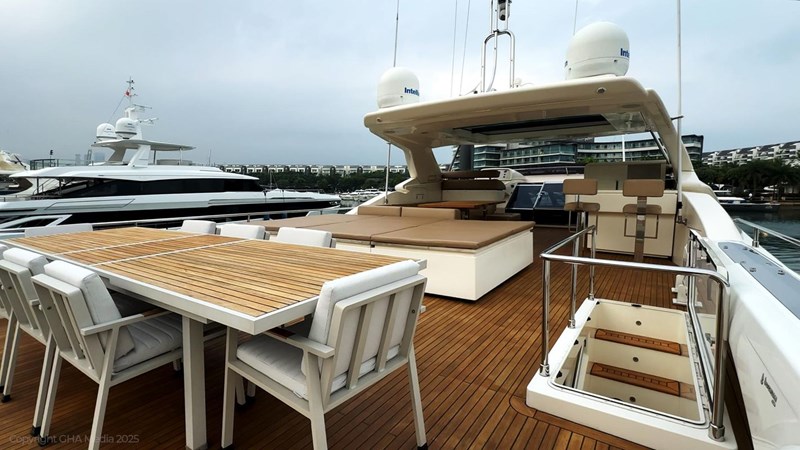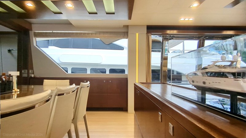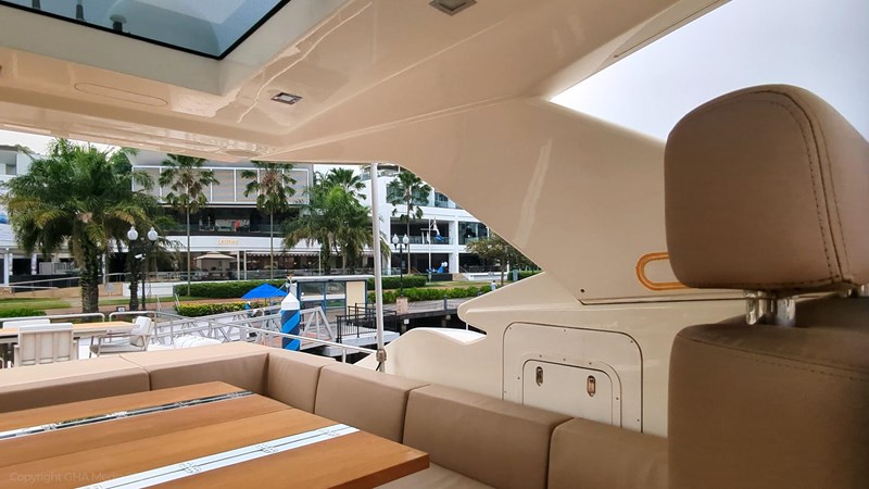 The interior is bright, spacious, and finished in classic Ferretti styling. Outdoor areas are well laid out, with a large