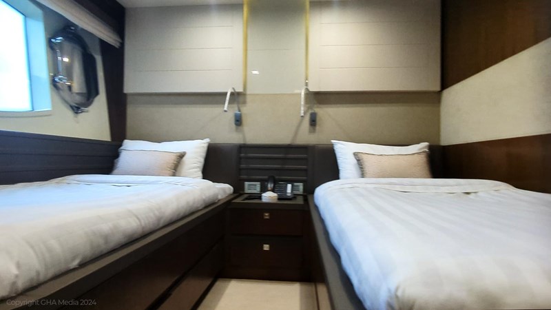 She features a 5-cabin layout including a full-beam master on the main deck, two VIPs, and two twin cabins below.