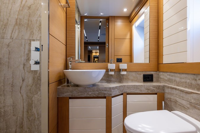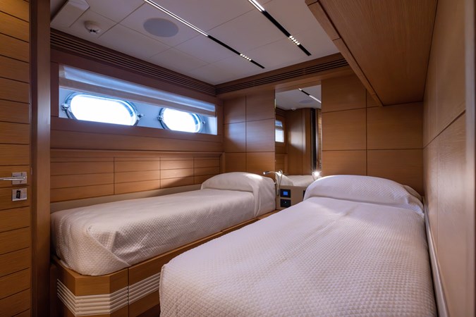 The accommodation layout is equally flexible, with up to six cabins that can be configured to maximize privacy and comfort. The on-deck primary suite offers stunning ocean views, a spacious en-suite bath, and premium finishes, while the VIP stateroom and additional guest cabins provide refined yet comfortable accommodations. Below deck, the crew quarters include three cabins with private heads, ensuring seamless service while maintaining owner and guest privacy.