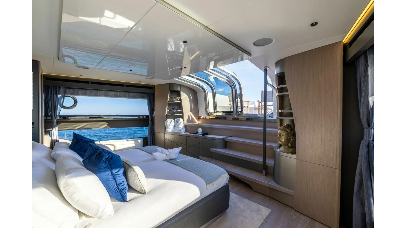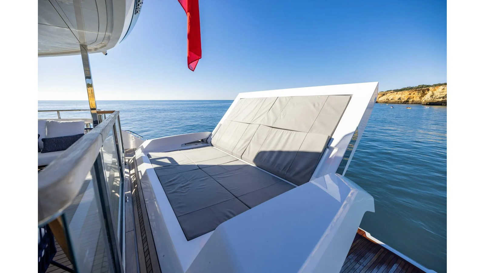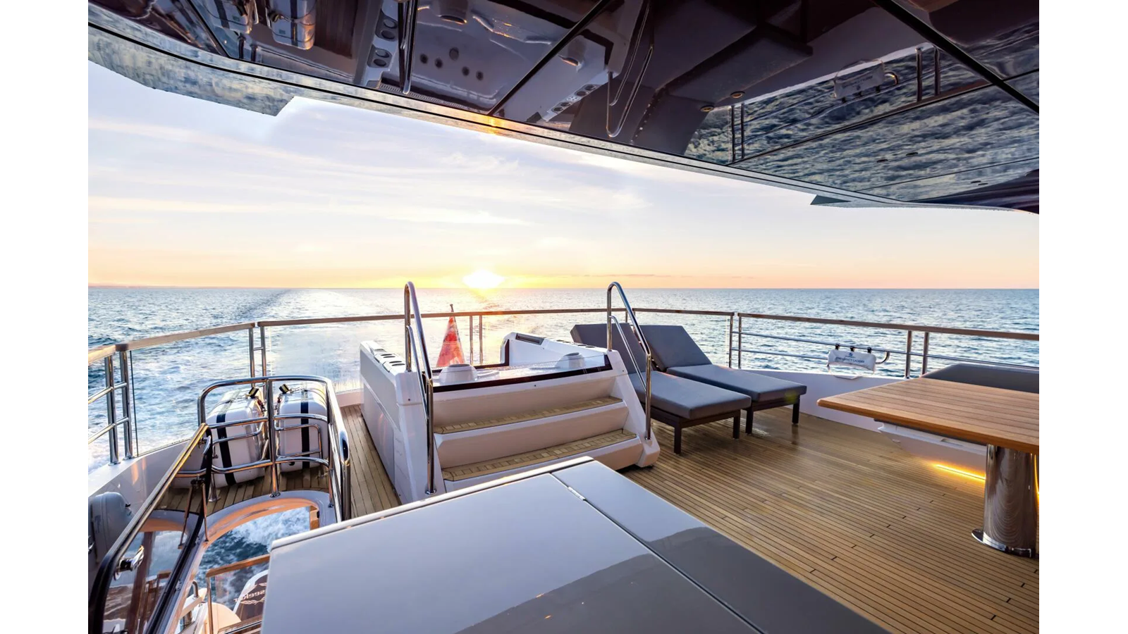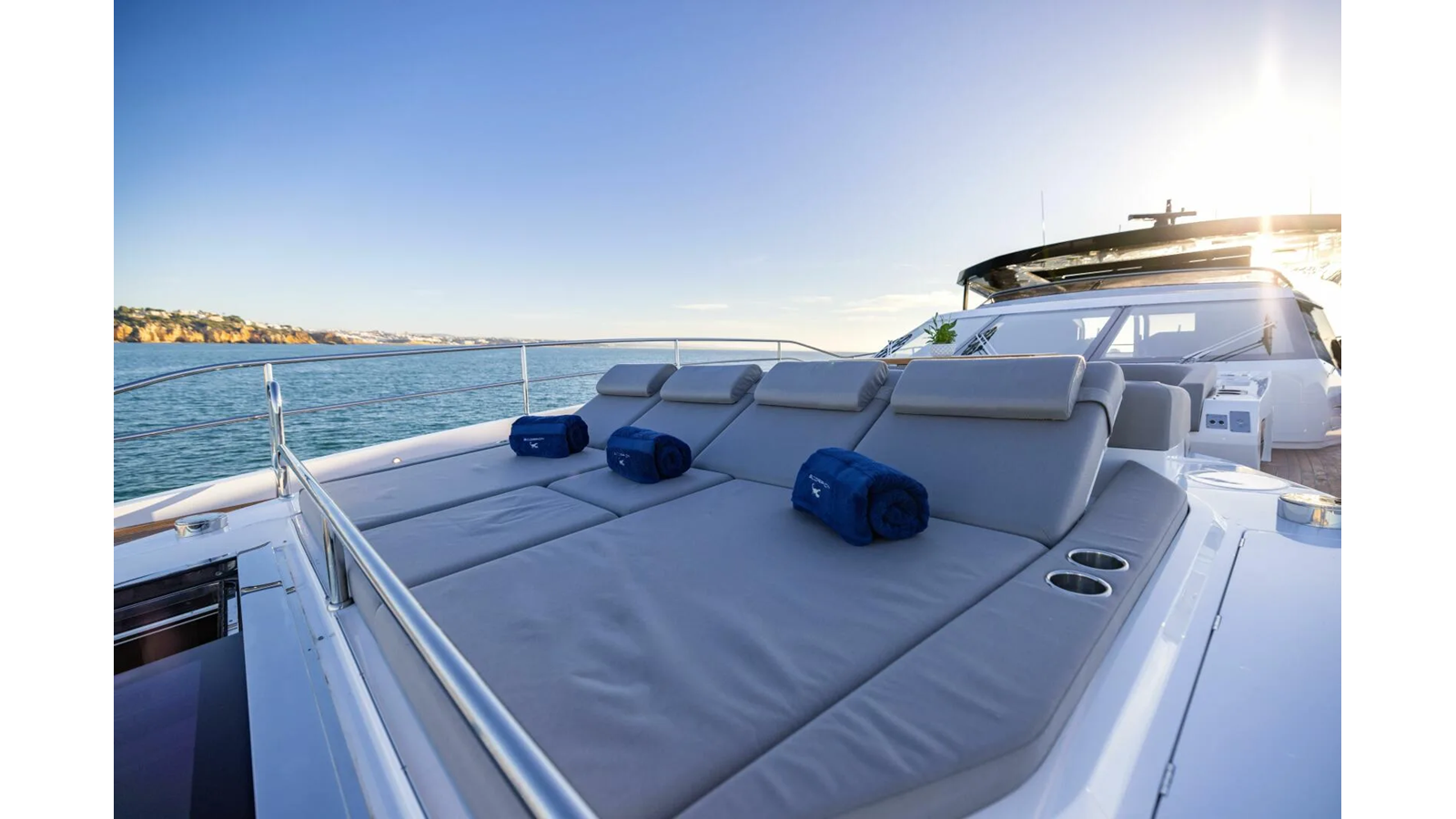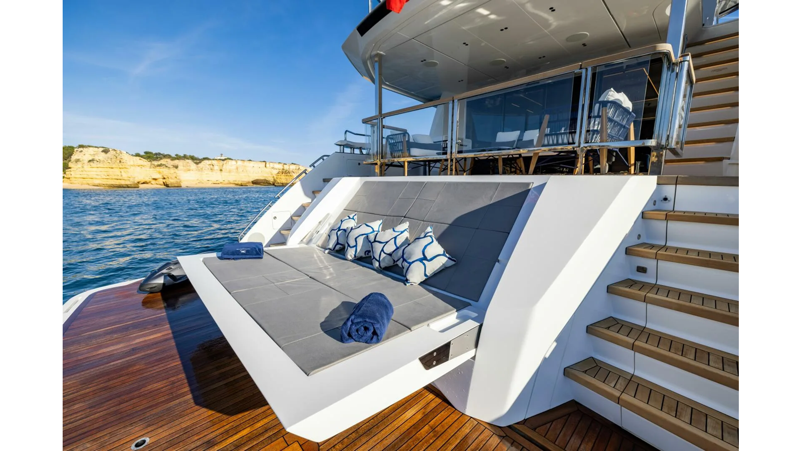 A striking Owner Stateroom forward with a private bow terrace, sunbathing hideaways, a breathtaking single-level exterior deck from flybridge to foredeck, a beautifully proportioned open-plan interior and generous âBeach Clubâ, just a few of her magnificent features.