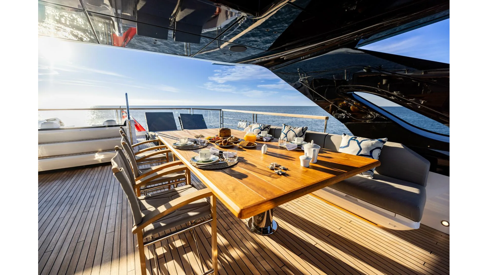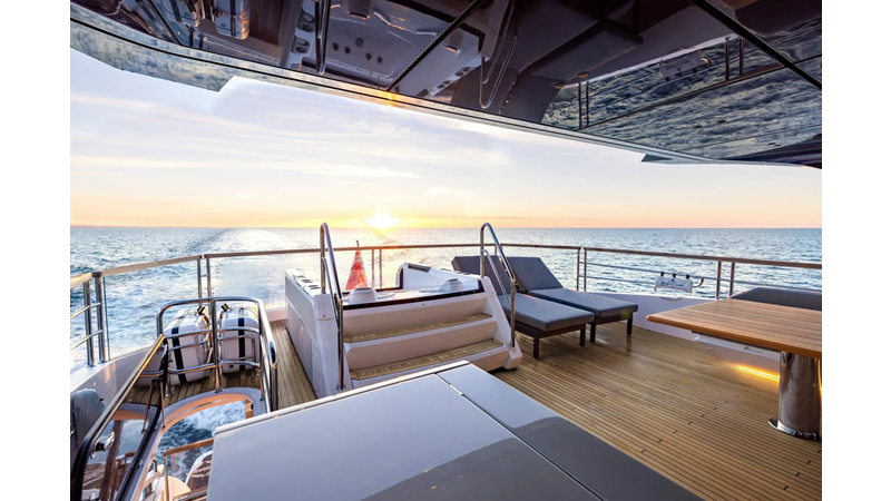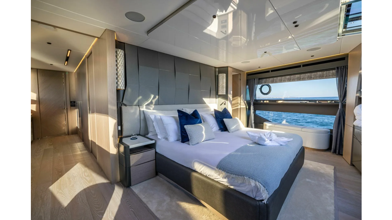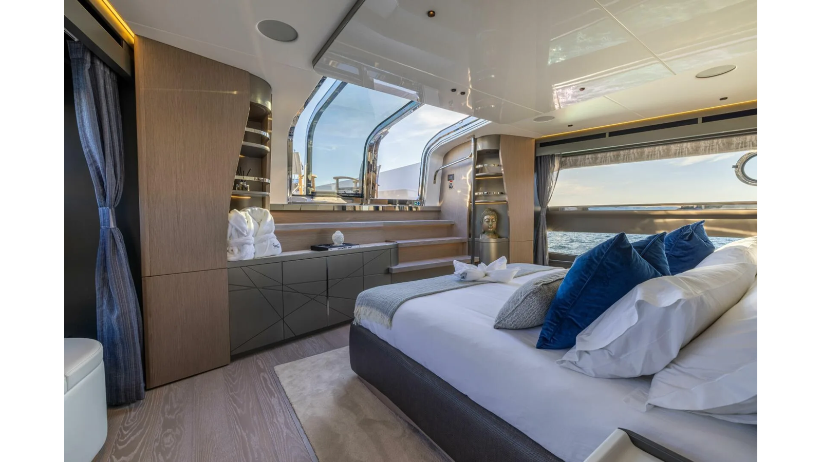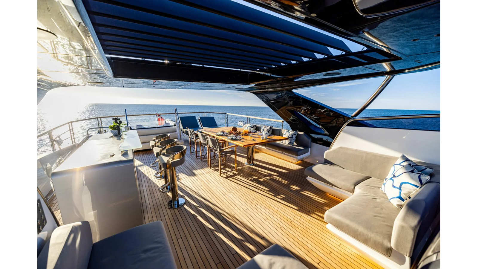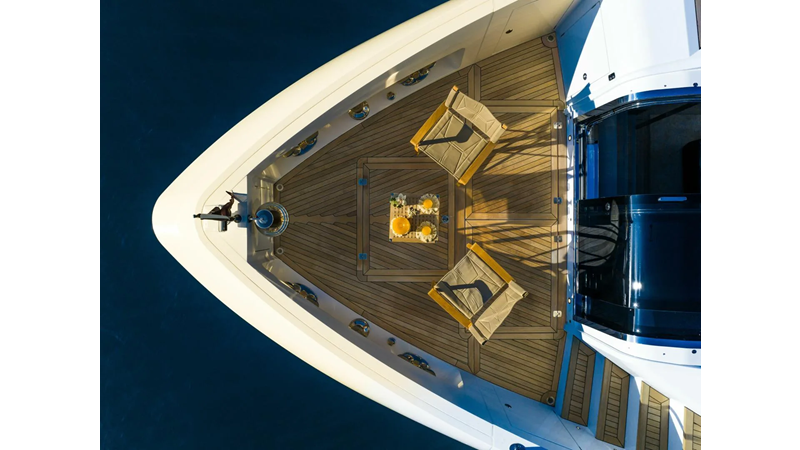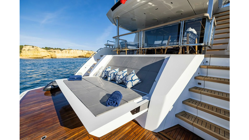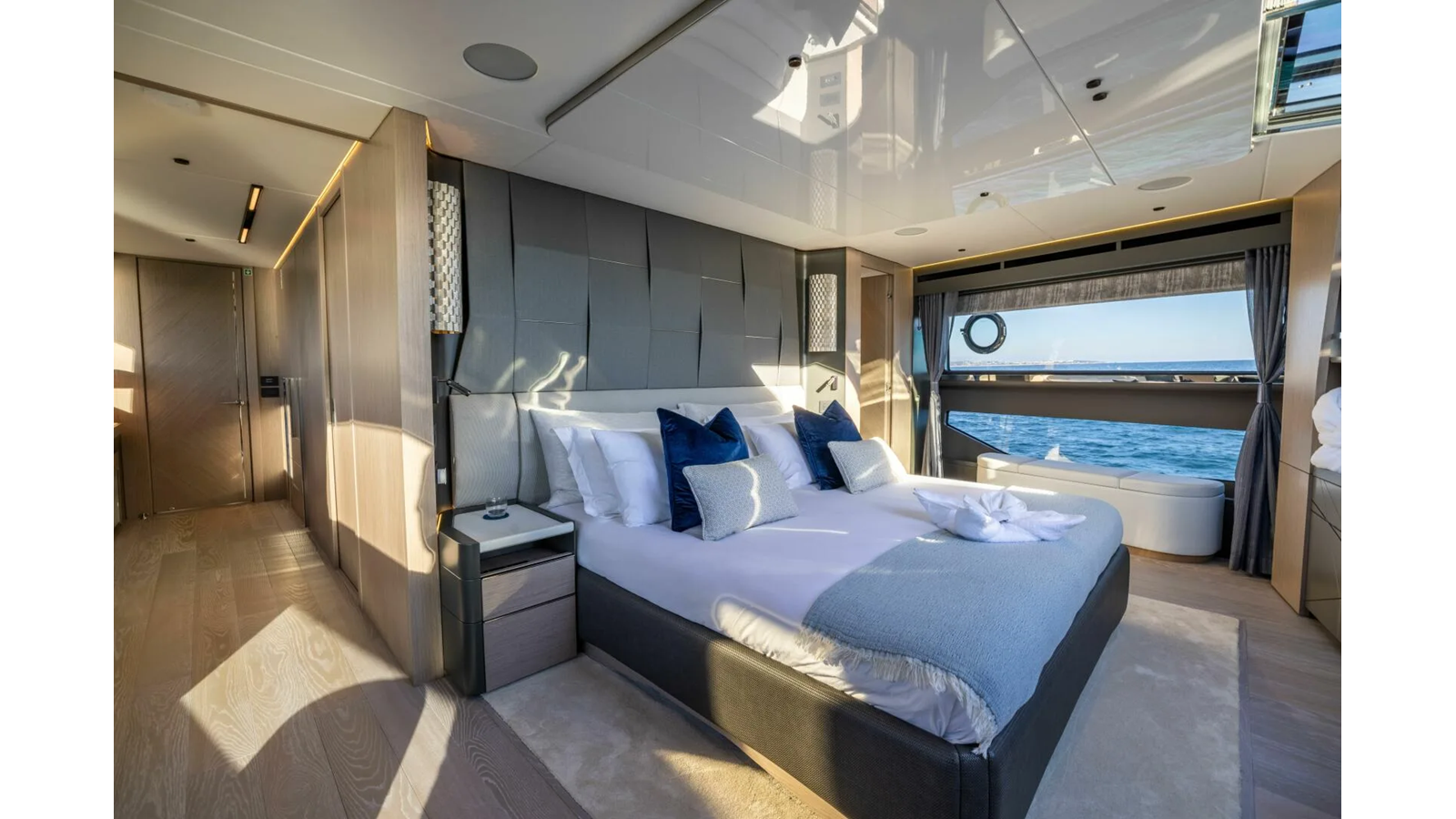 A striking Owner Stateroom forward with a private bow terrace, sunbathing hideaways, a breathtaking single-level exterior deck from flybridge to foredeck, a beautifully proportioned open-plan interior and generous âBeach Clubâ, just a few of her magnificent features.