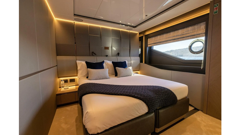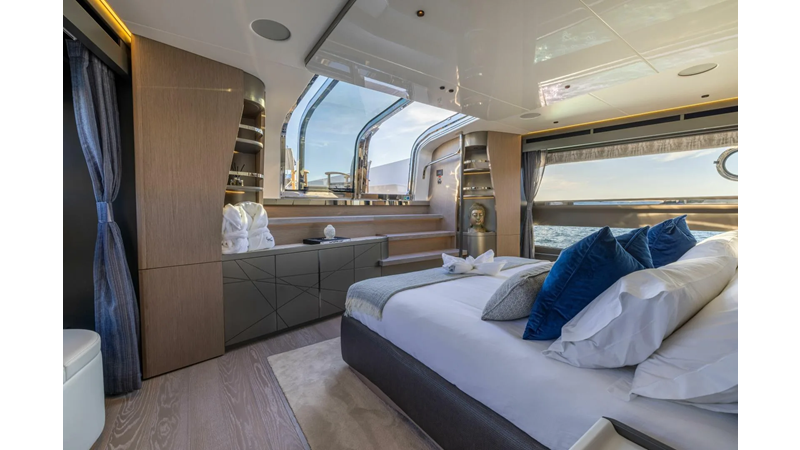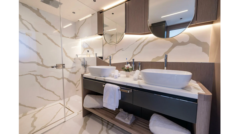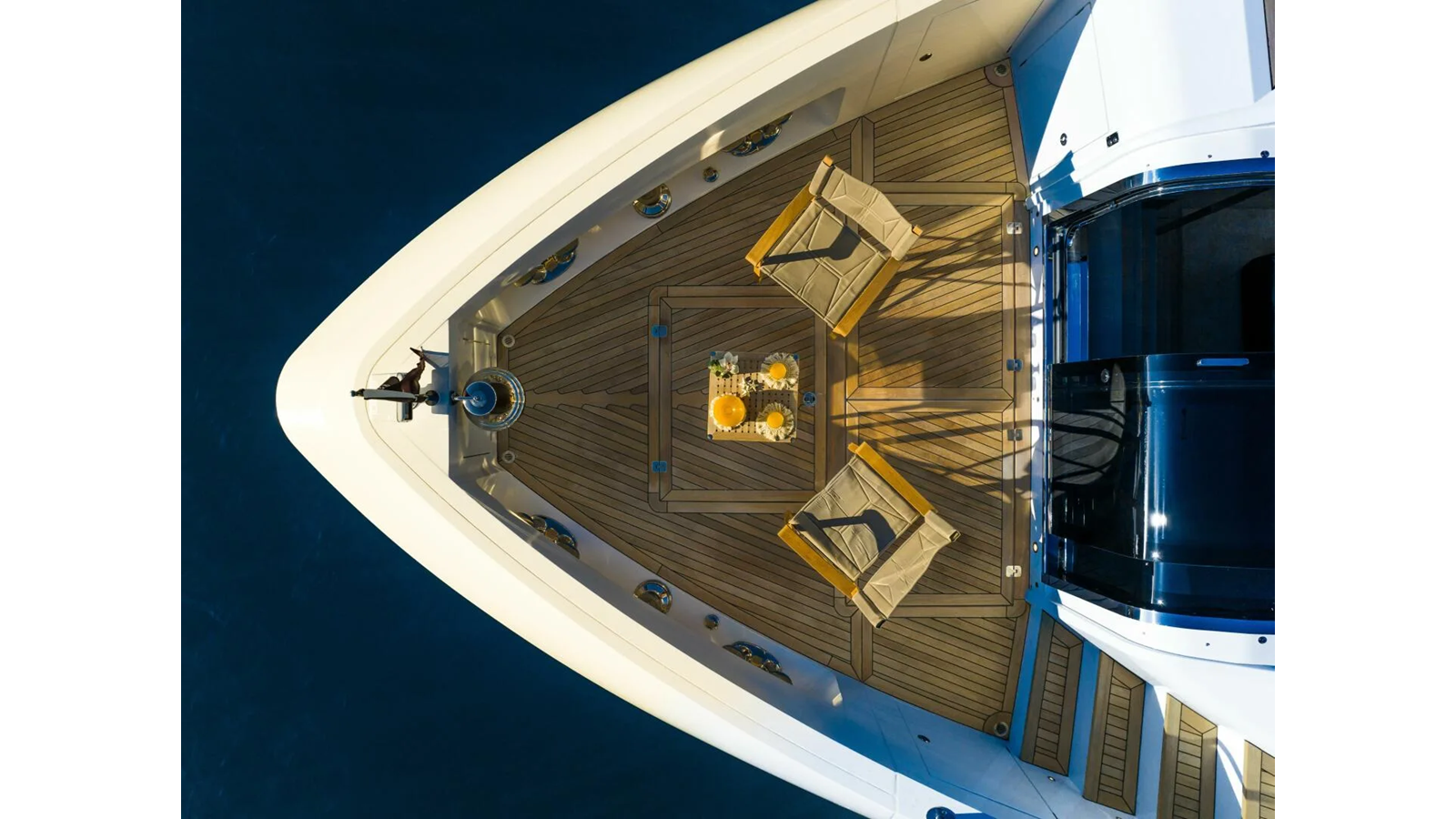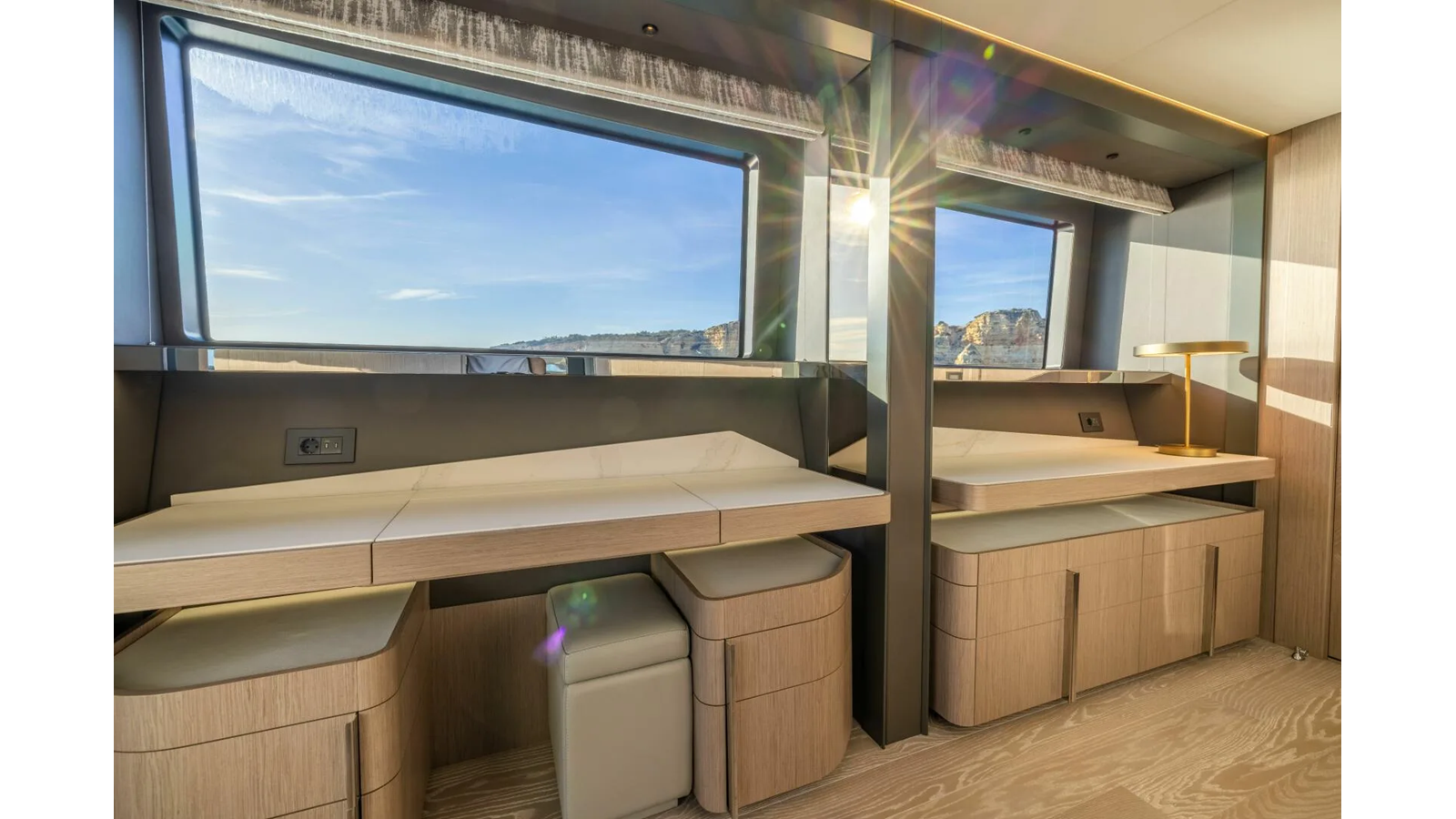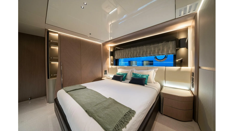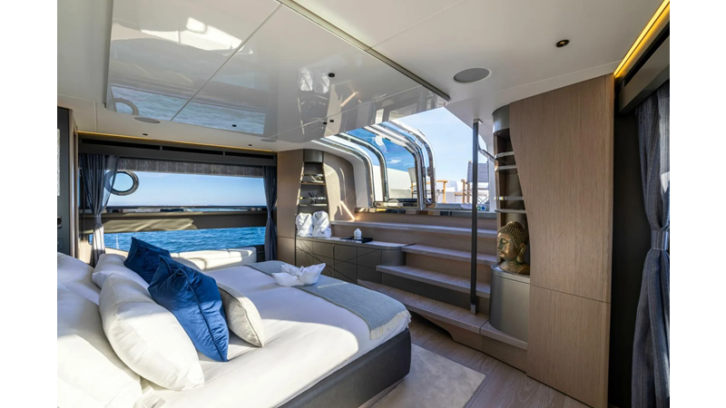 The unique main deck layout includes the Owner’s Stateroom forward for even greater flexibility and freedom on board. This full-beam stateroom offers a large lobby entrance, walk-in wardrobe with feature shelving, an office and generous en suite. Bathed in natural light courtesy of expansive panoramic glazing, owners can access a first-in-class bow terrace for ultimate privacy through a cleverly sculptured, fully-glazed sliding door forward. The crew cabin is also worthy of mention, featuring a Captainâs cabin with en suite, two twins each with en suite, a highly specified crew mess.