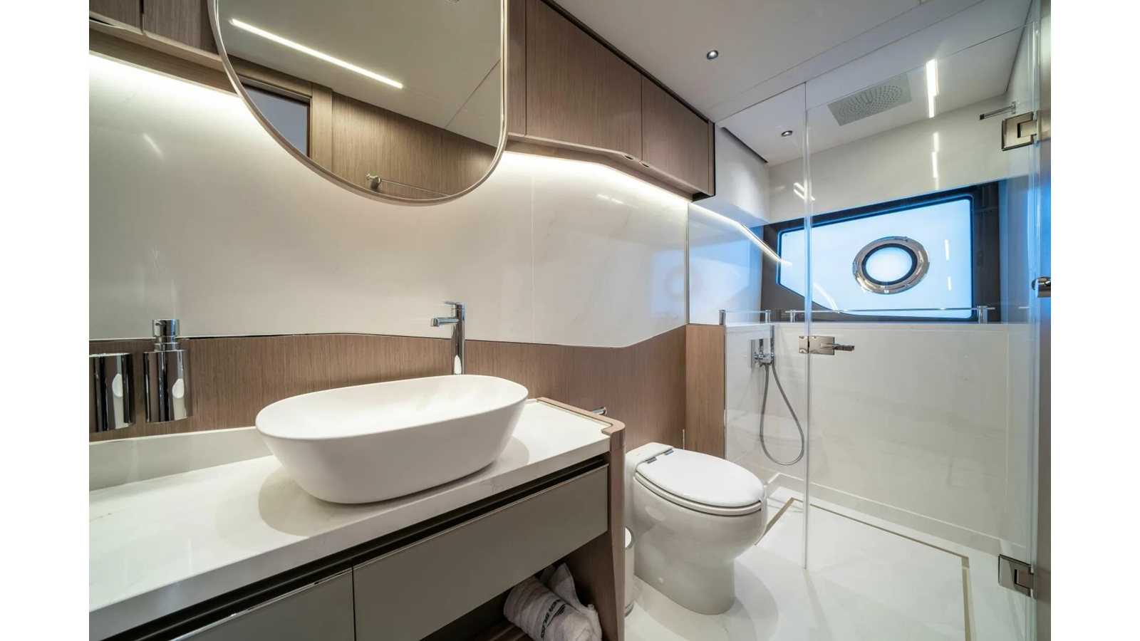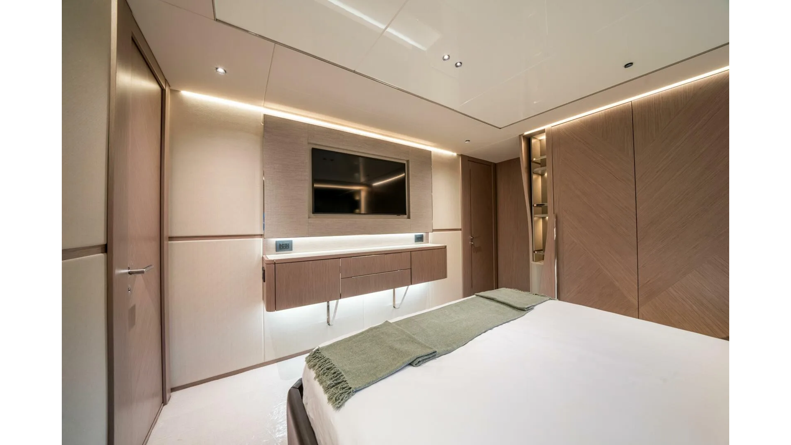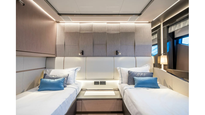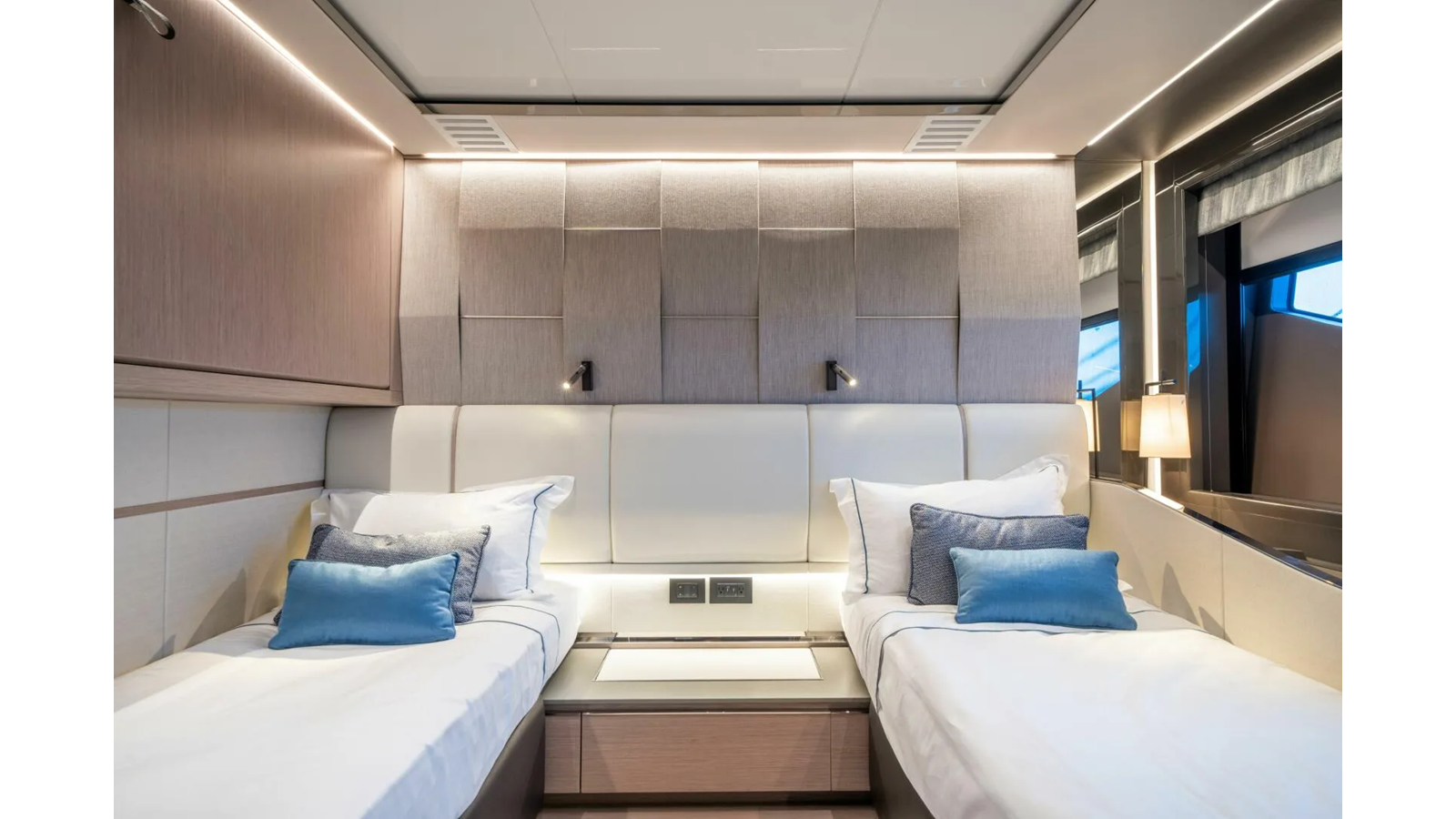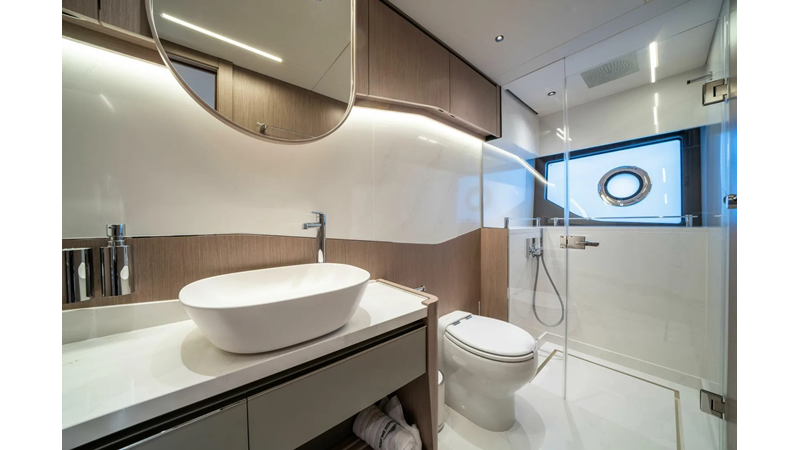 The unique main deck layout includes the Owner’s Stateroom forward for even greater flexibility and freedom on board. This full-beam stateroom offers a large lobby entrance, walk-in wardrobe with feature shelving, an office and generous en suite. Bathed in natural light courtesy of expansive panoramic glazing, owners can access a first-in-class bow terrace for ultimate privacy through a cleverly sculptured, fully-glazed sliding door forward. The crew cabin is also worthy of mention, featuring a Captainâs cabin with en suite, two twins each with en suite, a highly specified crew mess.