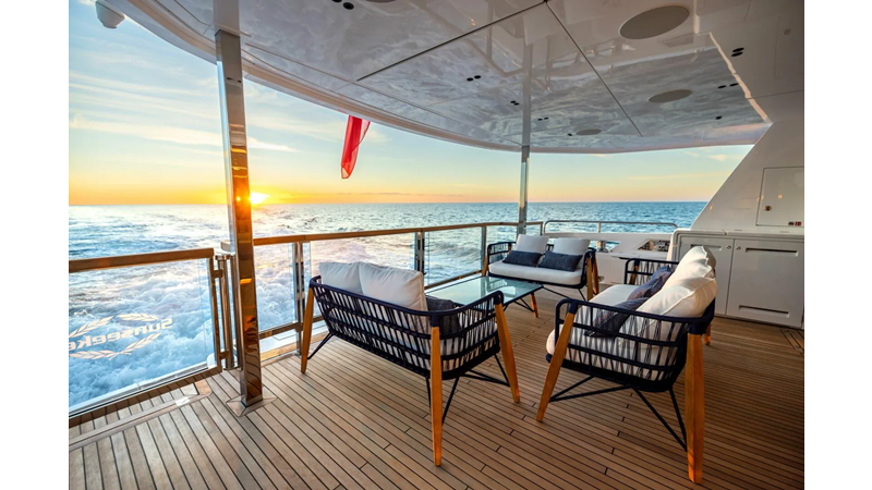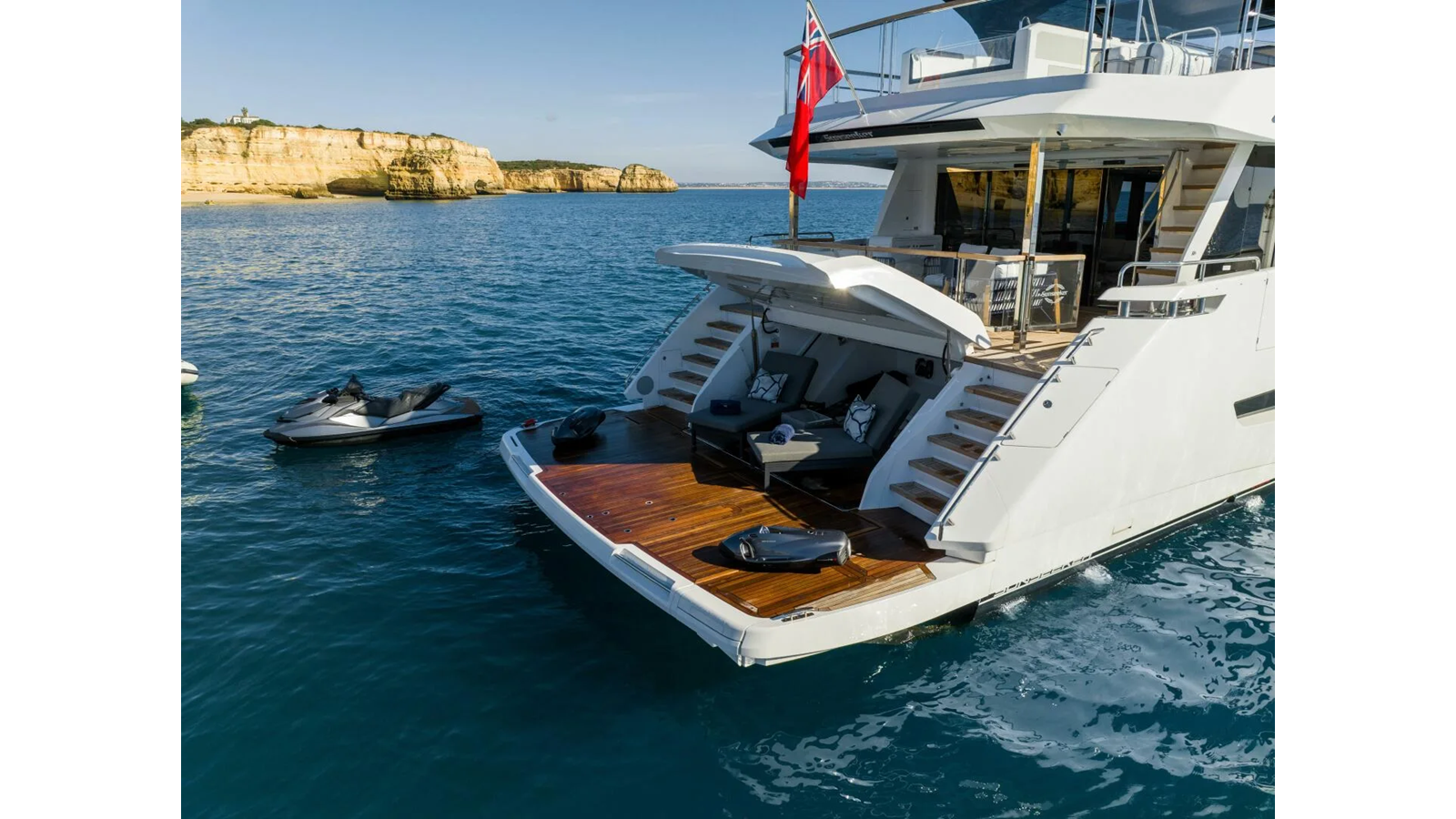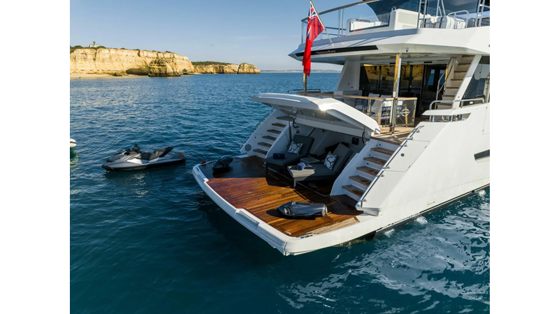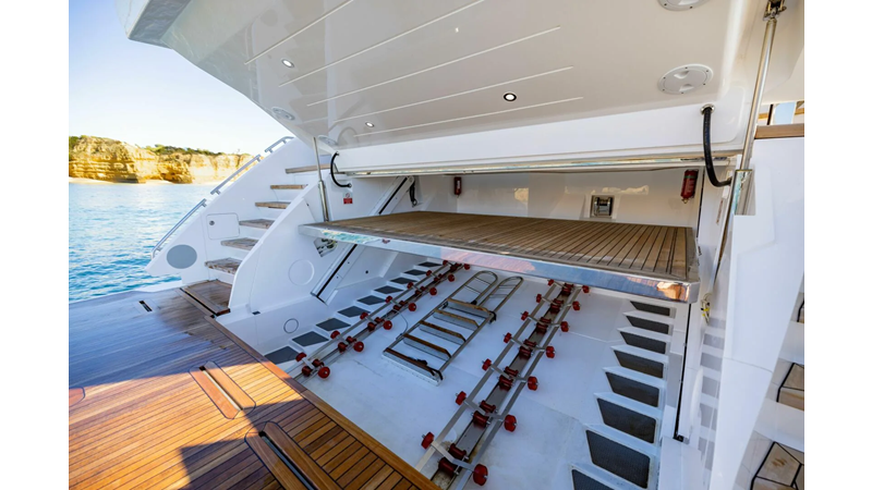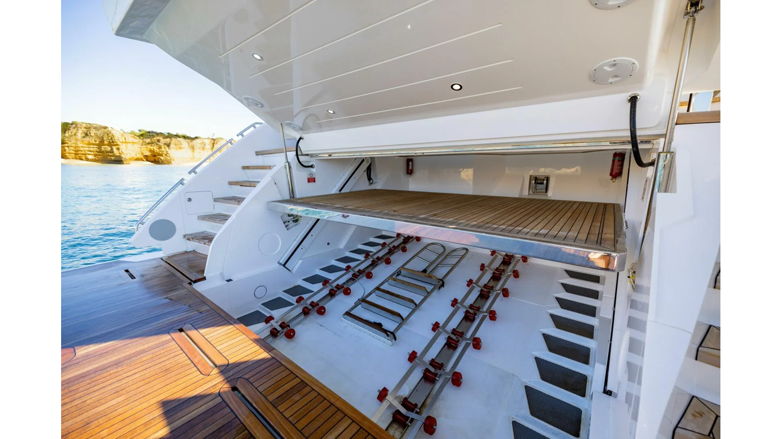 The revolutionary Sunseeker âBeach Clubâ provides an exceptional area to relax at water level. The tender garage can accommodate a Williams 460 Sportjet and GTX255 jet ski, with plentiful stowage for SeaBobs, diving equipment and paddleboards. The innovative X-TENDâą system offers several seating arrangements, facing aft in its lowered position or, at the flick of a switch, forward at cockpit level.