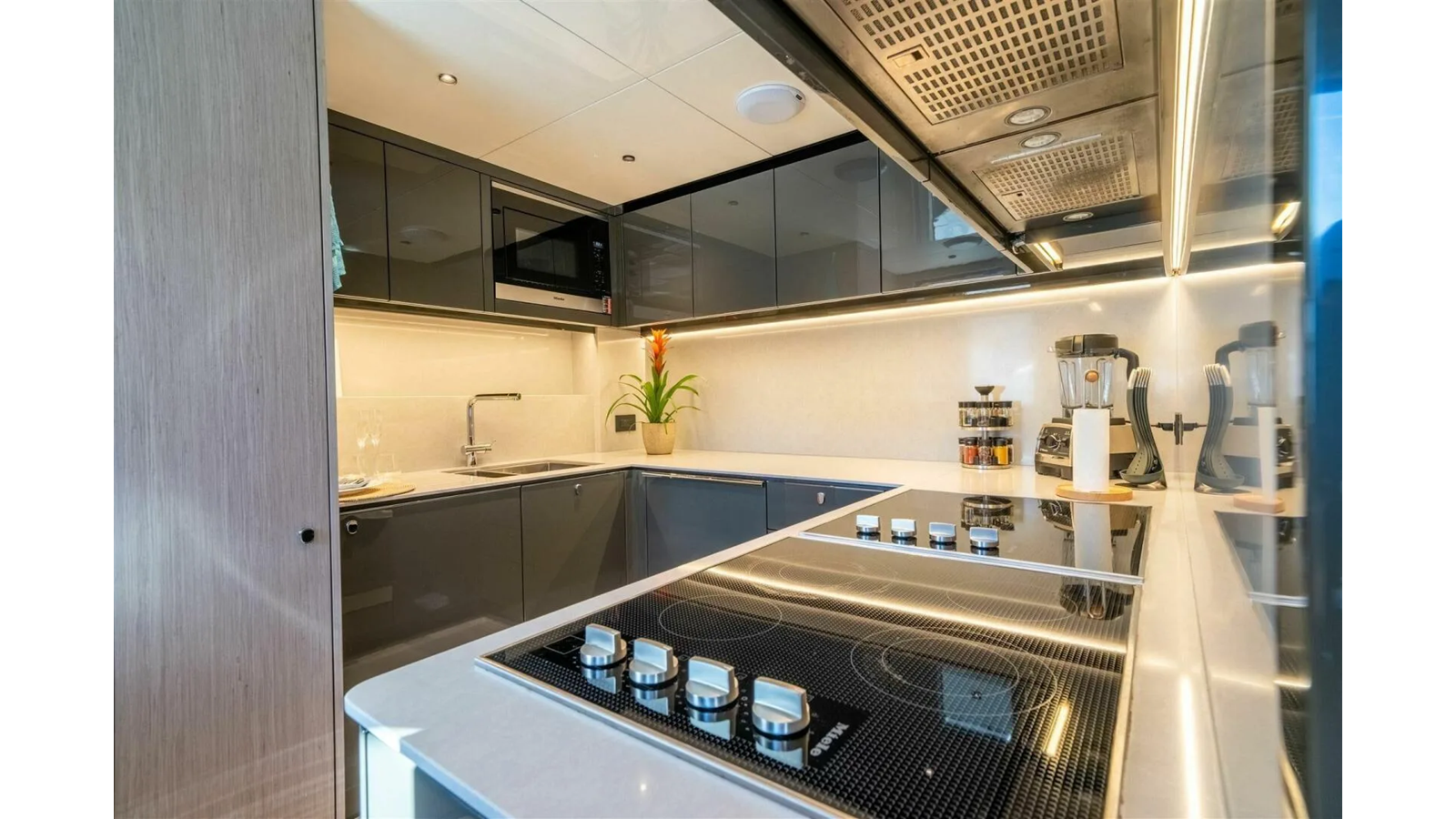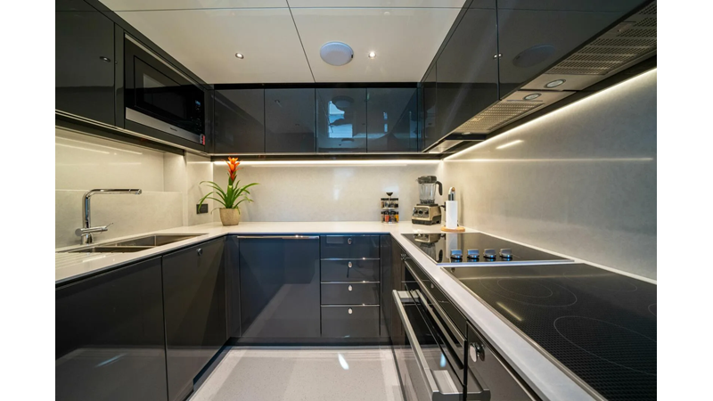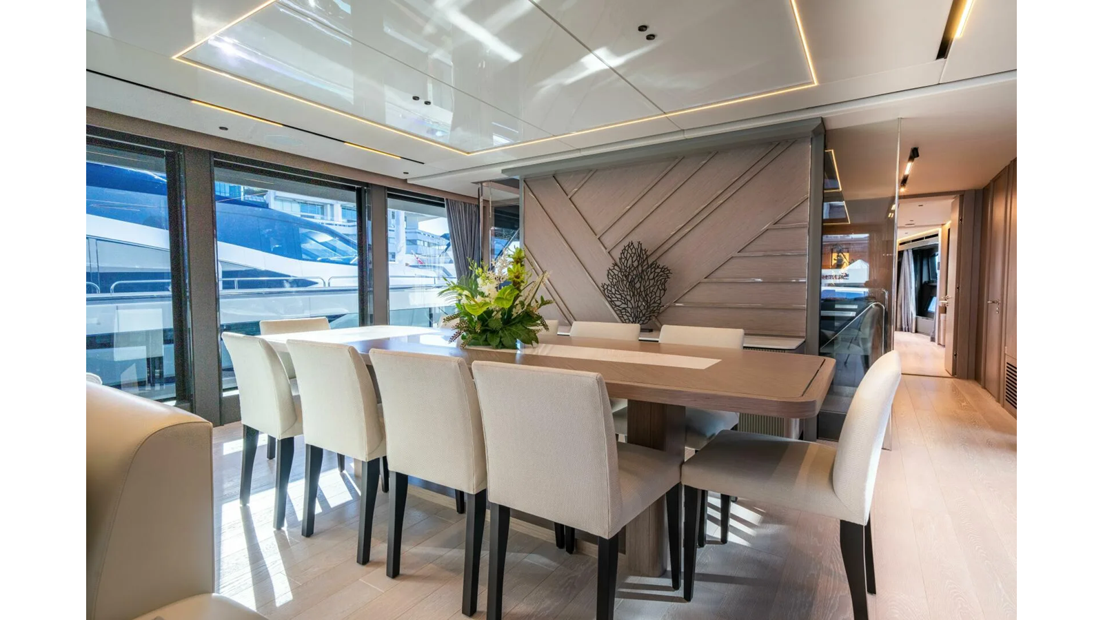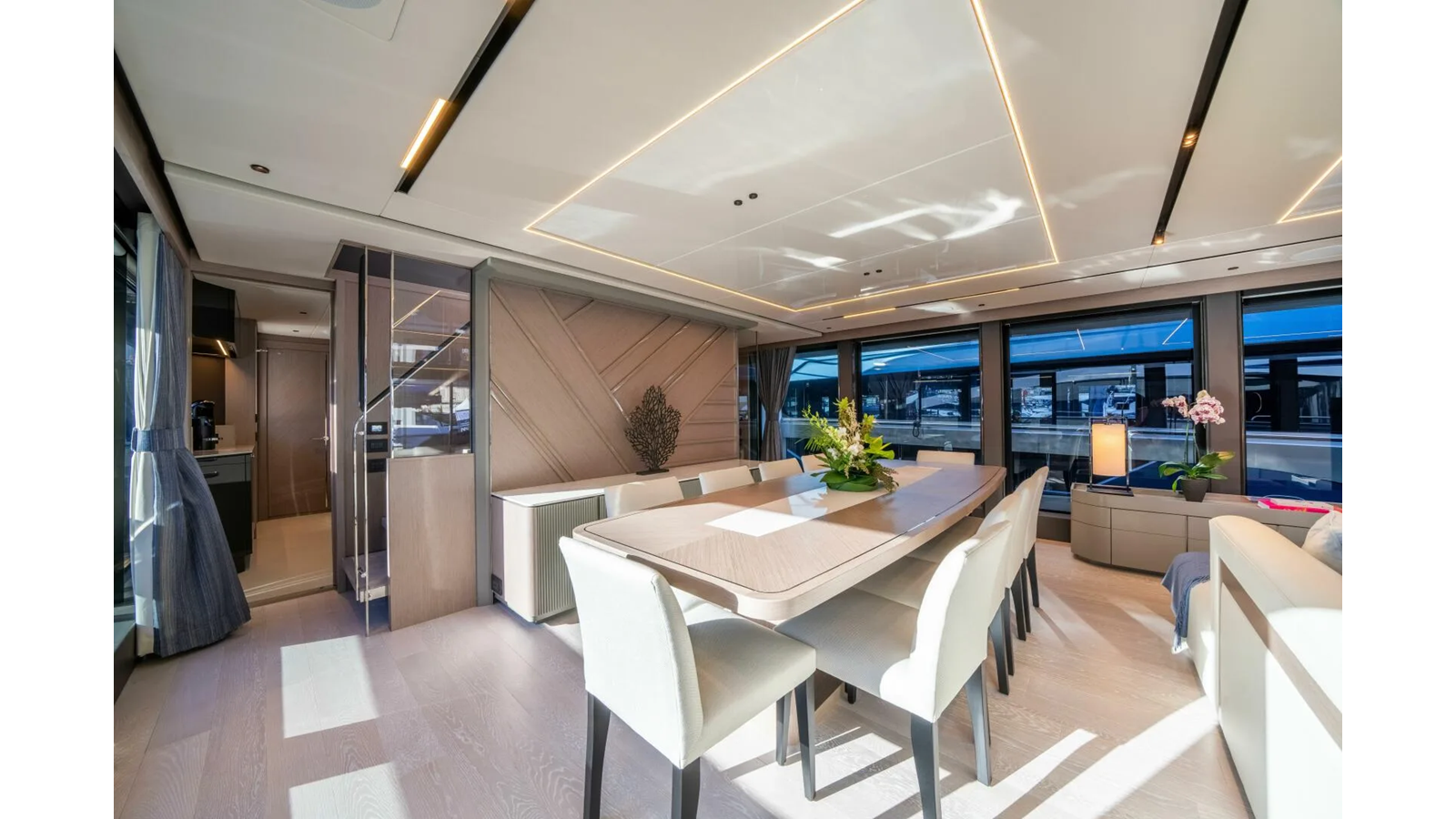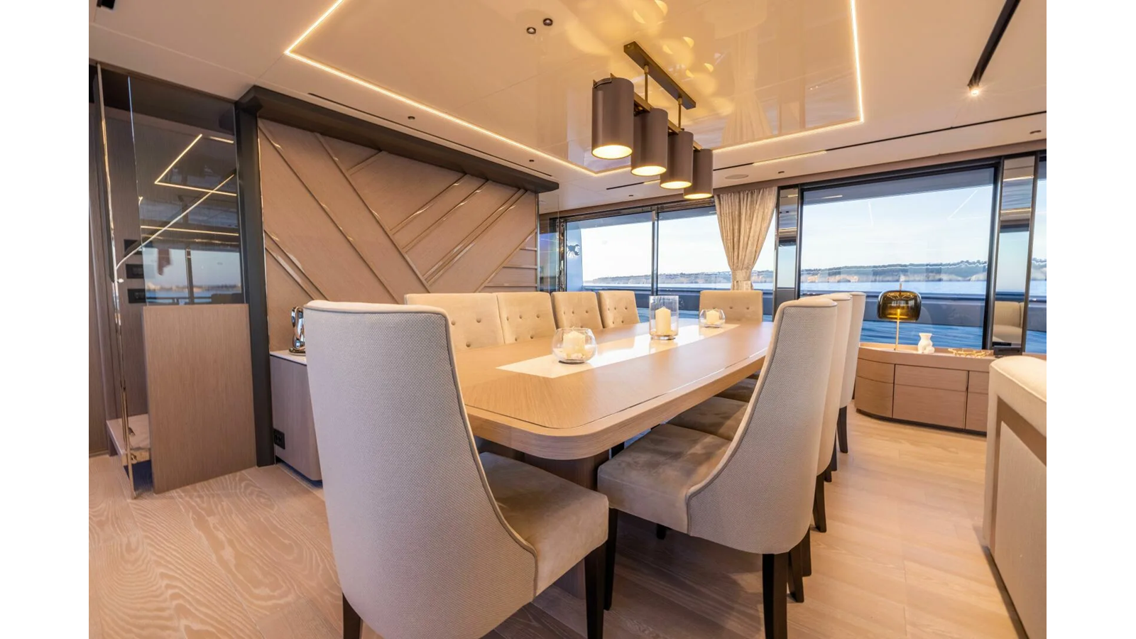 Its unique main deck, penthouse-style saloon and luxurious staterooms offer a new-found design direction and material selection providing elegant interiors to enchant any owner. The layering of textural elements and the mix of furnishings and fabrics feels timeless with a modern twist that exudes simplicity and sophistication. Floor-to-ceiling glazing floods the generous saloon with natural daylight, complemented by sliding doors to starboard, helping to bring the outdoors in. A stunning feature wall forward of the dining room showcases exposed and seemingly floating stair treads leading to the wheelhouse above on the port side and lower deck access to starboard. The large, fully equipped galley forward is concealed behind a feature bulkhead, and offers plentiful space and direct side deck access for crew.