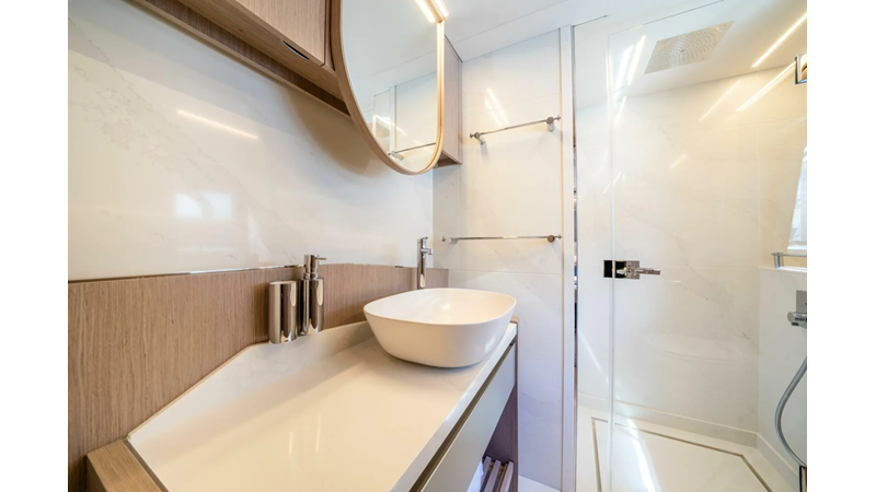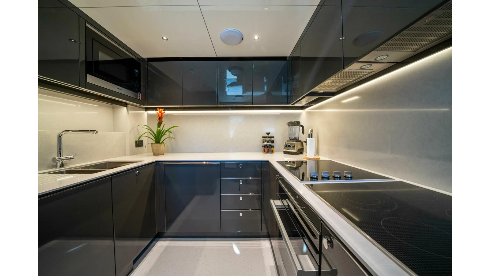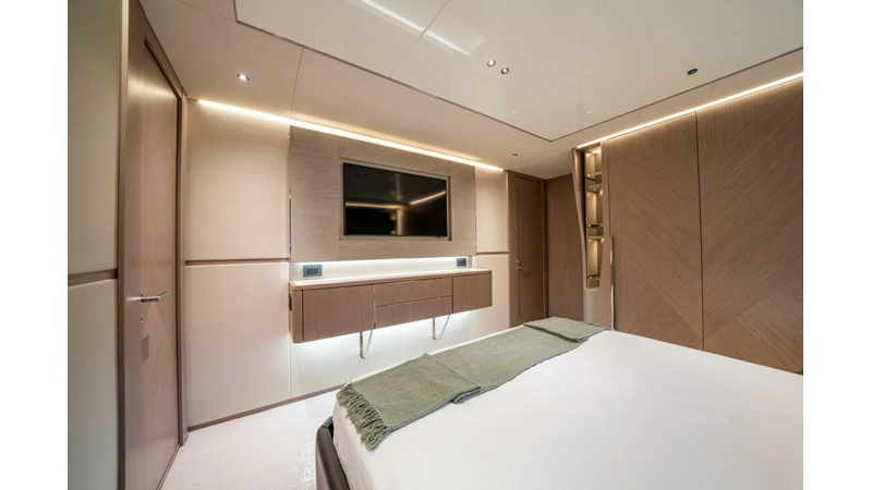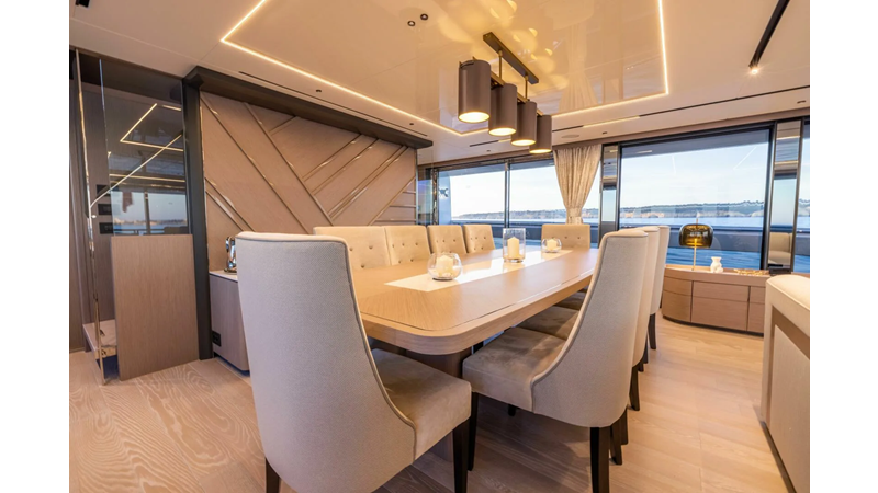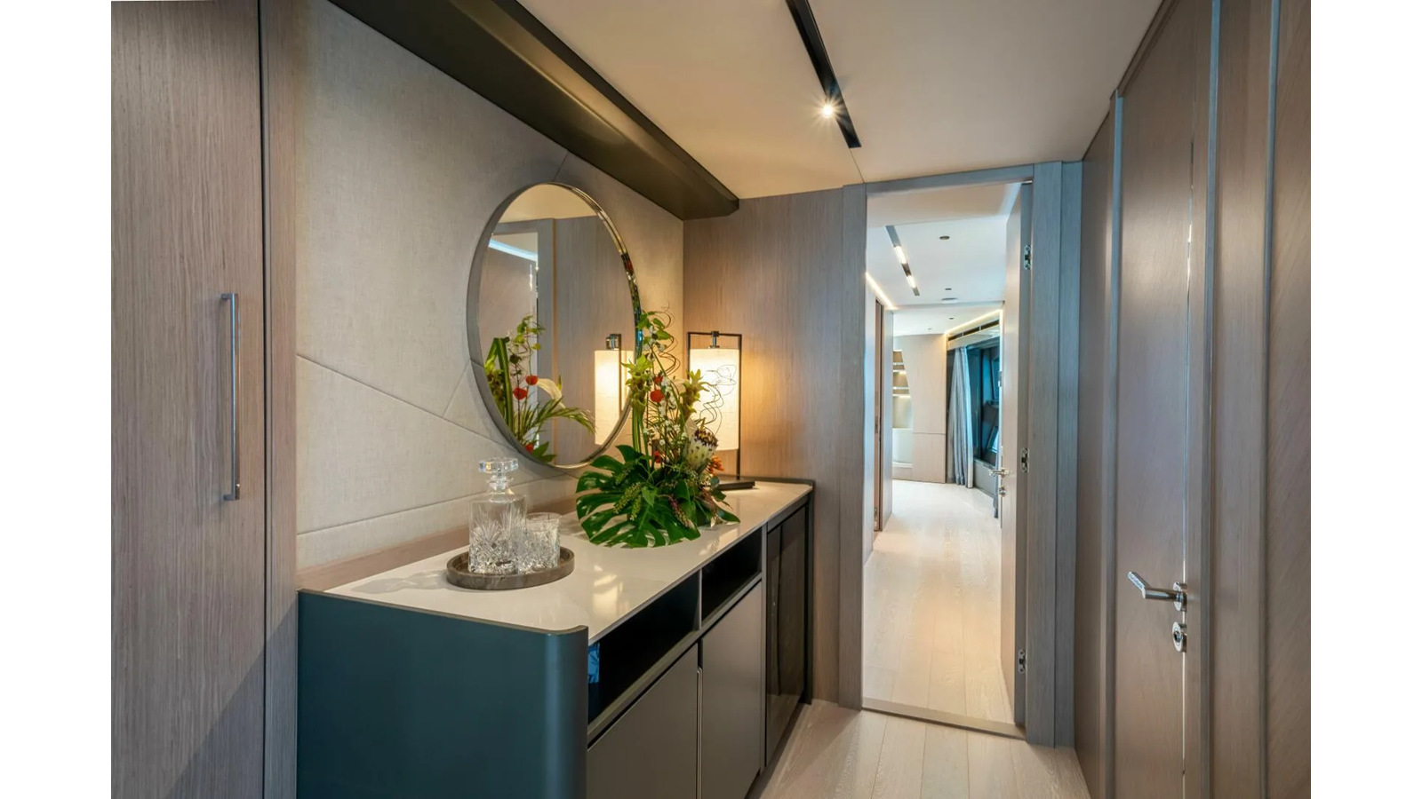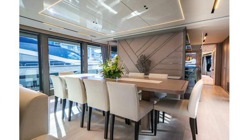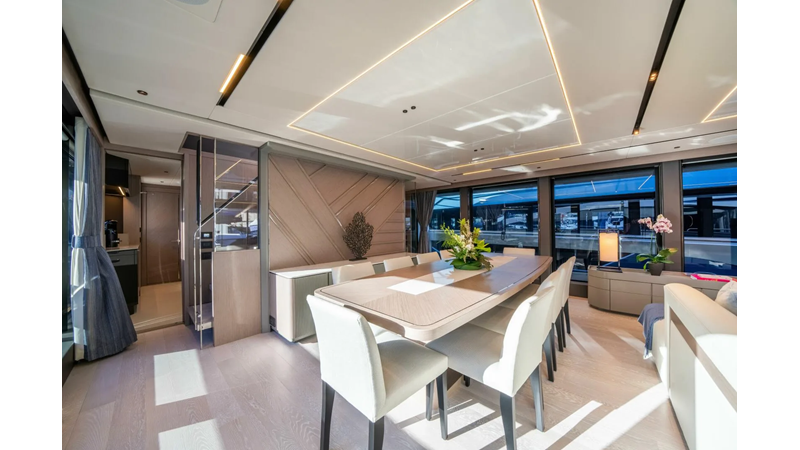 Its unique main deck, penthouse-style saloon and luxurious staterooms offer a new-found design direction and material selection providing elegant interiors to enchant any owner. The layering of textural elements and the mix of furnishings and fabrics feels timeless with a modern twist that exudes simplicity and sophistication. Floor-to-ceiling glazing floods the generous saloon with natural daylight, complemented by sliding doors to starboard, helping to bring the outdoors in. A stunning feature wall forward of the dining room showcases exposed and seemingly floating stair treads leading to the wheelhouse above on the port side and lower deck access to starboard. The large, fully equipped galley forward is concealed behind a feature bulkhead, and offers plentiful space and direct side deck access for crew.