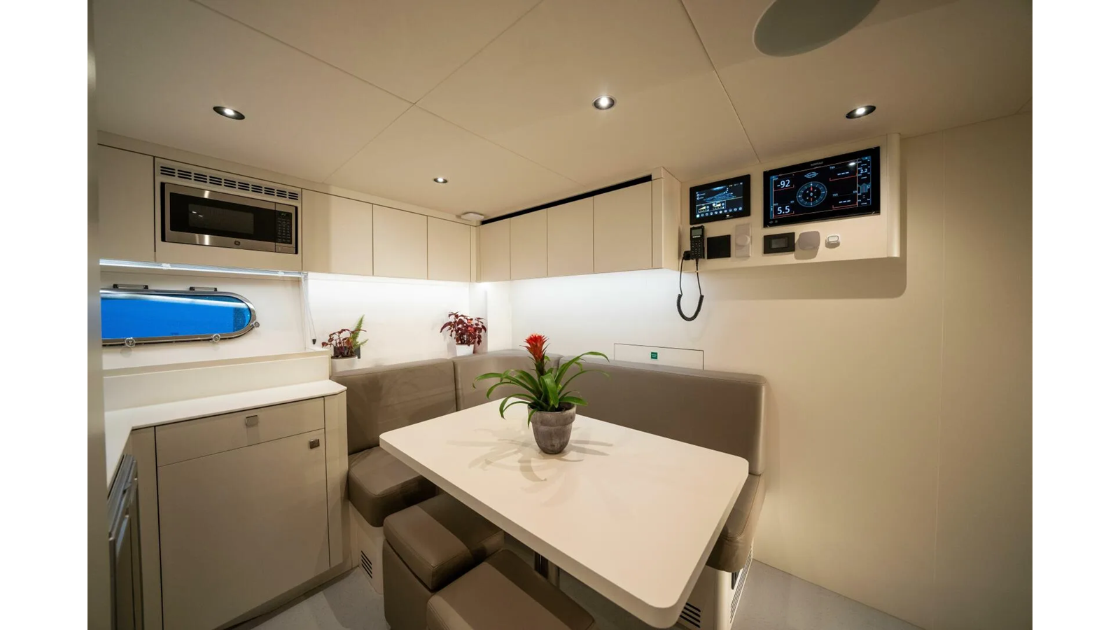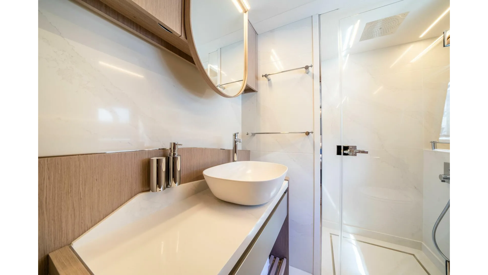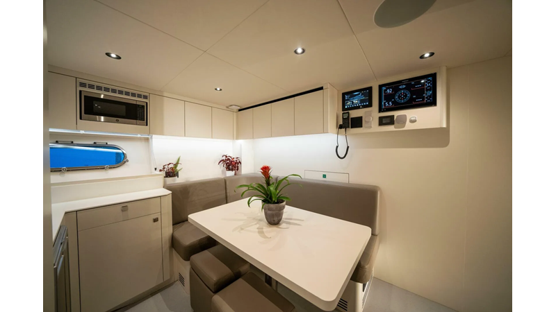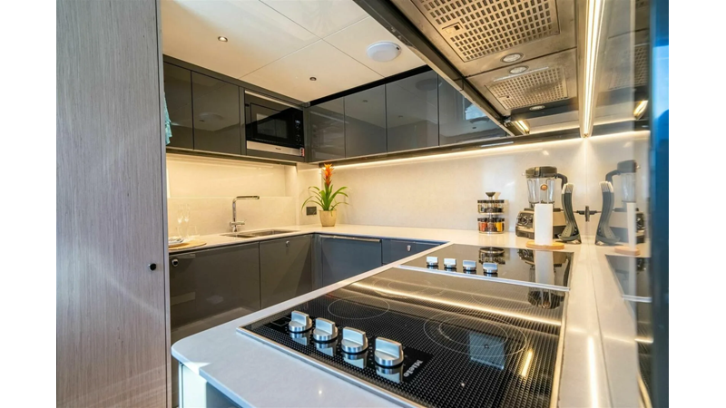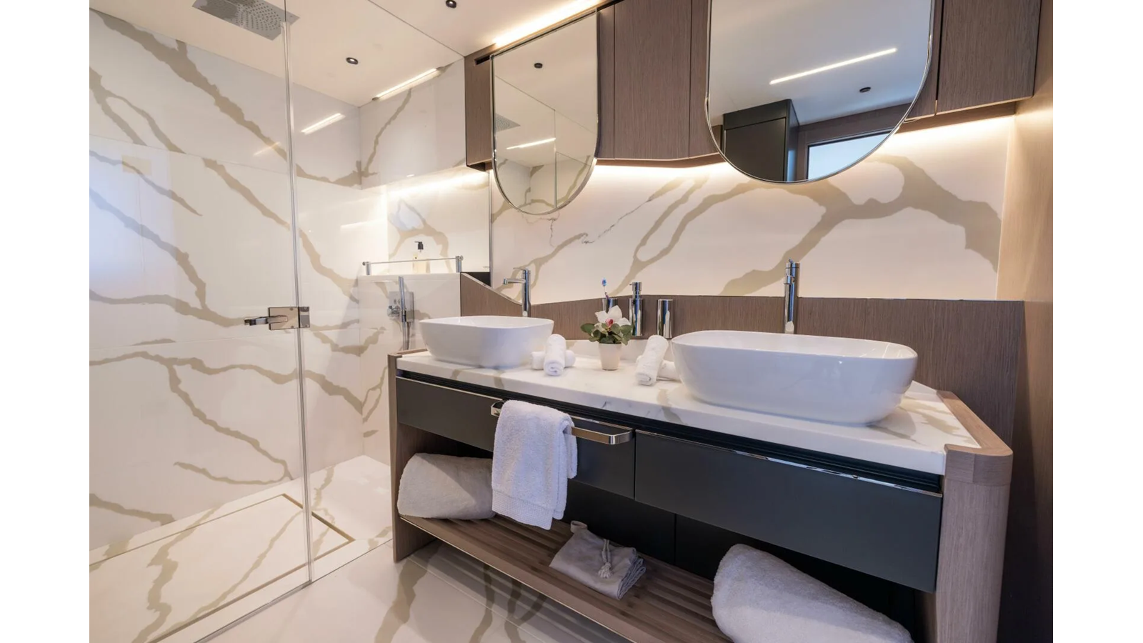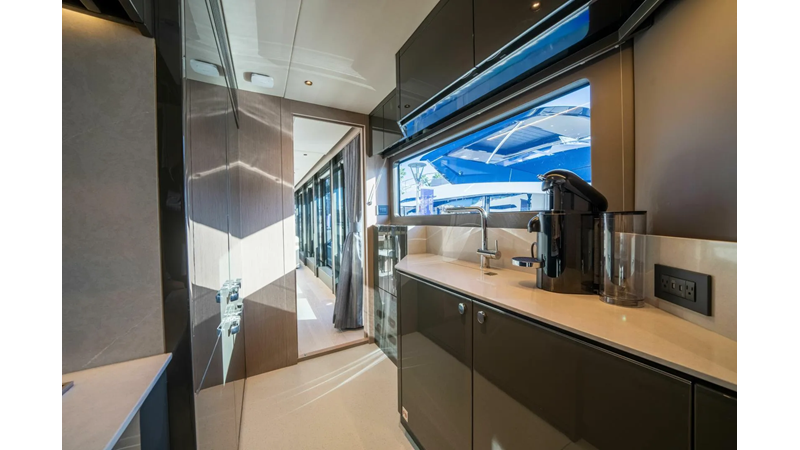 Its unique main deck, penthouse-style saloon and luxurious staterooms offer a new-found design direction and material selection providing elegant interiors to enchant any owner. The layering of textural elements and the mix of furnishings and fabrics feels timeless with a modern twist that exudes simplicity and sophistication. Floor-to-ceiling glazing floods the generous saloon with natural daylight, complemented by sliding doors to starboard, helping to bring the outdoors in. A stunning feature wall forward of the dining room showcases exposed and seemingly floating stair treads leading to the wheelhouse above on the port side and lower deck access to starboard. The large, fully equipped galley forward is concealed behind a feature bulkhead, and offers plentiful space and direct side deck access for crew.