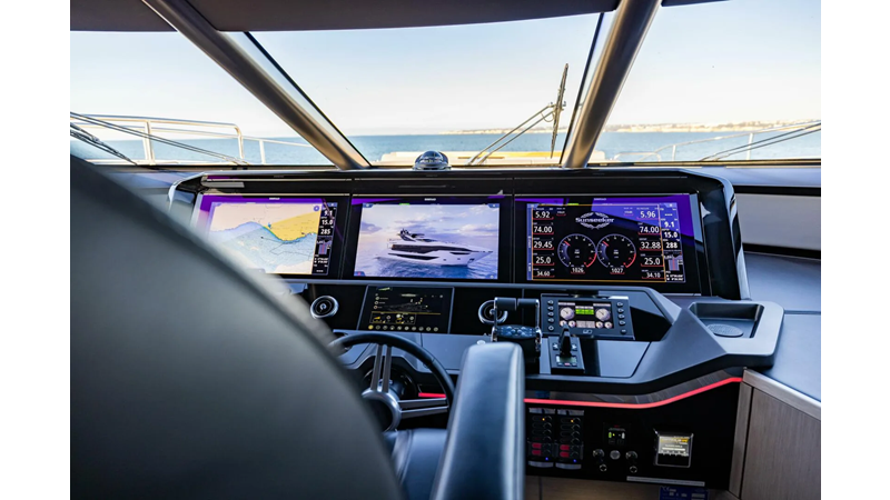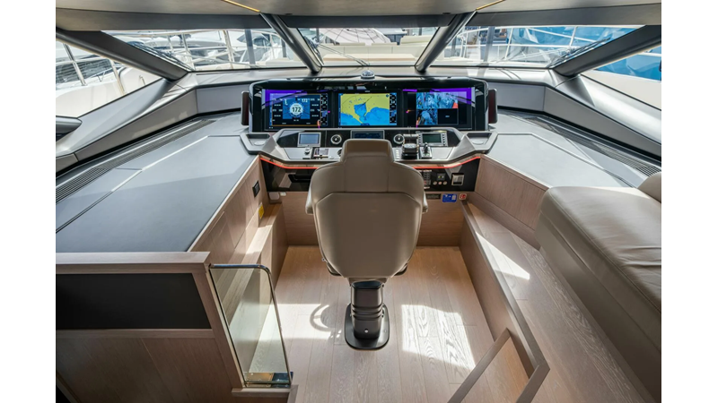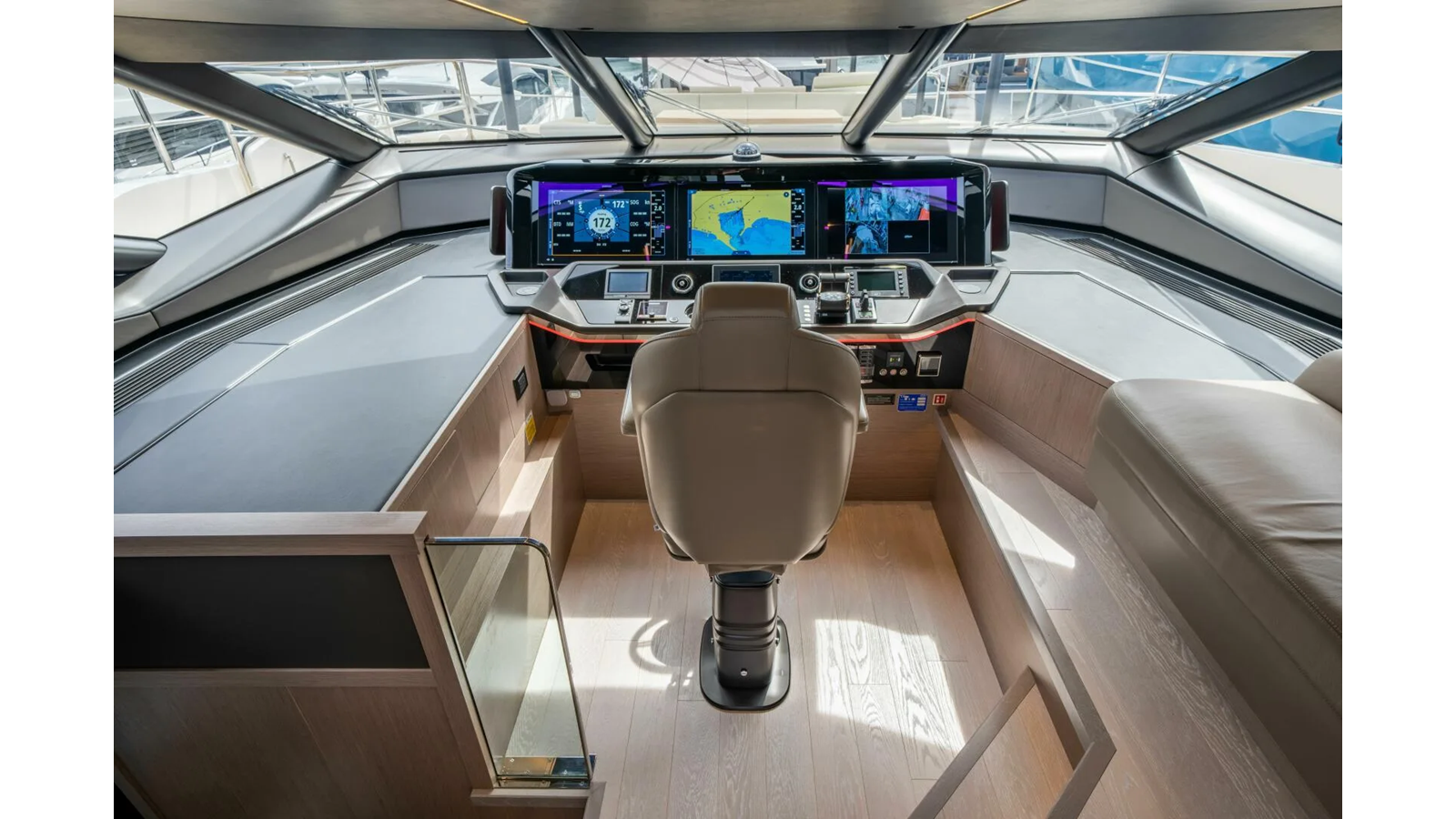 The vast flybridge on board the 100 Yacht flows seamlessly into the foredeck with uninterrupted walk-around access on both sides. The foredeck provides a social space with two separate seating arrangements plus an oversized sunpad. The essential raised pilot house, central to this yachtâs innovative design, incorporates a glazed sliding door aft, allowing uninterrupted views forward from the flybridge.