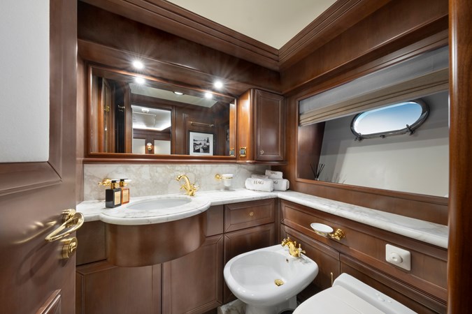 The upper deck provides a TV lounge and ample seating and lying areas on deep sofas. On deck features include a sundeck Jacuzzi – next to a set of free weights! Al fresco dining is enjoyed on the aft deck, well protected under the substantial overhang.