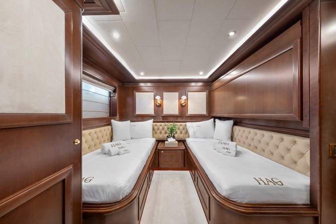 M /Y HAG, the tri-deck Navetta 30 model, finished with a navy blue hull and white superstructure, is a timeless design by Zuccon International Project. Delivered by the Italian yard in 2007 she was upgraded in 2023 and EXTENSIVELY refitted in 2025.