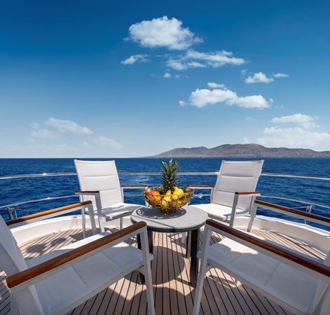 The 189GT yacht’s top speed is 15 knots and cruising speed is 12 knots under twin 1,360hp MAN diesels. Range at 10 knots is 1,500 nautical miles.