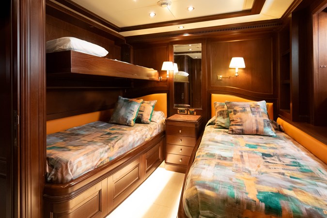 Her four-cabin layout sleeps up to 10 guests, with a spacious master cabin on the main deck, a VIP stateroom, one double cabin and one twin cabin.