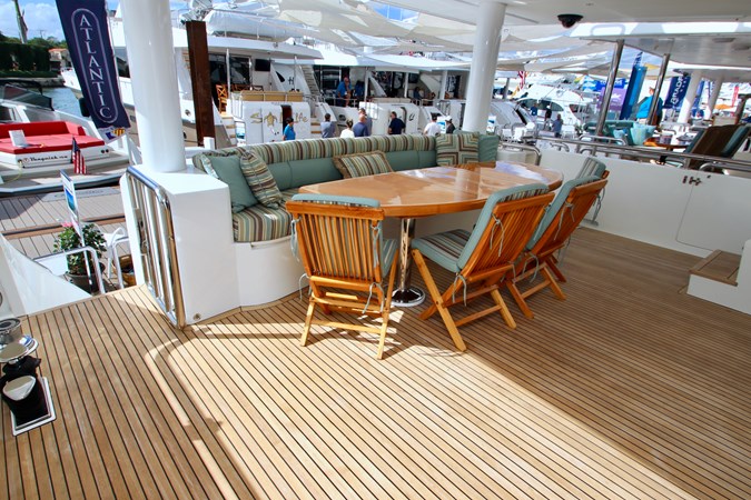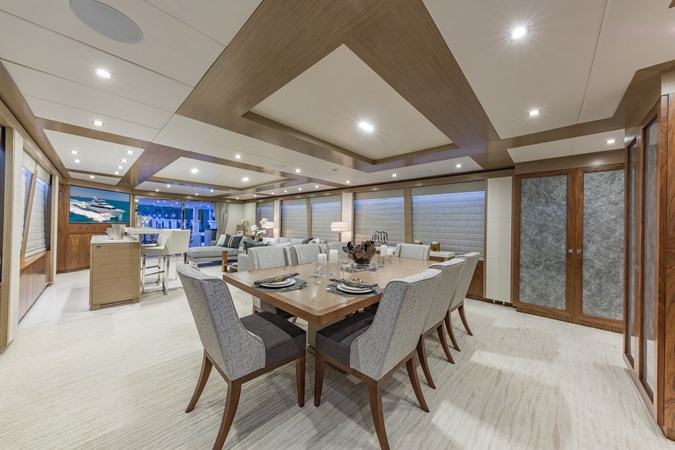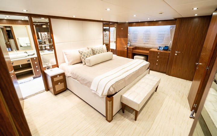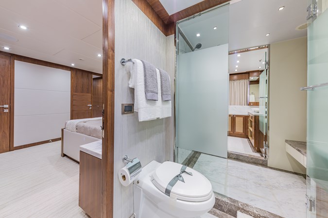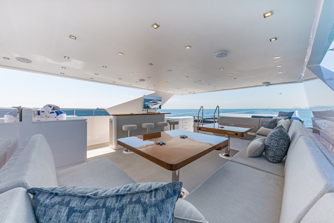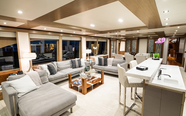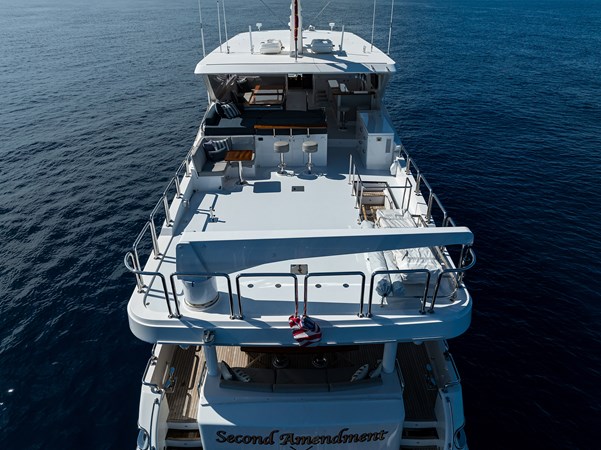Upon touring Second Amendment , most people immediately notice how much larger the key living areas feel when compared to many European designs in this class. The guest accommodations are more generous, the bathrooms more substantial, the main salon and dining spaces more open, and the upper deck especially well suited for entertaining. This is a yacht built for the way owners actually use their boats, and hosting 50 or more guests for cocktails is very much within her comfort zone.