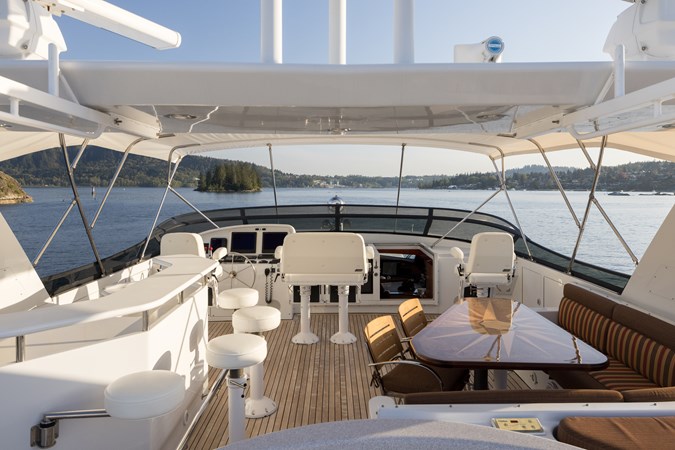 Well-equipped Flybridge complete with Jacuzzi, wet bar, refrigerator, ice maker, barbecue, and dining space