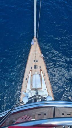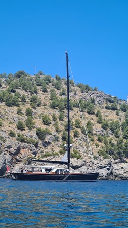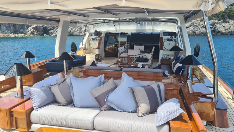 Spanning 32 meters, this elegant sloop features a distinctive retro aesthetic, highlighted by a beautifully varnished wooden base encircling the deckhouse and aft seating area. The traditional bow and gracefully raised stern evoke classic yachting elegance, while the yacht’s expansive 60-square meter aft deck sets her apart from others in her class. This vast outdoor space, reminiscent of what one might find on a much larger yacht, is thoughtfully designed for relaxation, dining, and social gatherings, allowing guests to fully immerse themselves in open-air luxury and panoramic sea views.