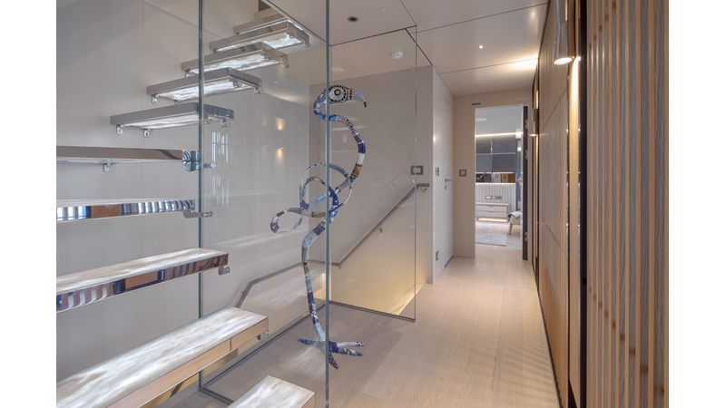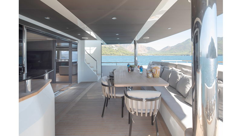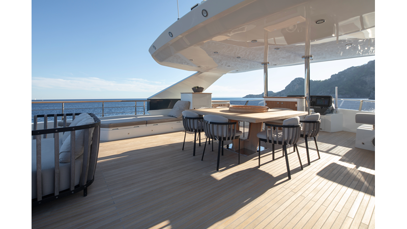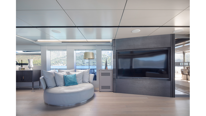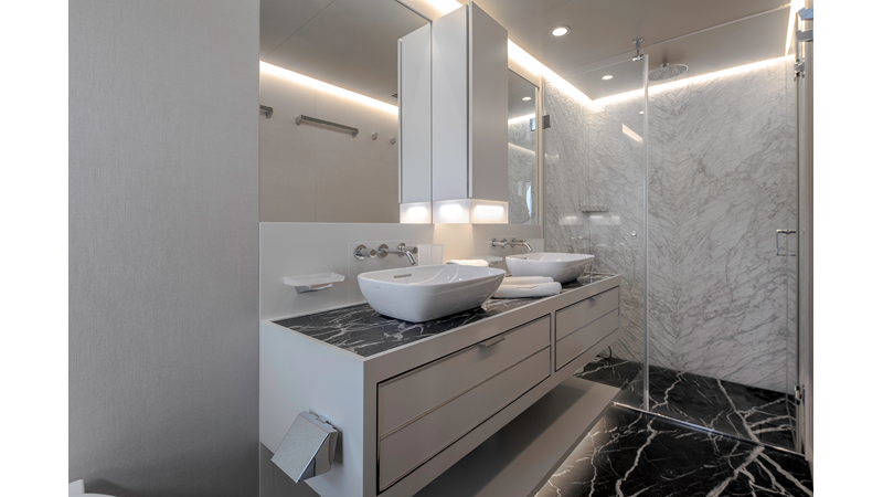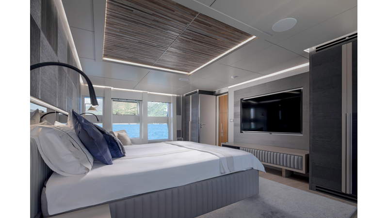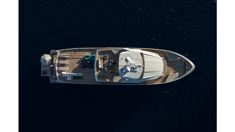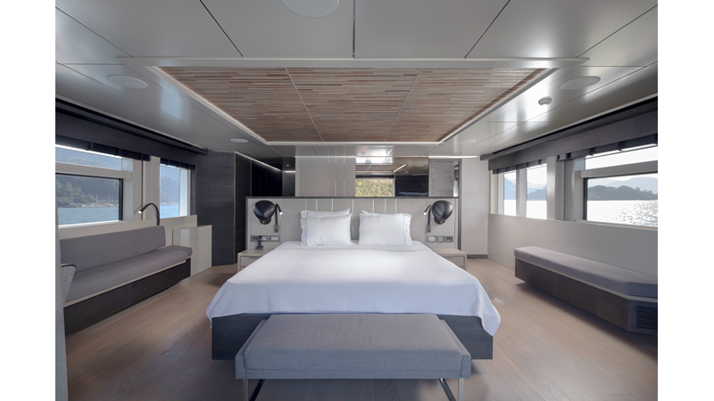 Her bold lines are highlighted by a plumb bow painted in a striking ghost gray, forward raked windows, and large glass windows. Equally stunning as she is capable, QM has a 4,000nm range & can carry a best-in-class number of tenders & toys on deck thanks to her 3 ton davit on the boat deck.