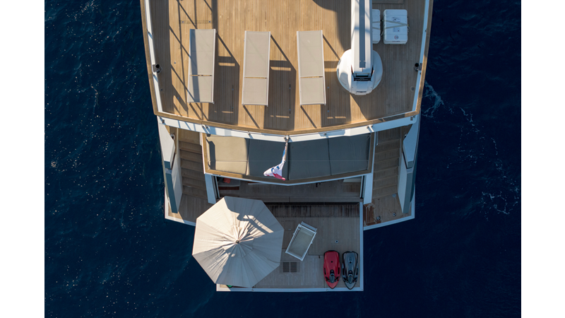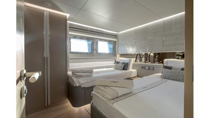 She was custom ordered by the owner and features a stunning, family friendly interior decor by Esra Kasmirci that features warm earth tones throughout. To encourage large family gathering, her layout consists of 6 cabins that sleep 12 guests including a private owners deck on the upper level, a main deck VIP that could double as a second master, and 4 additional cabins on the lower deck.