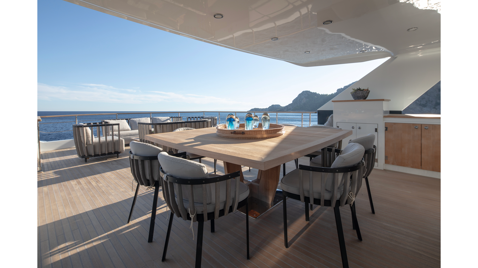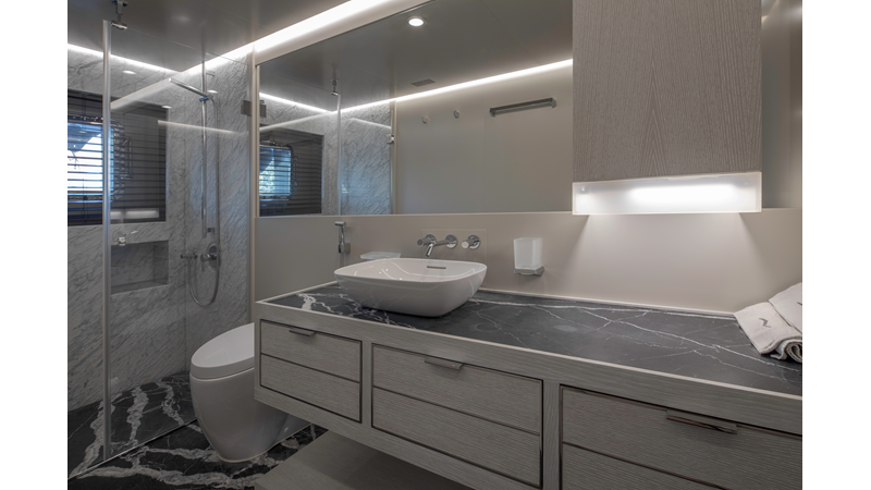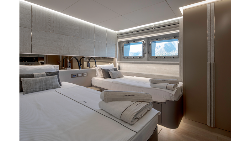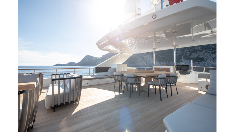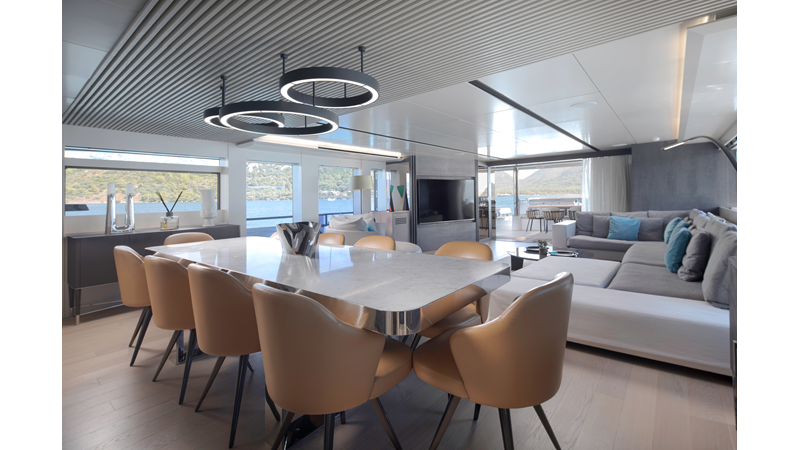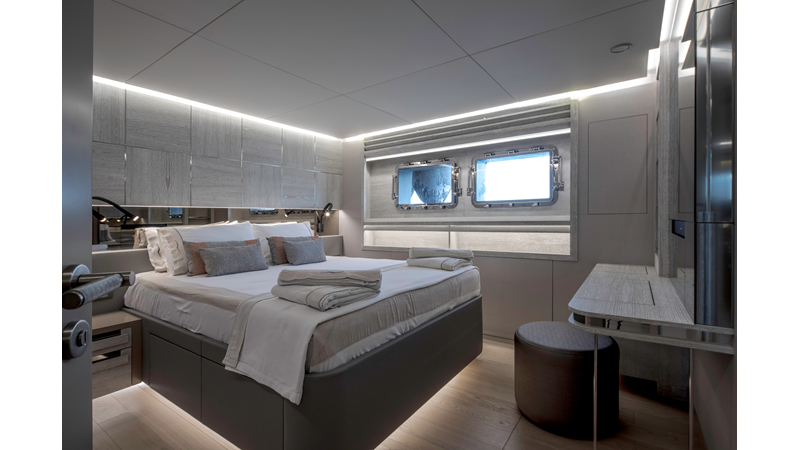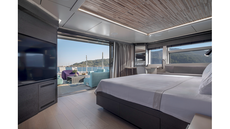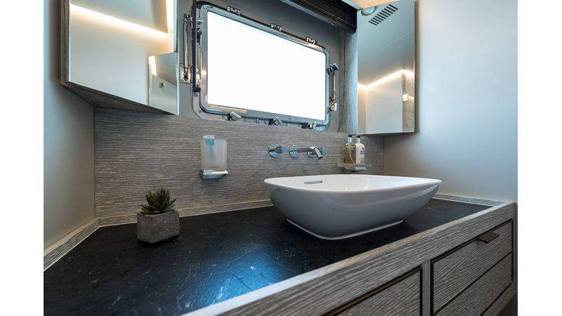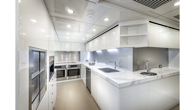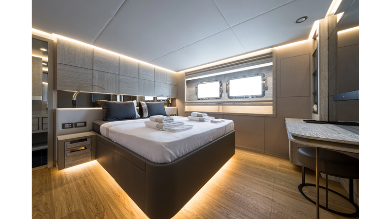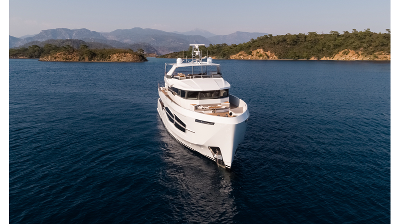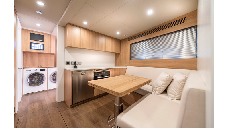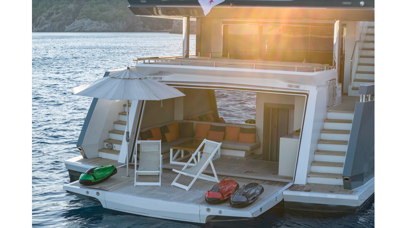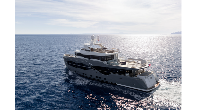 Opacmare Transformer IMO Tier III engines are an option and are essentially becoming required for new build deliveries in 2024 and later due to new EPA requirements. Her large open upper deck features a massive 2,500kg davit allowing you to carry up to a 8.5m tender plus additional water sports toys. (Hull #2 carries a 28ft Axopar on deck). A new layout created for North American clients features a country kitchen forward on the main deck allowing a more casual gathering place for guests and crew for meals.