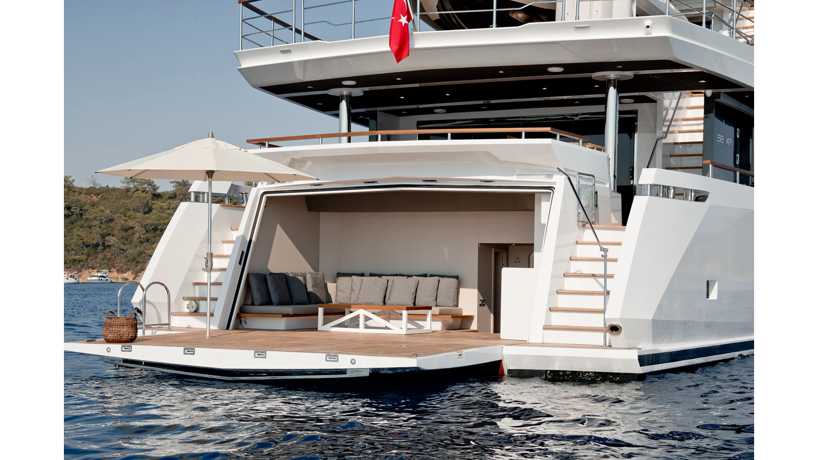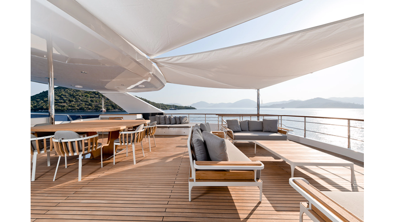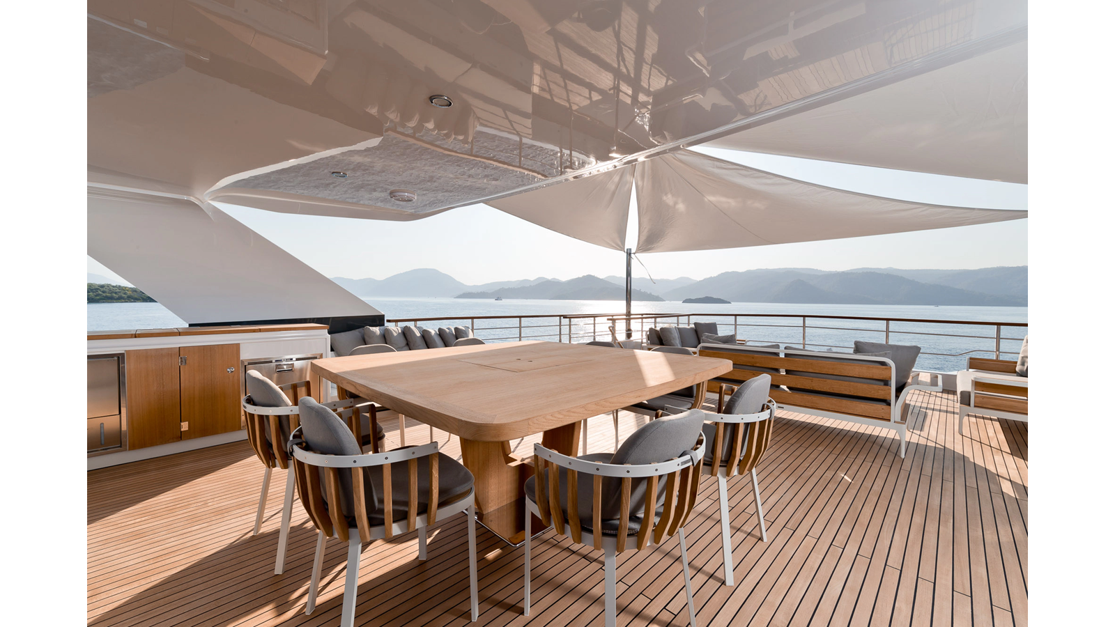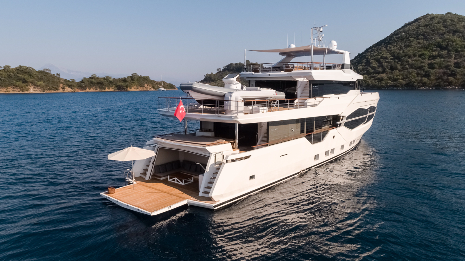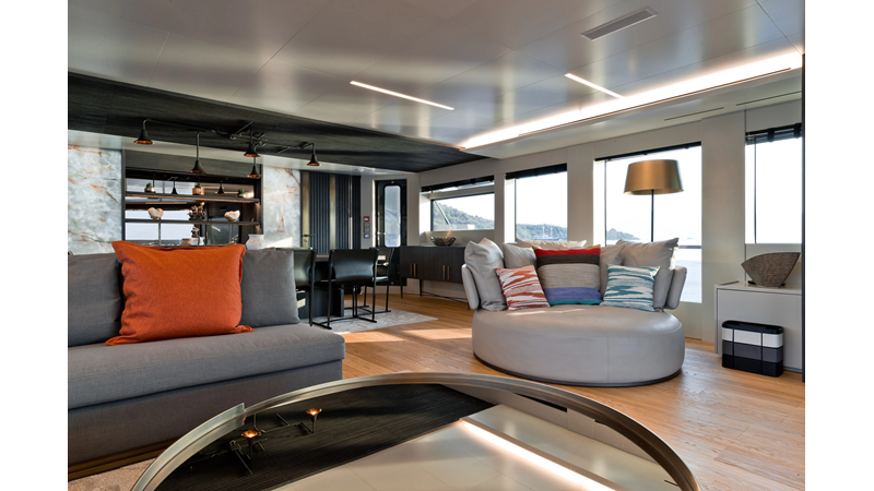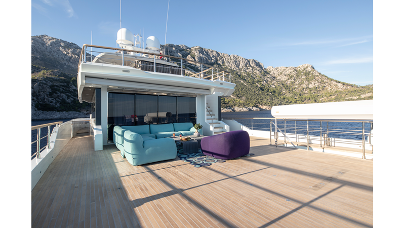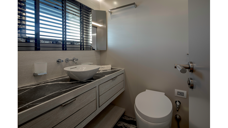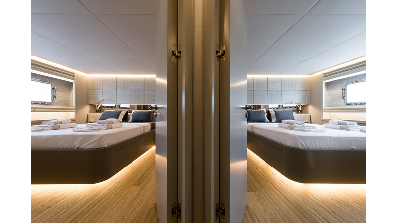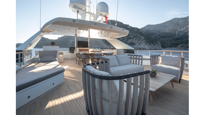 Opacmare Transformer IMO Tier III engines are an option and are essentially becoming required for new build deliveries in 2024 and later due to new EPA requirements. Her large open upper deck features a massive 2,500kg davit allowing you to carry up to a 8.5m tender plus additional water sports toys. (Hull #2 carries a 28ft Axopar on deck). A new layout created for North American clients features a country kitchen forward on the main deck allowing a more casual gathering place for guests and crew for meals.