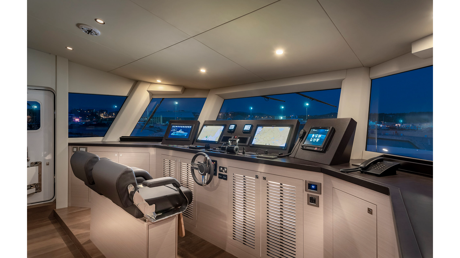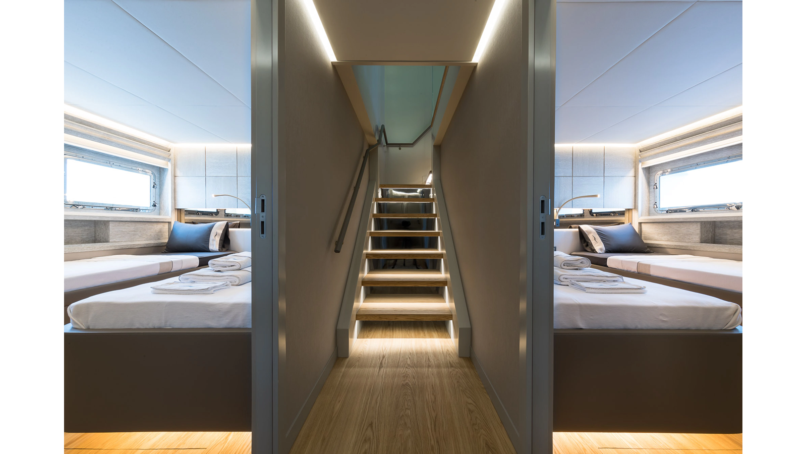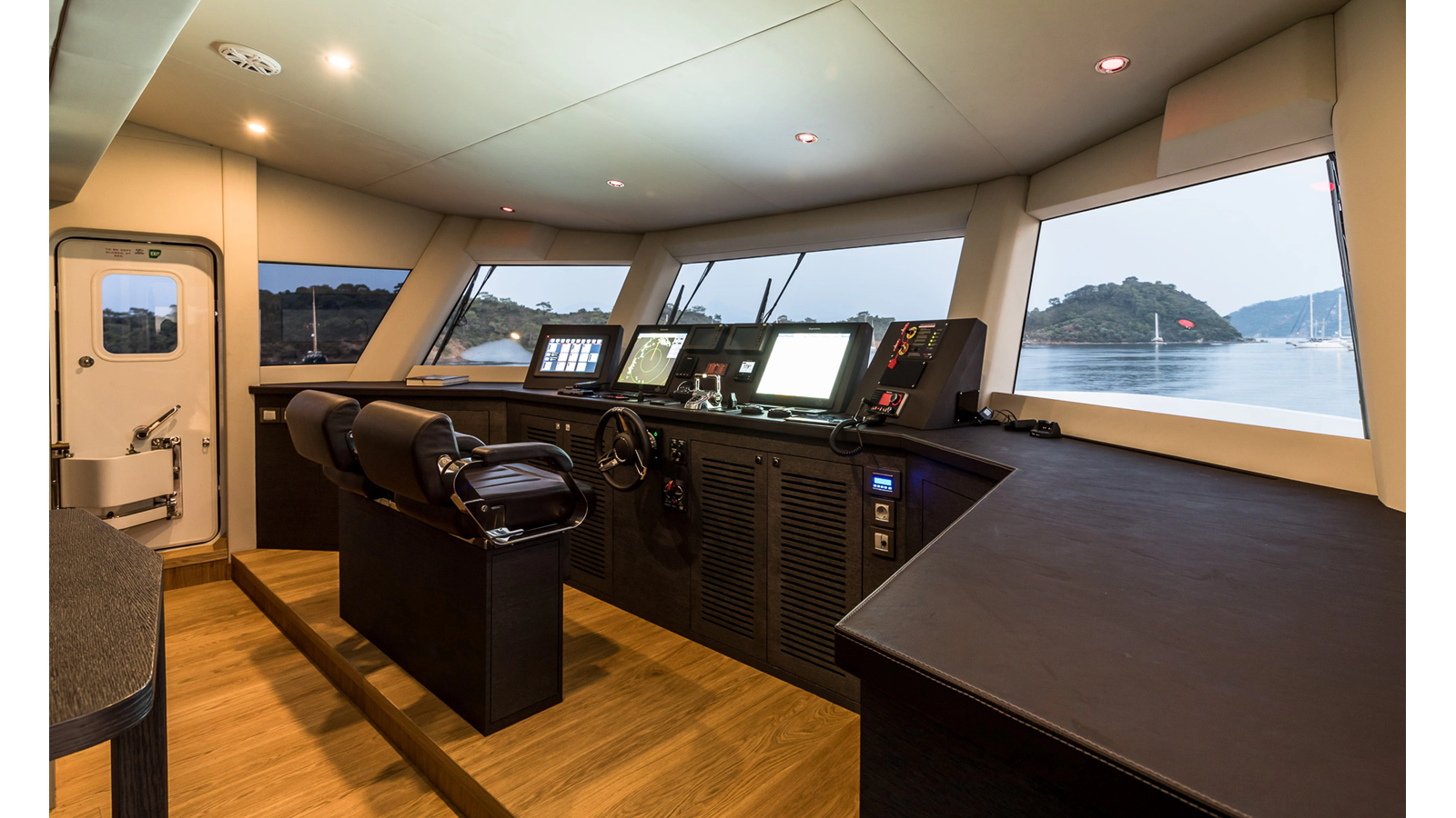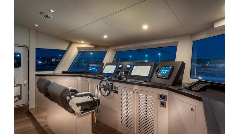 New Construction – Steel Hull/Full Displacement – 4,500nm Range – 5 or 6 cabin layouts available. 6 cabin layout includes a private owners deck on the upper level where the sky lounge is typically located as featured on Hull #4. The 5 cabin layout has the more traditional layout with the master forward on the main deck, 4 additional cabins located on the lower deck & a skylounge.