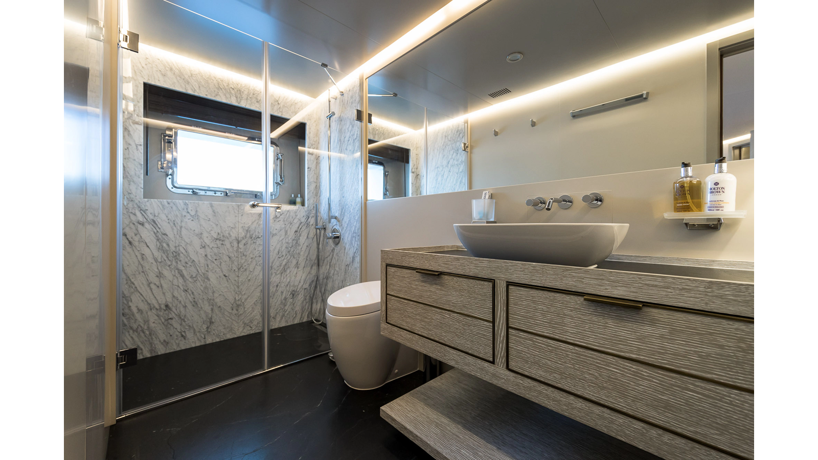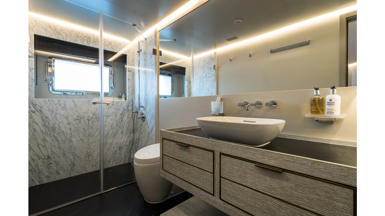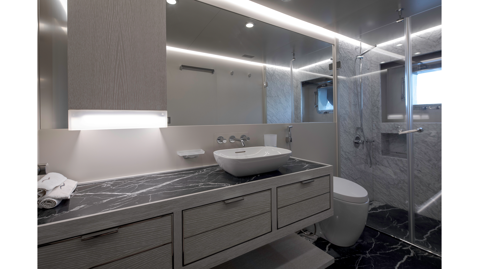 New Construction – Steel Hull/Full Displacement – 4,500nm Range – 5 or 6 cabin layouts available. 6 cabin layout includes a private owners deck on the upper level where the sky lounge is typically located as featured on Hull #4. The 5 cabin layout has the more traditional layout with the master forward on the main deck, 4 additional cabins located on the lower deck & a skylounge.