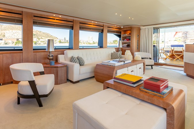 The main salon is a luxurious space with seating areas and a bar. The layout includes a separate dining galley and the primary helm station at the front. Below deck, the yacht features four stylish cabins, each with an en-suite bathroom, designed for utmost privacy and comfort. The configuration includes a full-beam master suite, two twin cabins, and a twin cabin with an additional Pullman bed on the starboard side.