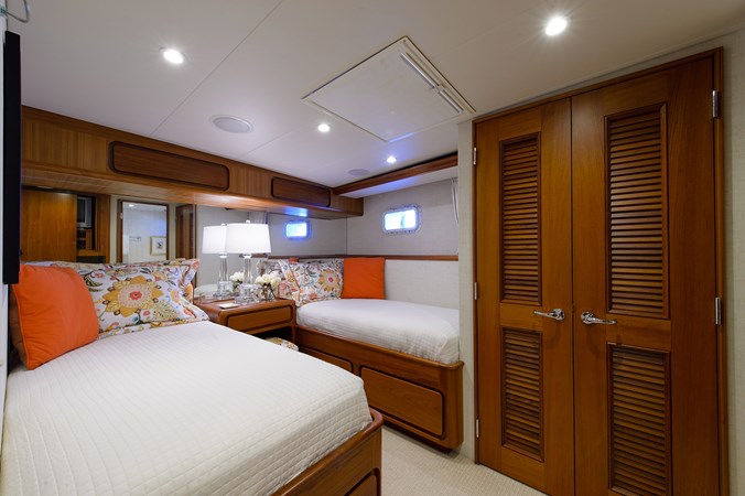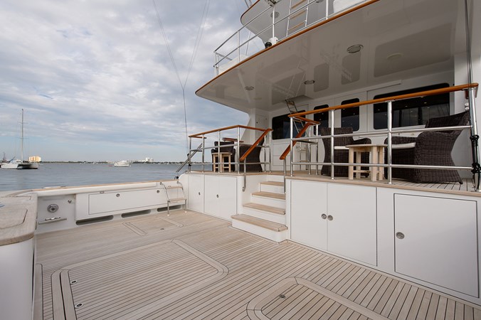 Built to ABS standards, her sleek interior was substantially updated in 2014 and boasts satin-finished teak, wraparound windows, a wet bar, and an entertainment center in the spacious main salon. Forward of the salon is a dining area with seating for six guests. In 2019 her current owner completed further updates and upgrades.