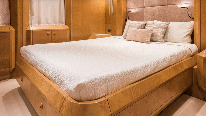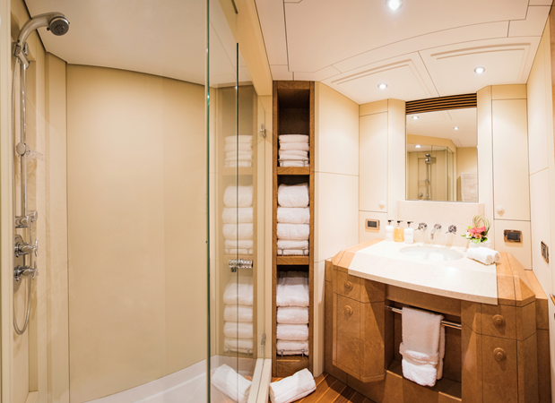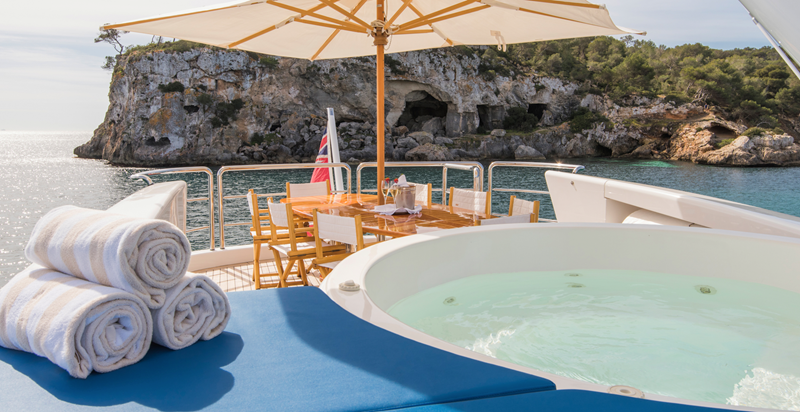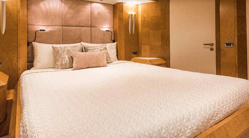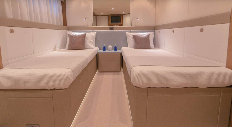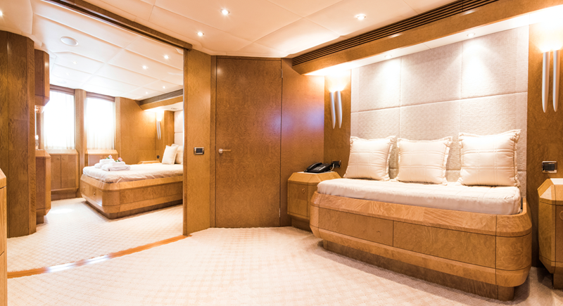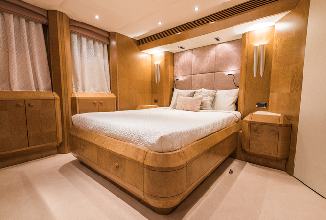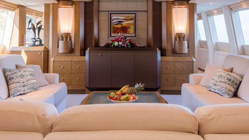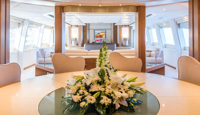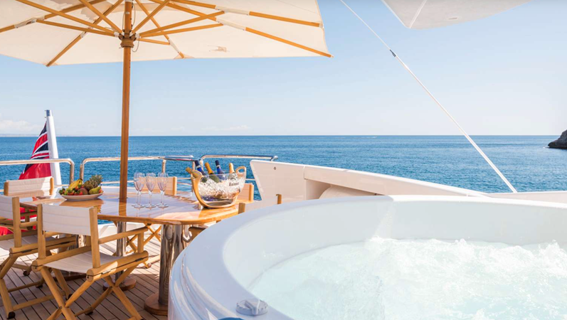 The yacht offers a sophisticated and calm interior, highlighted by a full-width Saloon and a light-filled aft dining room—spaces that maximize comfort and connectivity. She provides highly flexible accommodation across four main cabins, configurable as doubles or doubles/singles, along with a main deck office. Outside, the multi-functional decks include a Flybridge with shaded ‘alfresco’ dining and a relaxing hot tub, and a unique, private forward sun deck. Benita Blue is fully equipped with a 2019 Williams turbojet tender and a substantial list of water toys, cementing her status as a high-quality, proven, and impeccably maintained bespoke vessel.