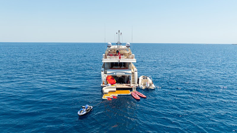 A large garage with beach area provides additional enjoyment at sea, while the bow includes sunbathing beds for outdoor leisure.