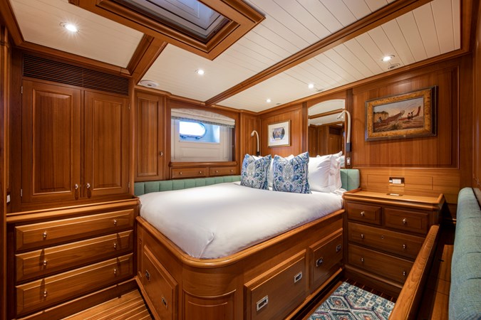 LEGEND accommodates guests in three well-appointed aft staterooms, including a full-beam master, a port double, and a convertible starboard cabin. The master suite features a walk-around queen berth, an L-shaped settee, bureau, and a split en suite with a marble shower and separate WC. Forward of the galley, crew quarters comfortably accommodate four to five, complete with a dedicated crew mess.