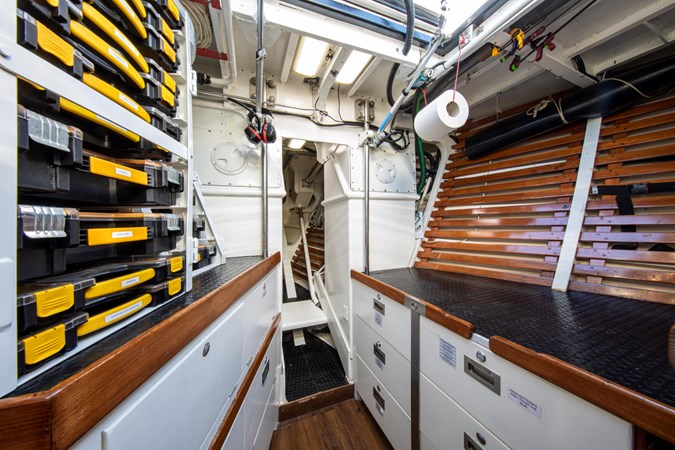 Her interior is both elegant and inviting, featuring a low-profile raised deck salon/pilothouse and a generous full-beam lower salon. Finished in rich teak joinery with refined soft furnishings, the space is bright, airy, and exceptionally well-ventilated throughout.