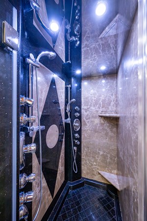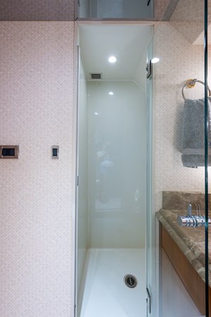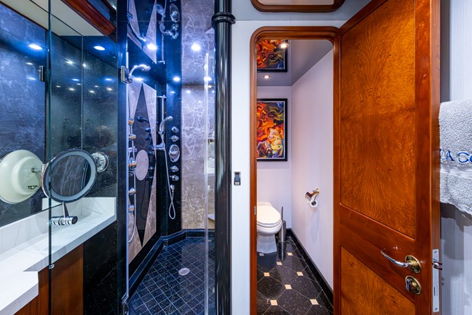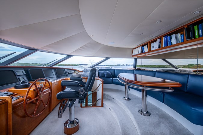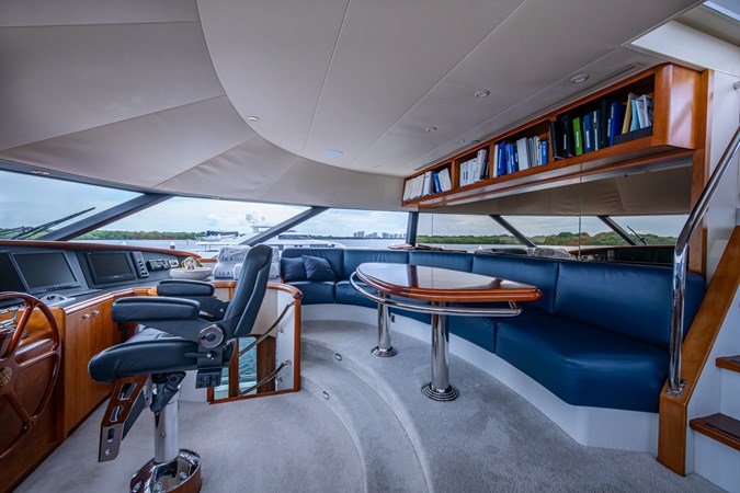 Her interior was transformed in 2019 by Chanel Coontz of Neosage, replacing dated tones with a serene indigo palette, elegant Azul stone surfaces, and sea-inspired details—creating a calm, sophisticated atmosphere. Further updates in 2021 added new teak on the swim platform, refreshed galley flooring, and updated crew spaces.