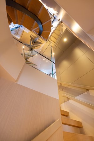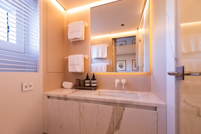 Naval architecture by Sergio Cutolo / Hydro Tec ensures outstanding seaworthiness, efficiency, and comfort. Powered by twin Caterpillar C18 Acert engines and equipped with 45,000 liters of fuel, Stellamar delivers an impressive 5,000+ nm range at 10 knots, enabling true globe-cruising without frequent stops. Stability is further enhanced by electric-driven stabilizers and a purpose-designed hull geometry.