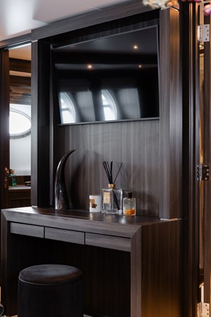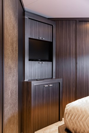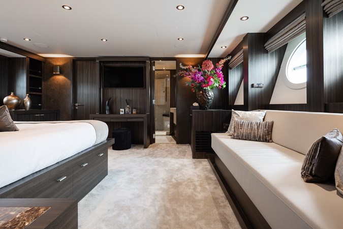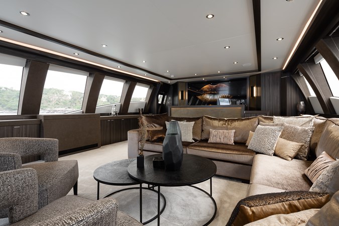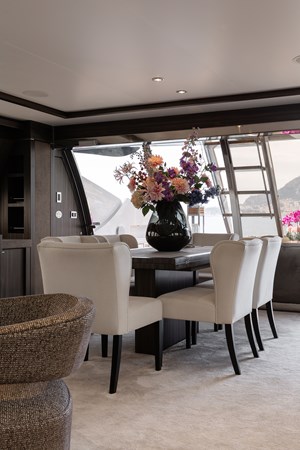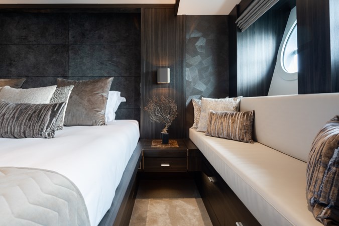 Step inside to a world of refined elegance, where dark woods, marble, and velvet create a chic and welcoming ambiance in the main salon and formal dining area. Unwind in the spacious outdoor lounges or savor panoramic views from the flybridge.