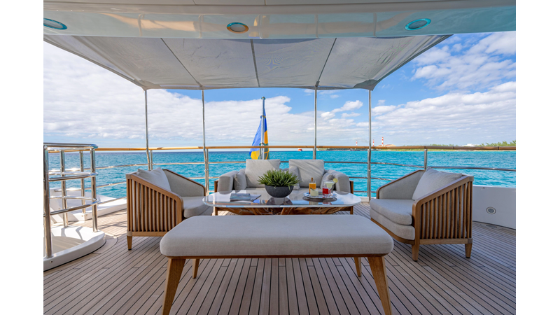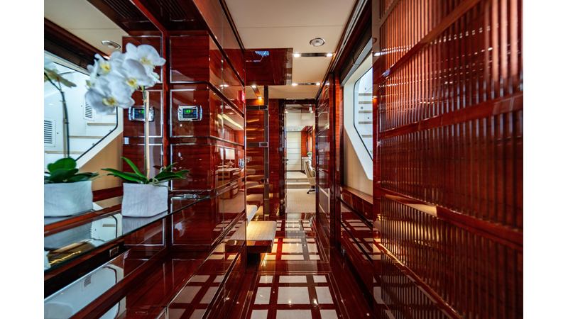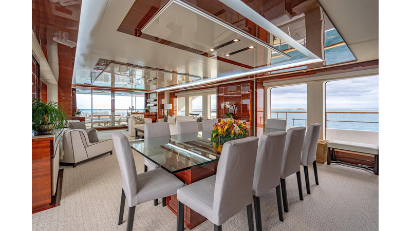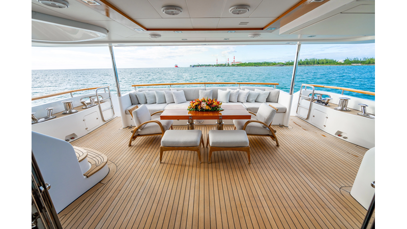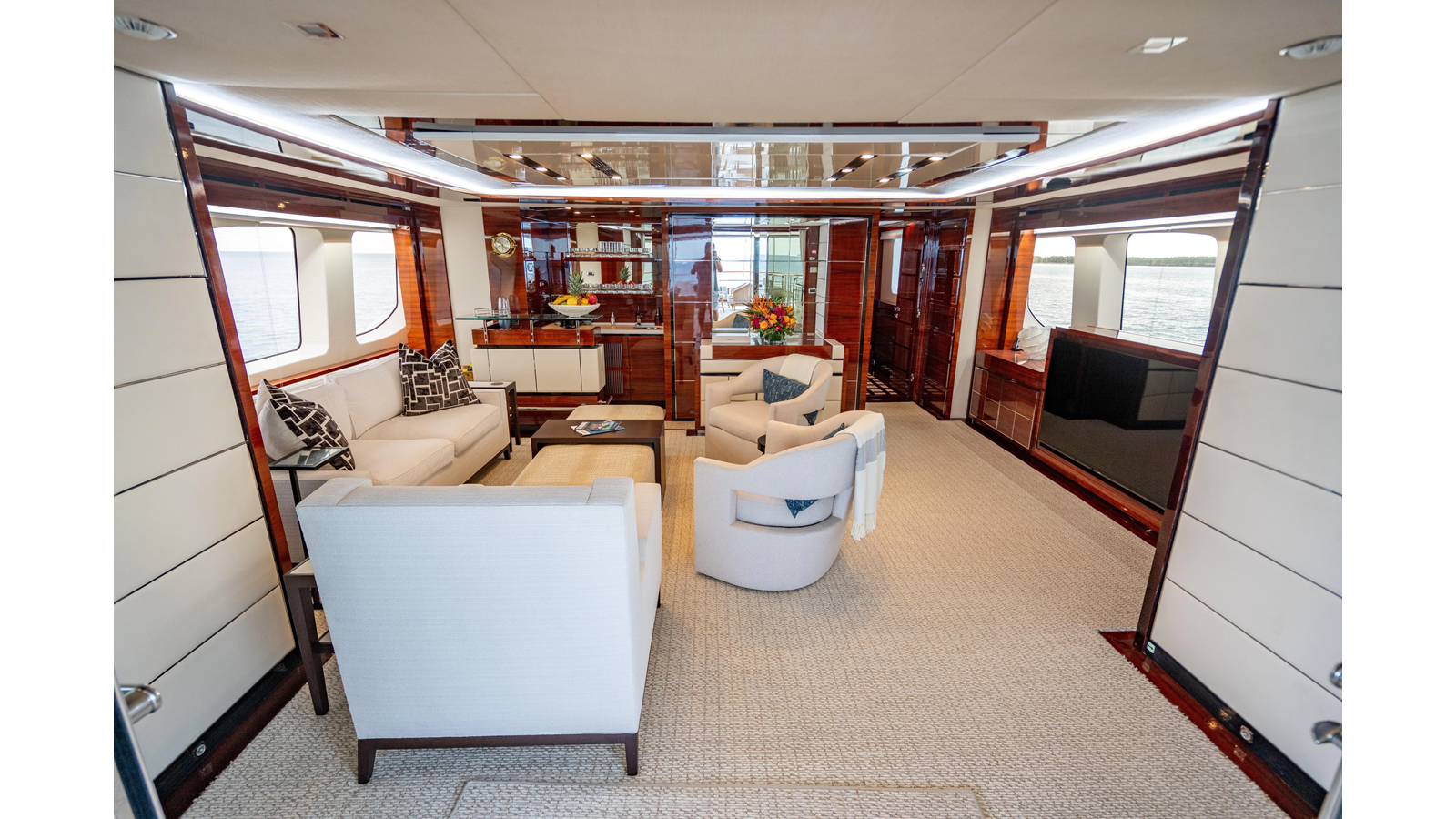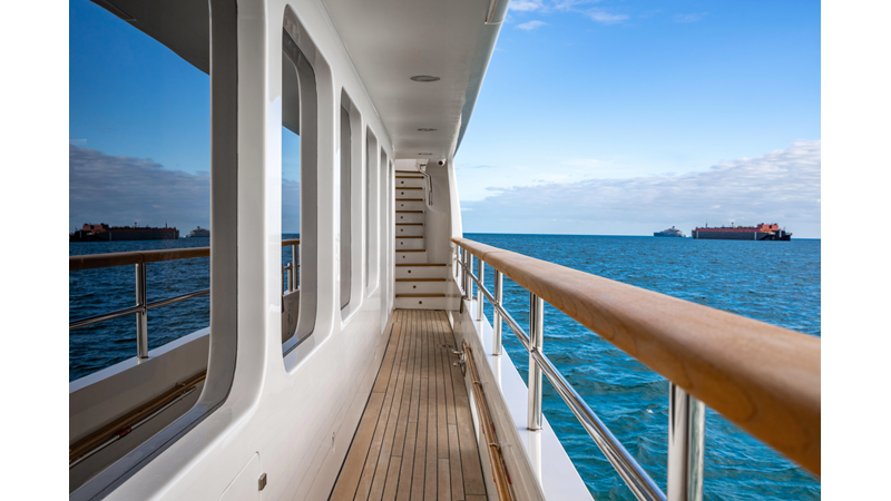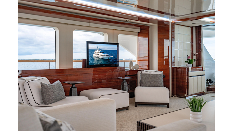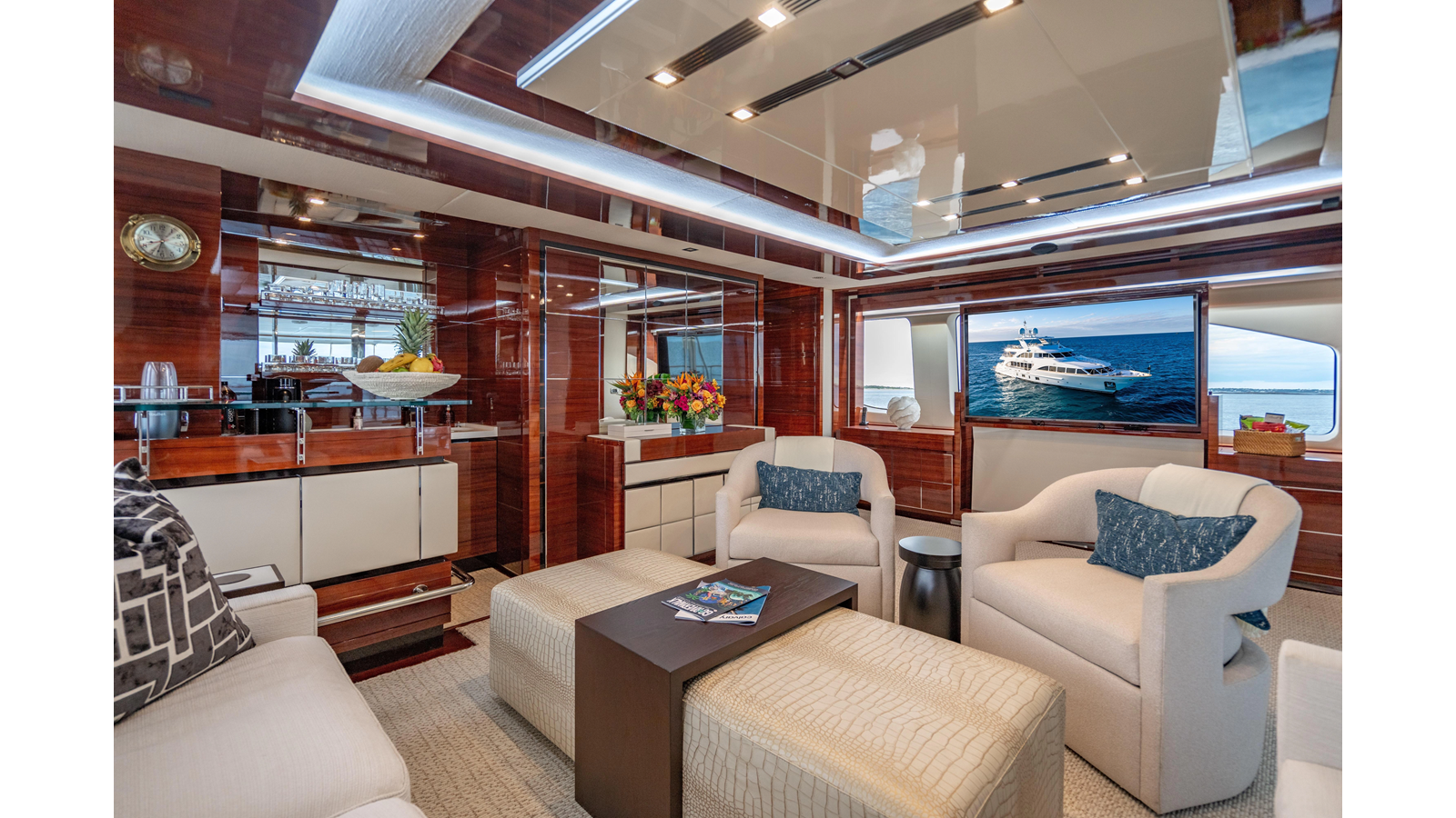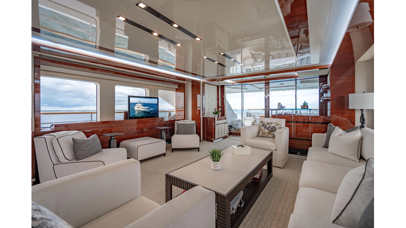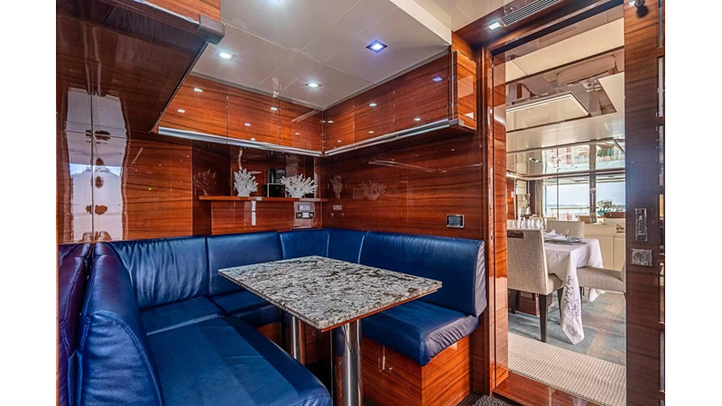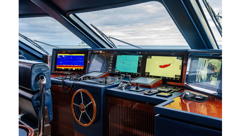 The interior was further updated in 2022/2023 to a more modern décor by Patrick Knowles at a cost of approximately $2 million. Interior soft goods, blinds, and furniture were replaced, and the pilothouse navigation system was upgraded to Garmin electronics, featuring five 22-inch Garmin screens and an additional 10-inch GPS unit with monitoring in the captain’s cabin and crew area.