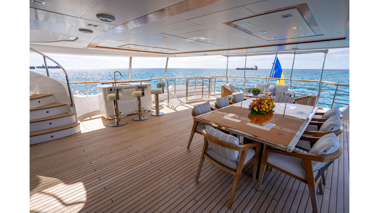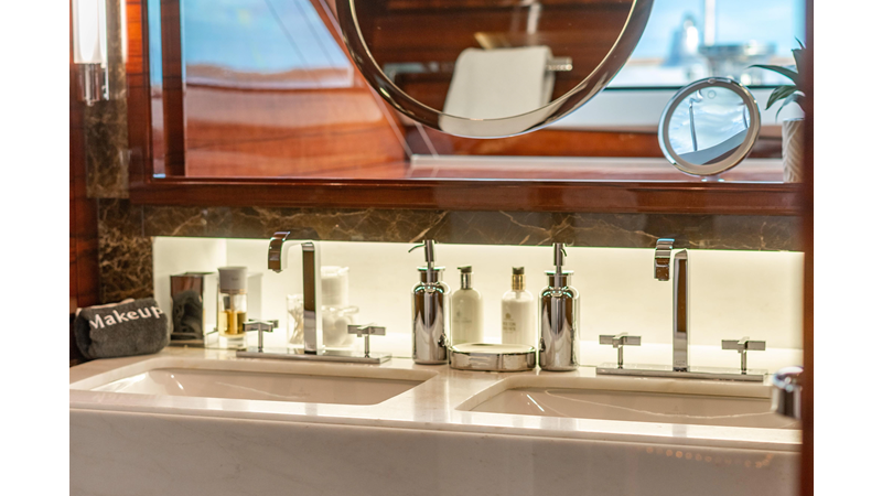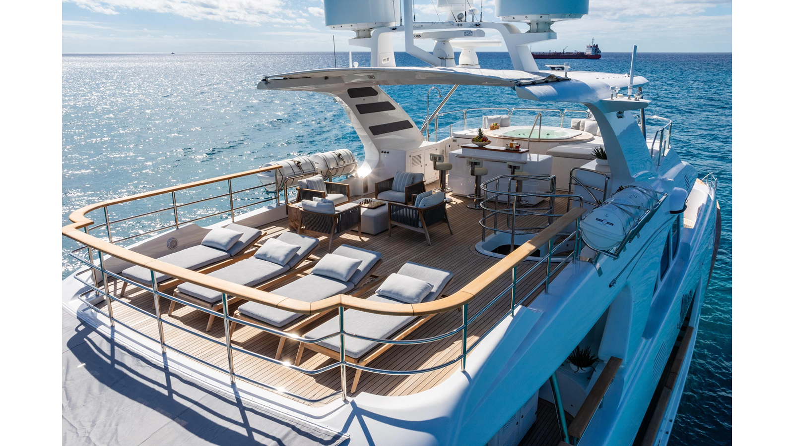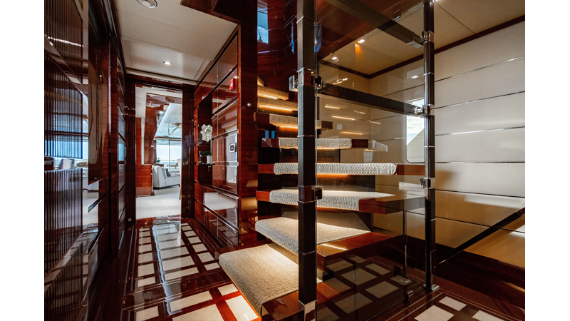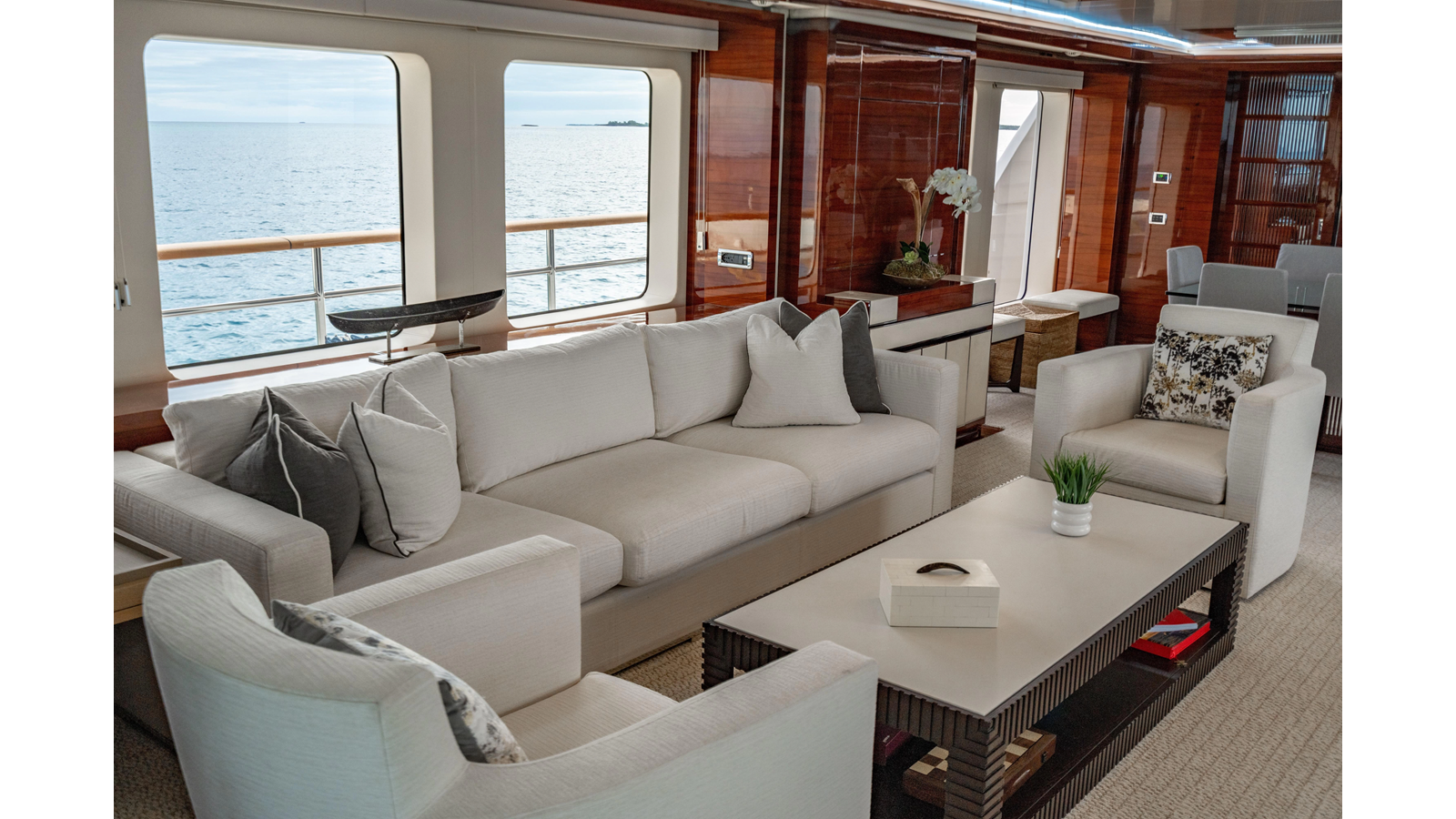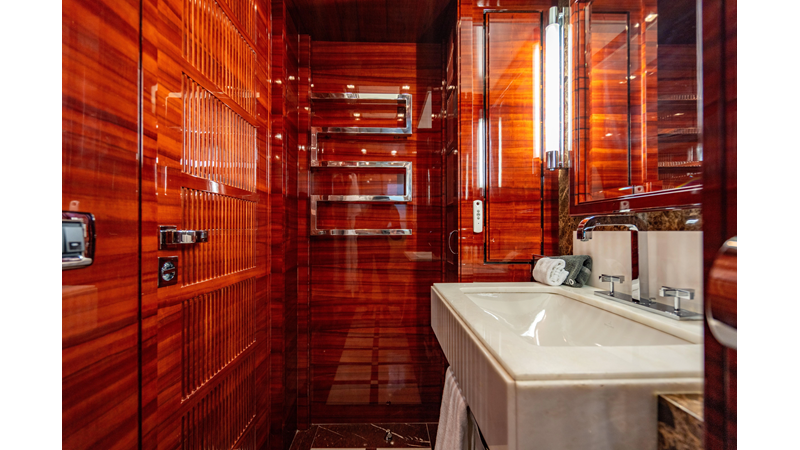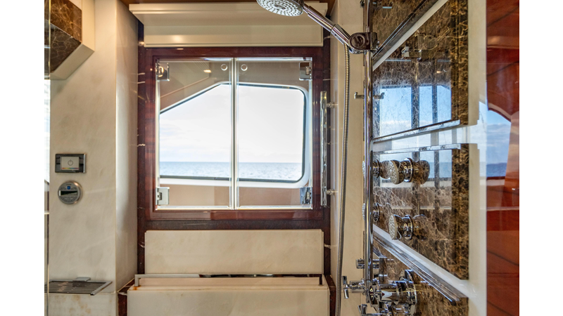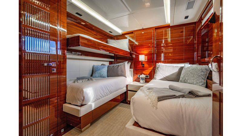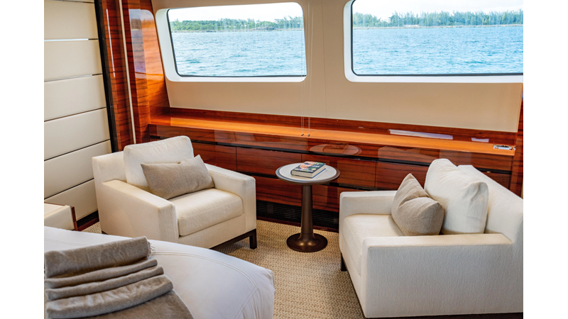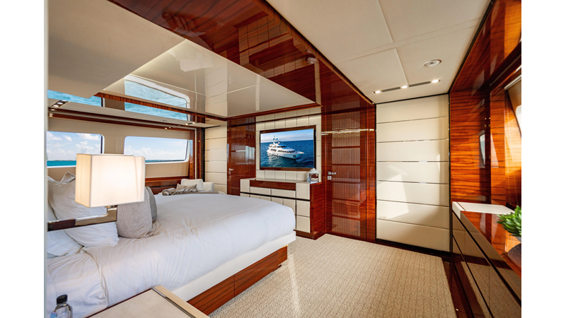 The interior was further updated in 2022/2023 to a more modern décor by Patrick Knowles at a cost of approximately $2 million. Interior soft goods, blinds, and furniture were replaced, and the pilothouse navigation system was upgraded to Garmin electronics, featuring five 22-inch Garmin screens and an additional 10-inch GPS unit with monitoring in the captain’s cabin and crew area.