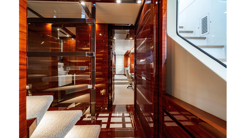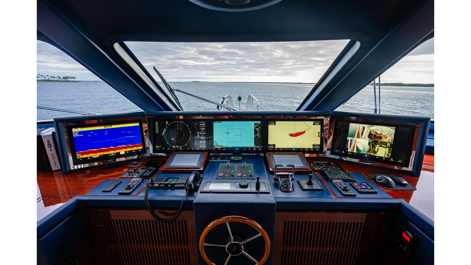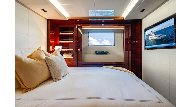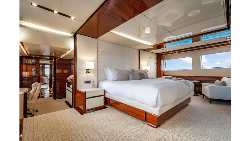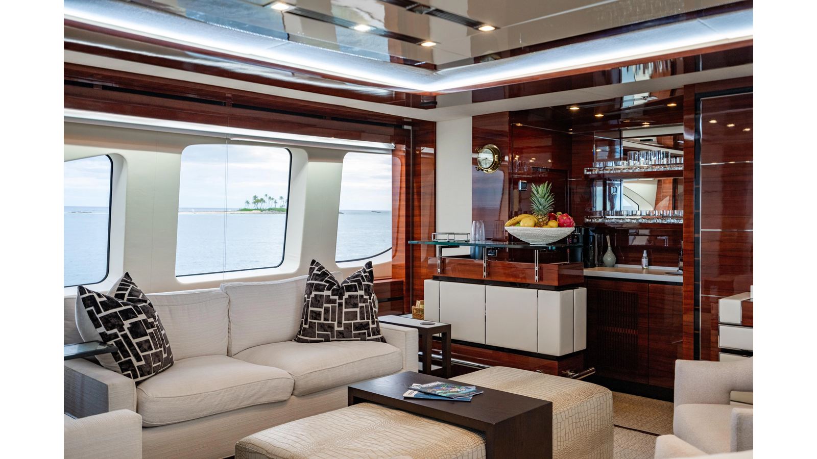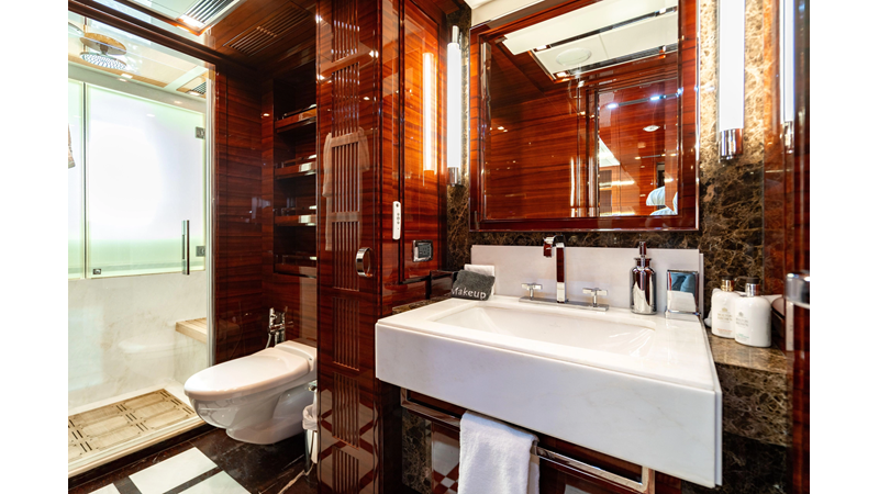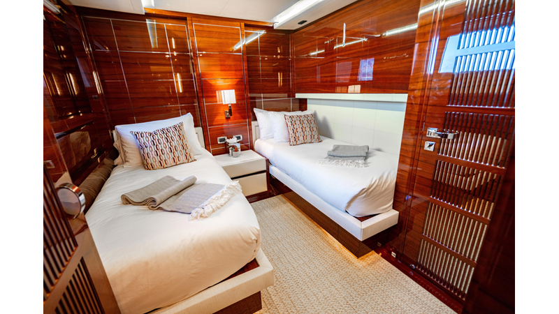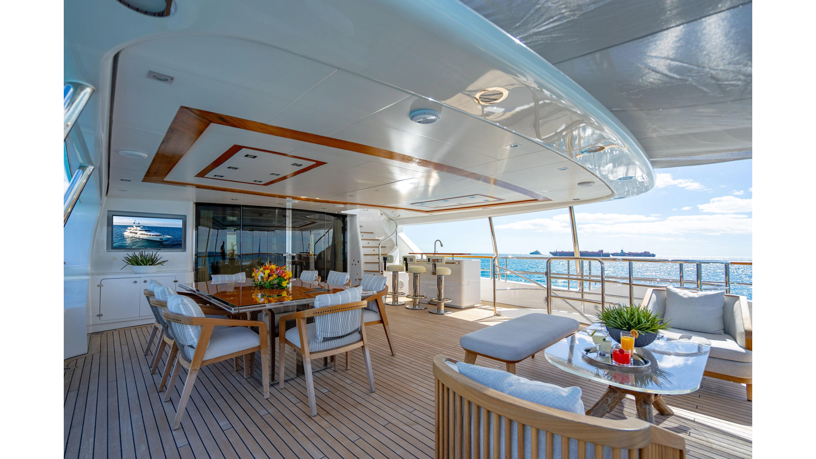 The interior was further updated in 2022/2023 to a more modern décor by Patrick Knowles at a cost of approximately $2 million. Interior soft goods, blinds, and furniture were replaced, and the pilothouse navigation system was upgraded to Garmin electronics, featuring five 22-inch Garmin screens and an additional 10-inch GPS unit with monitoring in the captain’s cabin and crew area.