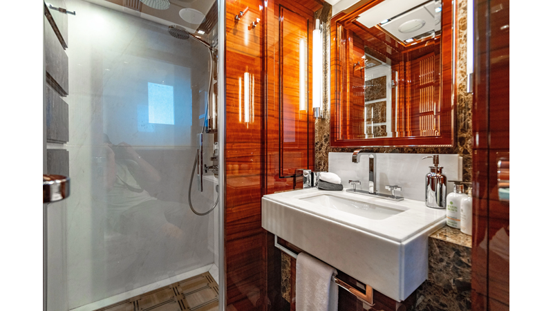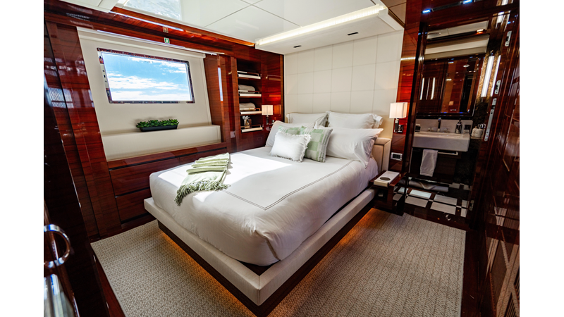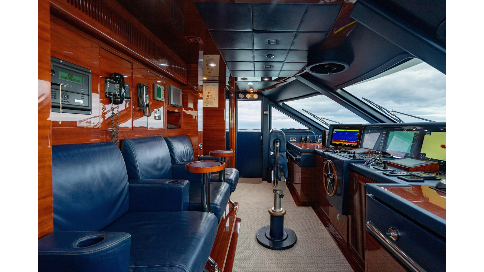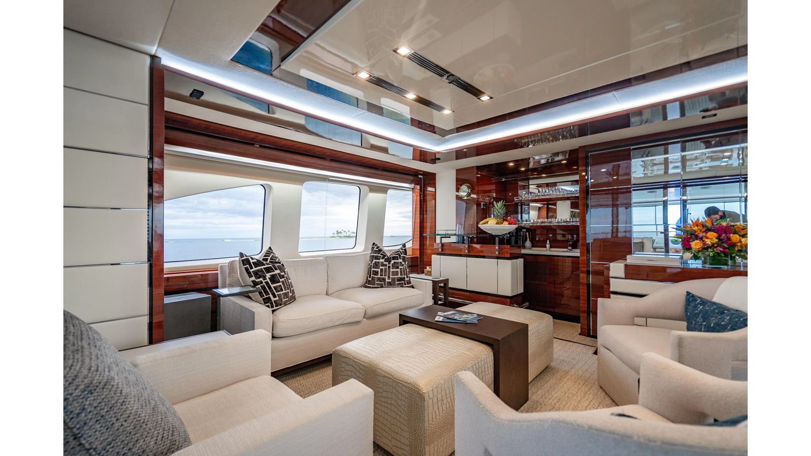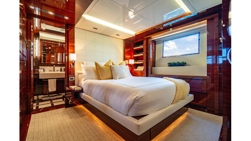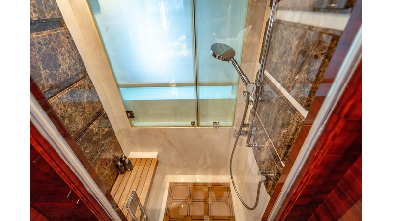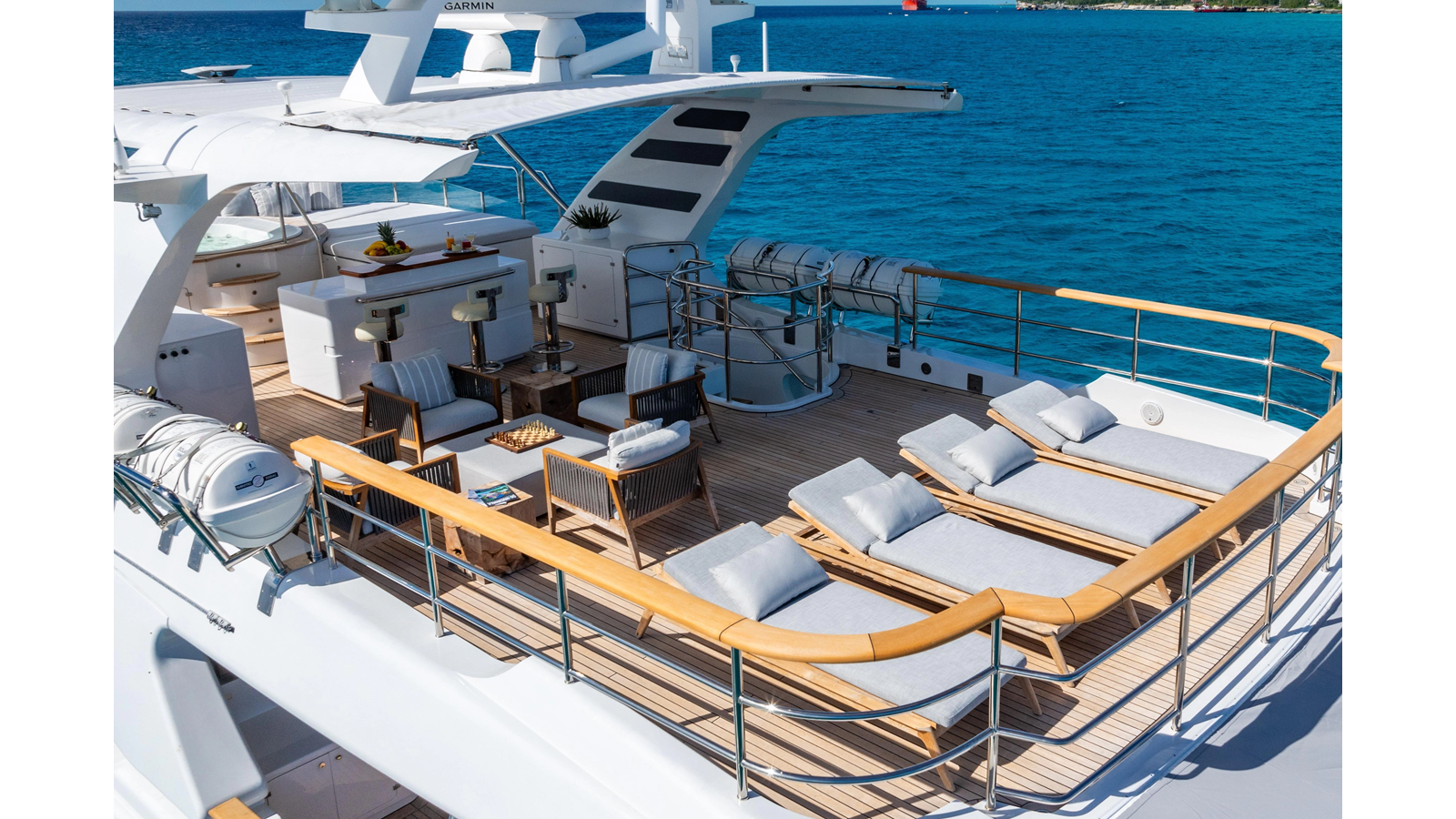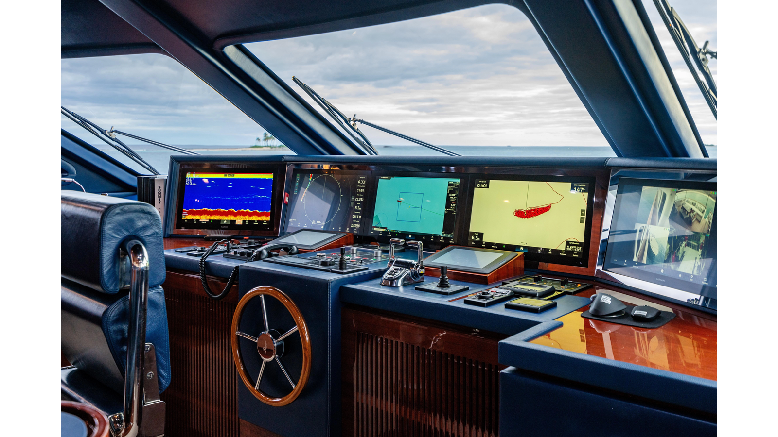 The interior was further updated in 2022/2023 to a more modern décor by Patrick Knowles at a cost of approximately $2 million. Interior soft goods, blinds, and furniture were replaced, and the pilothouse navigation system was upgraded to Garmin electronics, featuring five 22-inch Garmin screens and an additional 10-inch GPS unit with monitoring in the captain’s cabin and crew area.