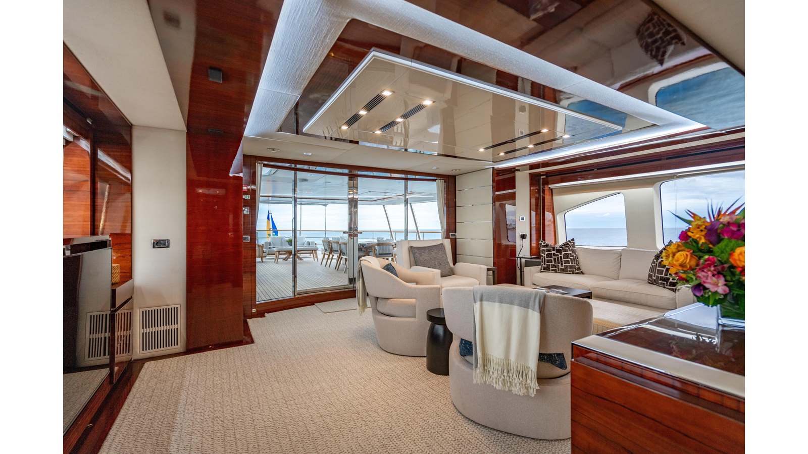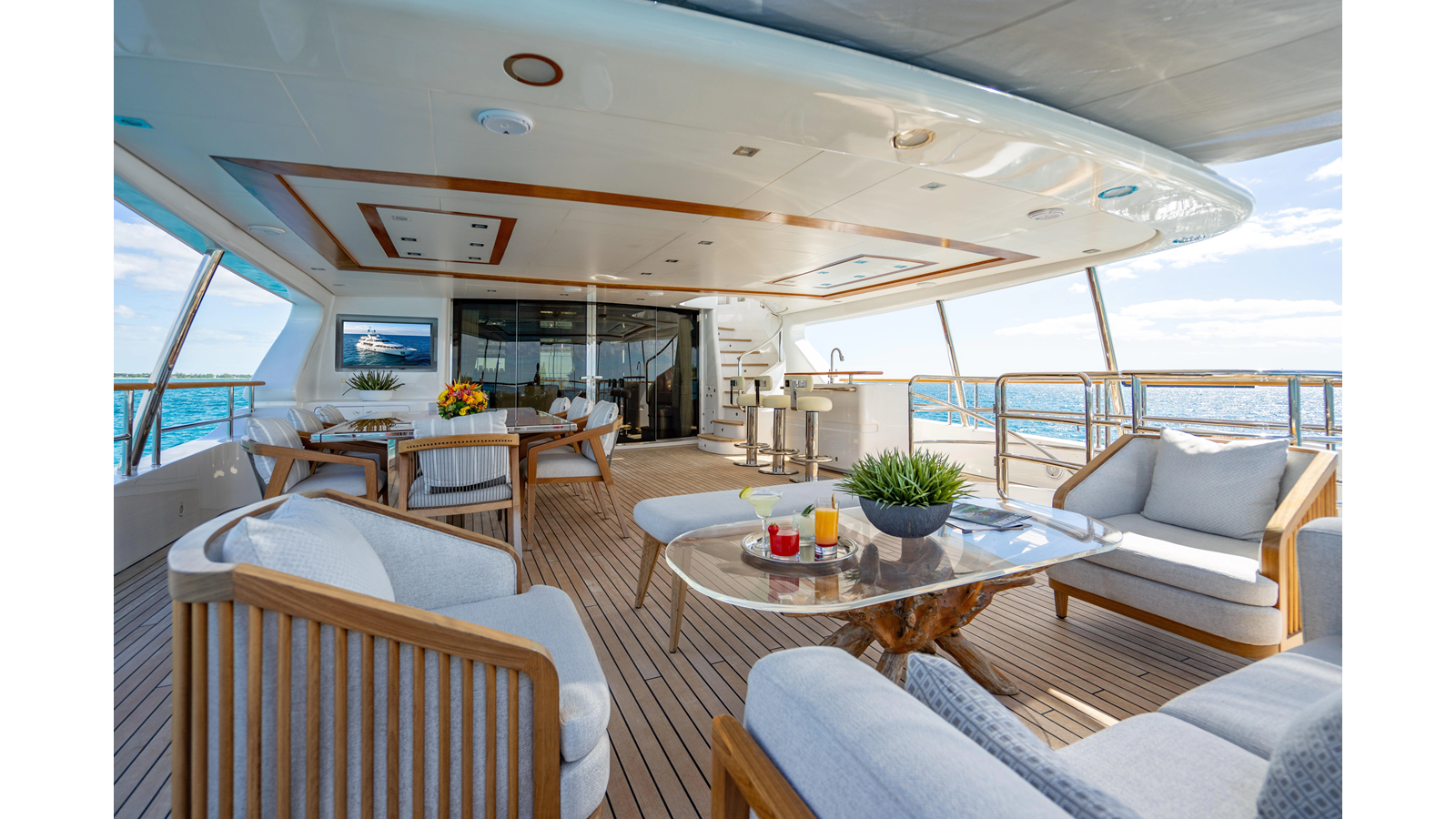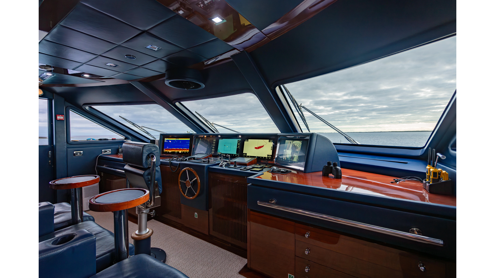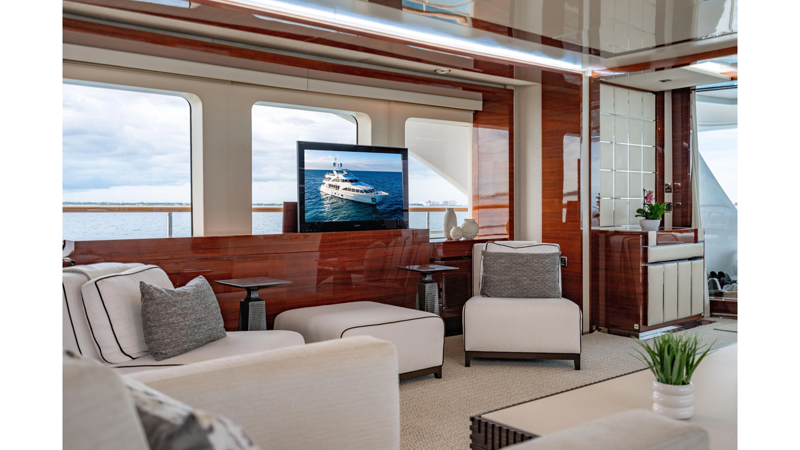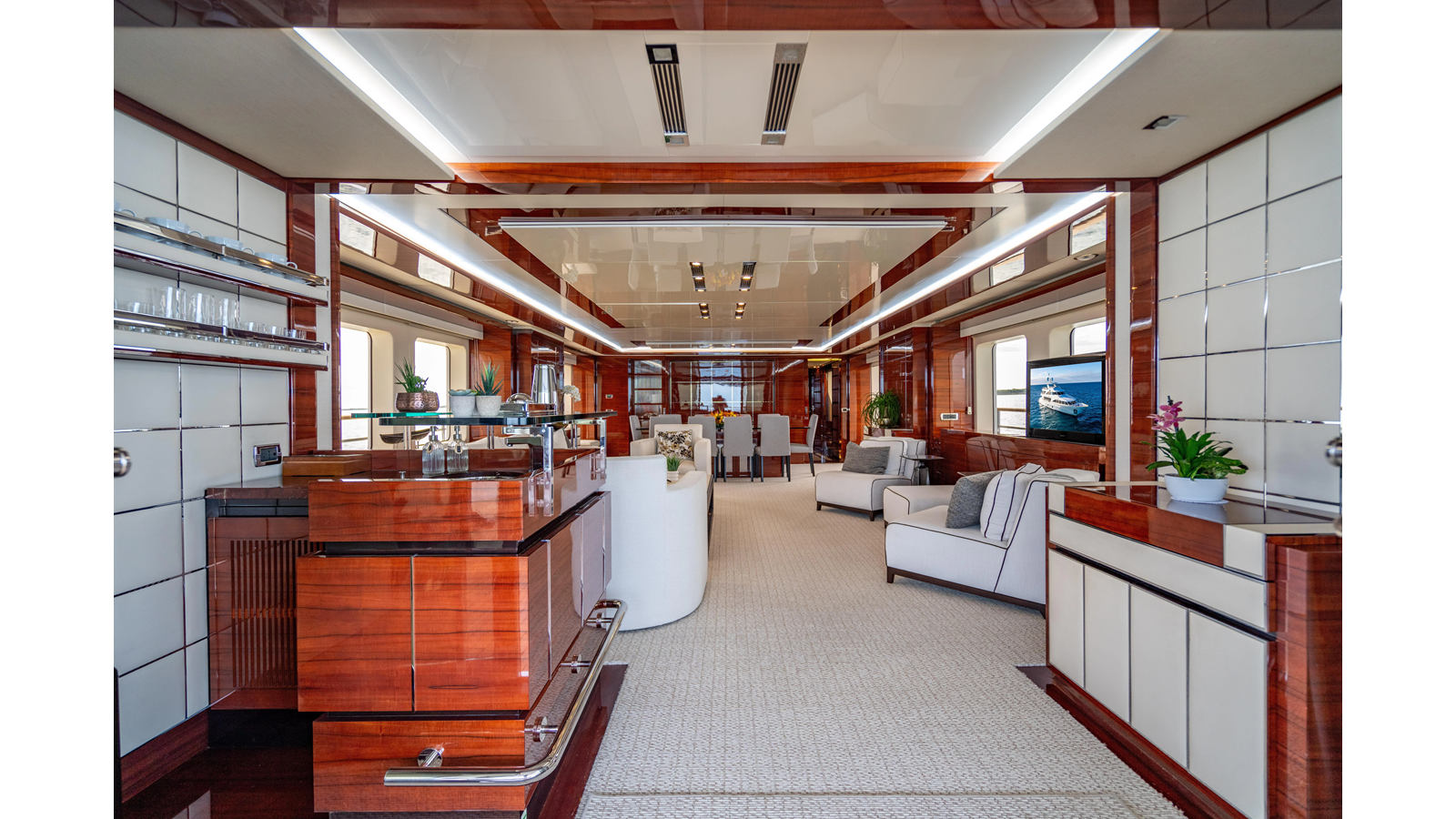 The interior was further updated in 2022/2023 to a more modern décor by Patrick Knowles at a cost of approximately $2 million. Interior soft goods, blinds, and furniture were replaced, and the pilothouse navigation system was upgraded to Garmin electronics, featuring five 22-inch Garmin screens and an additional 10-inch GPS unit with monitoring in the captain’s cabin and crew area.