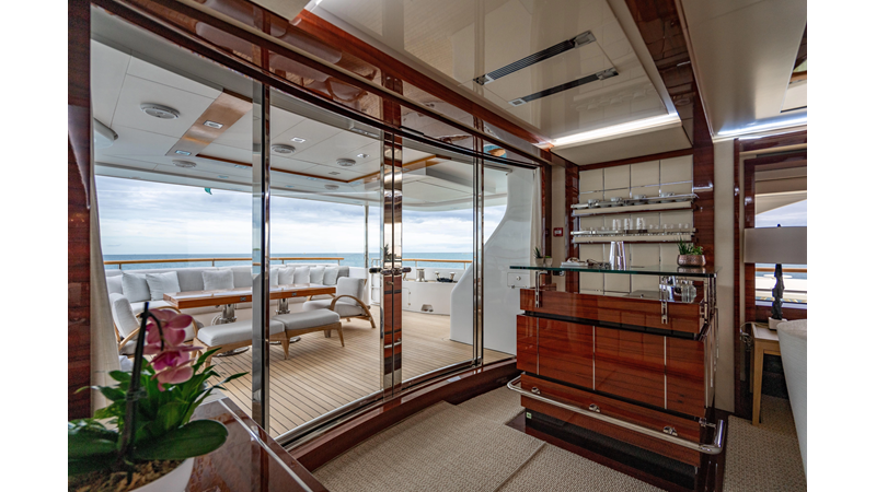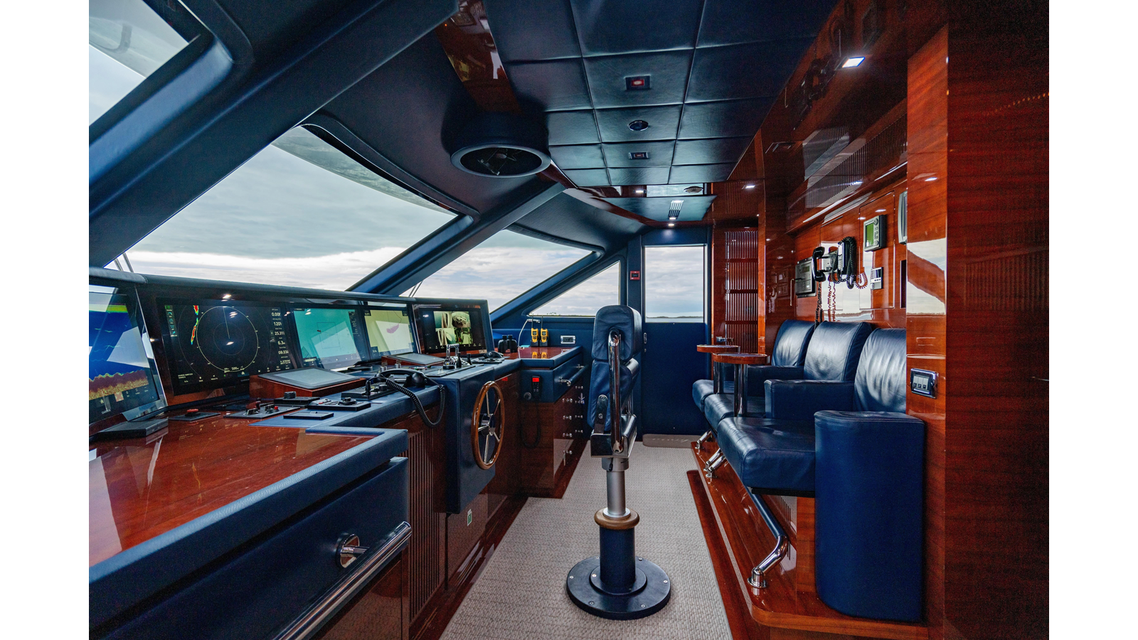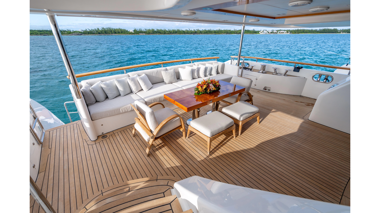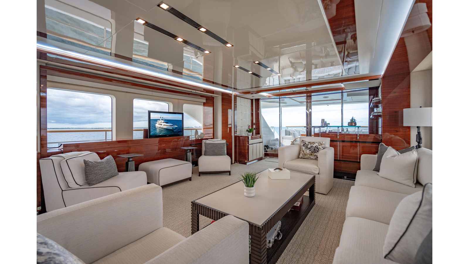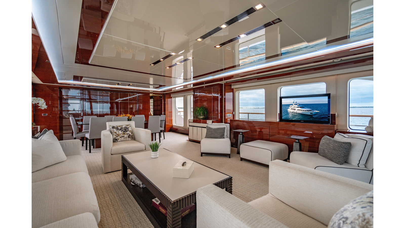 The interior was further updated in 2022/2023 to a more modern décor by Patrick Knowles at a cost of approximately $2 million. Interior soft goods, blinds, and furniture were replaced, and the pilothouse navigation system was upgraded to Garmin electronics, featuring five 22-inch Garmin screens and an additional 10-inch GPS unit with monitoring in the captain’s cabin and crew area.