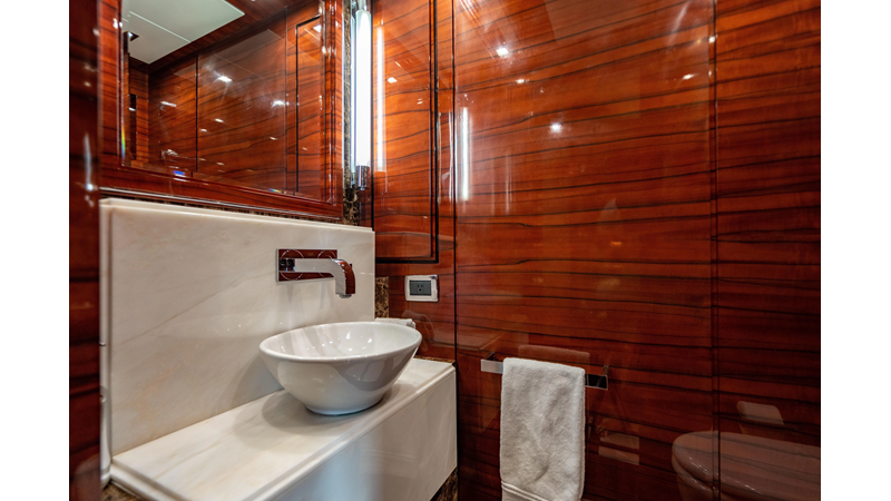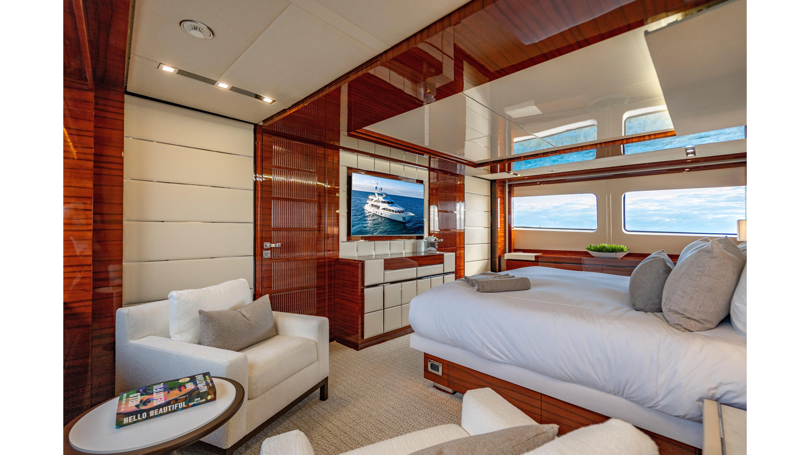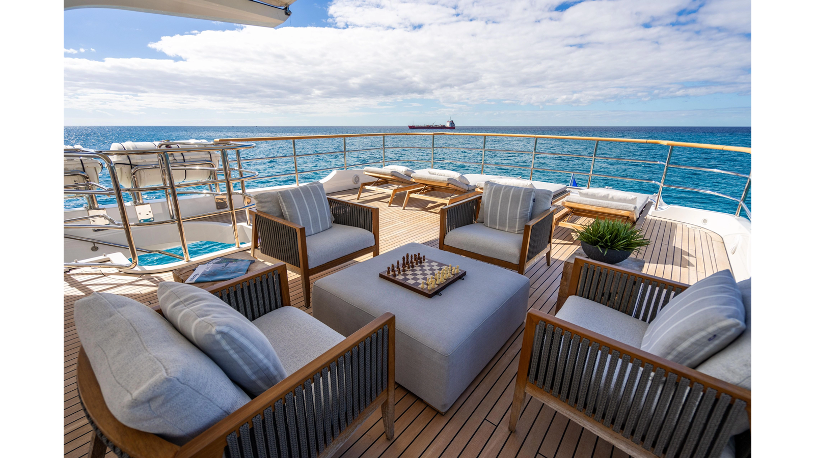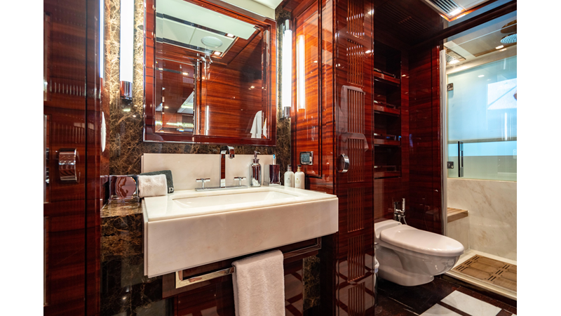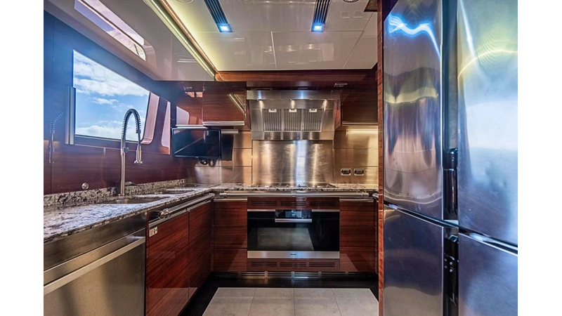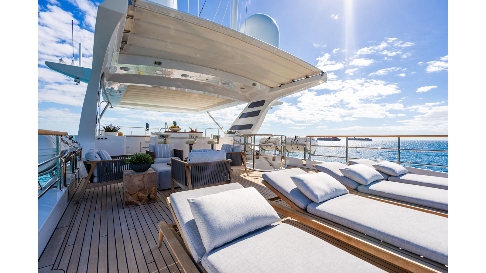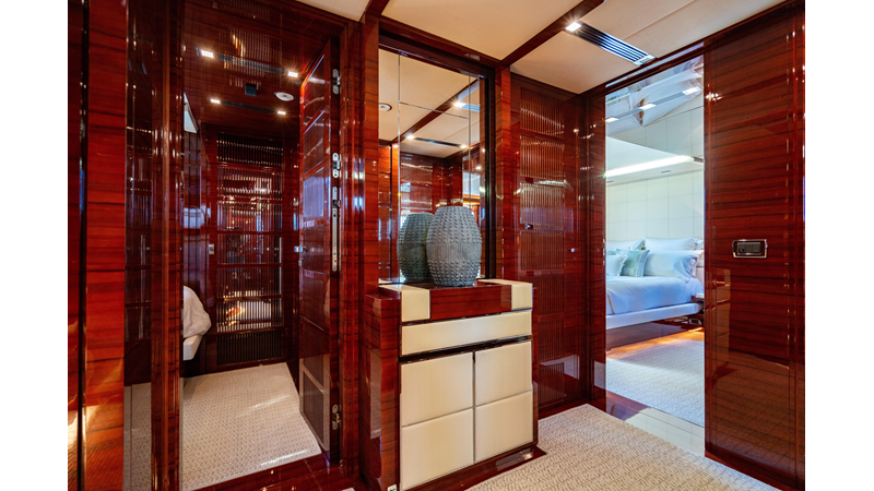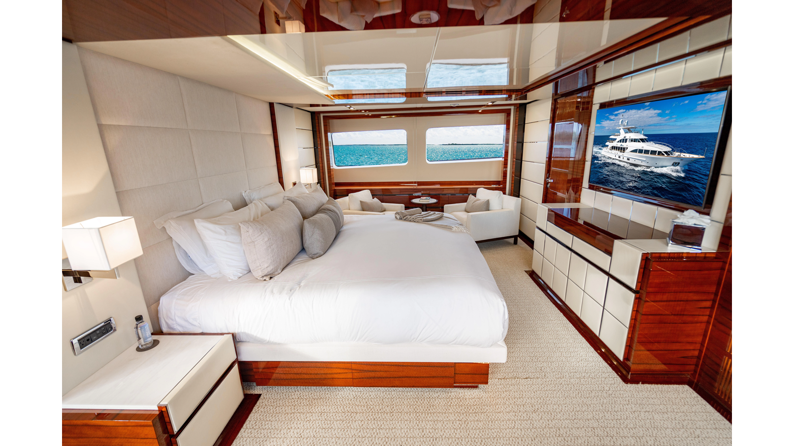 The interior was further updated in 2022/2023 to a more modern décor by Patrick Knowles at a cost of approximately $2 million. Interior soft goods, blinds, and furniture were replaced, and the pilothouse navigation system was upgraded to Garmin electronics, featuring five 22-inch Garmin screens and an additional 10-inch GPS unit with monitoring in the captain’s cabin and crew area.