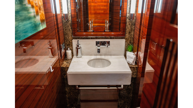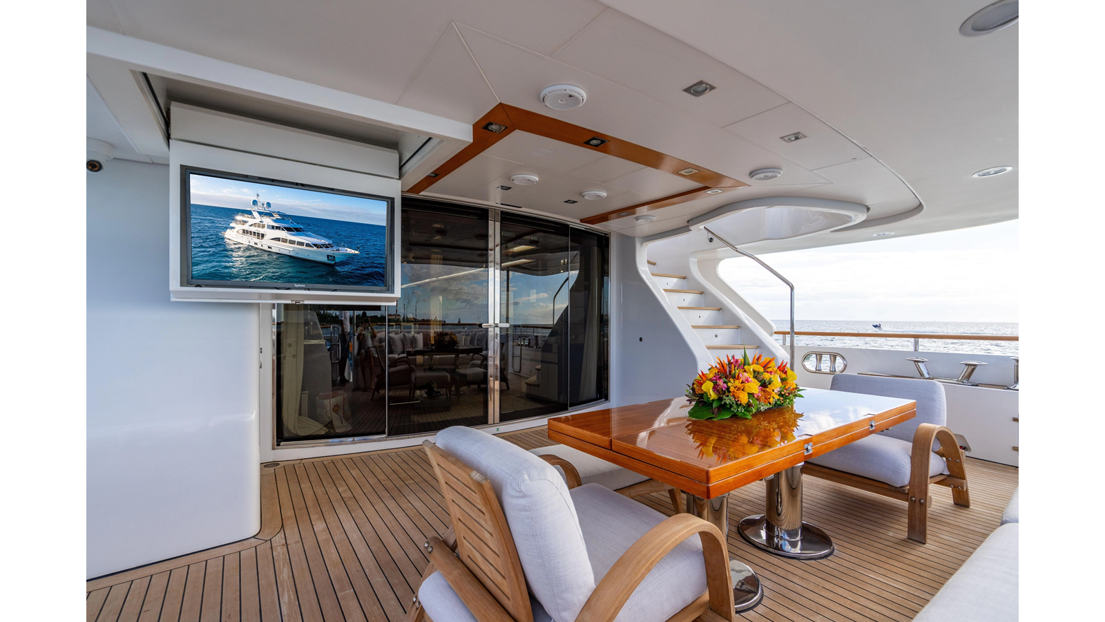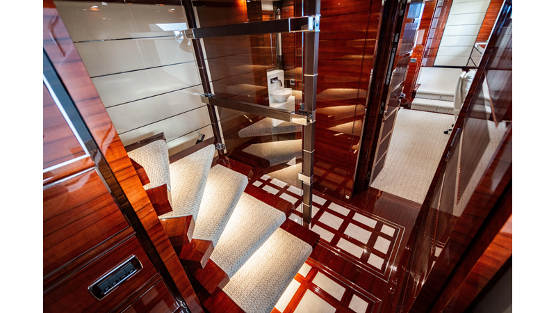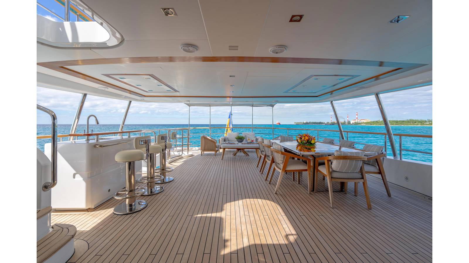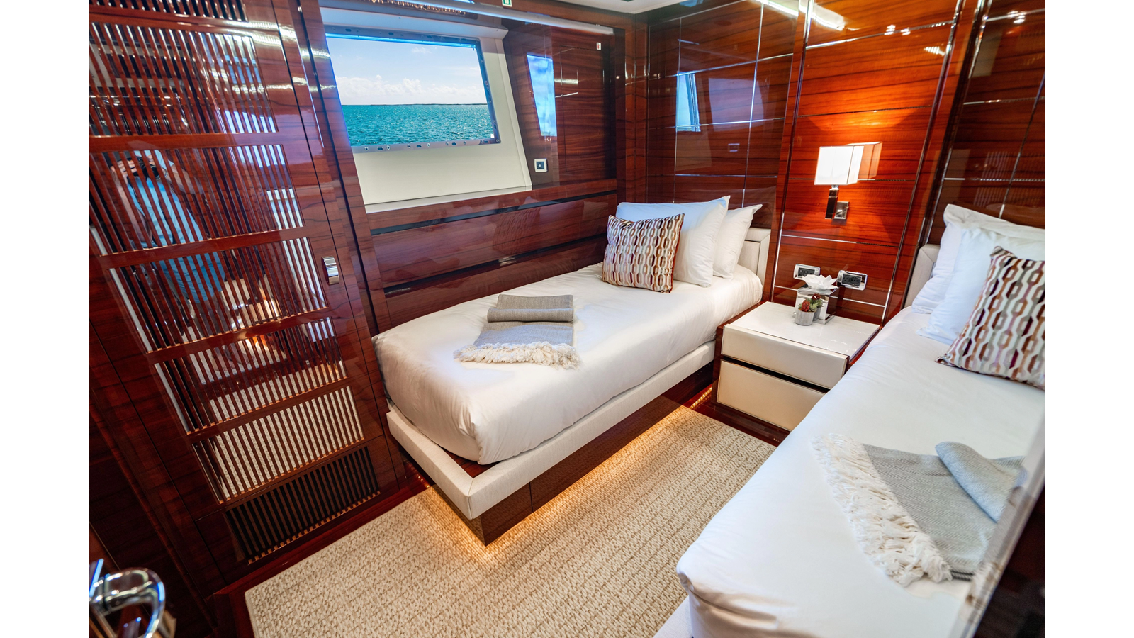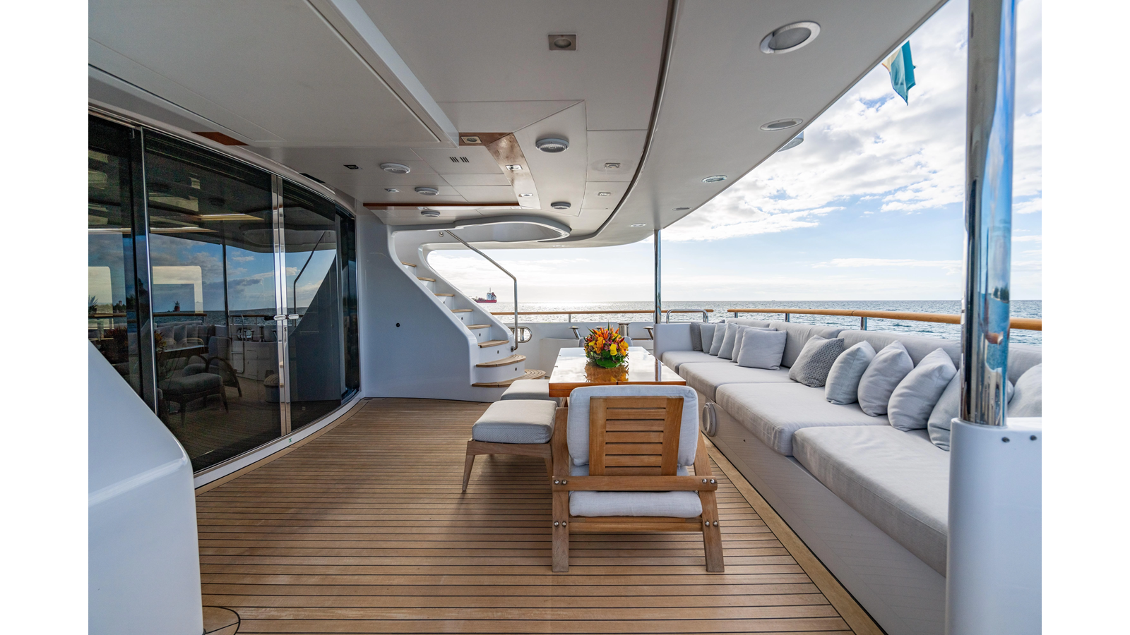 The interior was further updated in 2022/2023 to a more modern décor by Patrick Knowles at a cost of approximately $2 million. Interior soft goods, blinds, and furniture were replaced, and the pilothouse navigation system was upgraded to Garmin electronics, featuring five 22-inch Garmin screens and an additional 10-inch GPS unit with monitoring in the captain’s cabin and crew area.