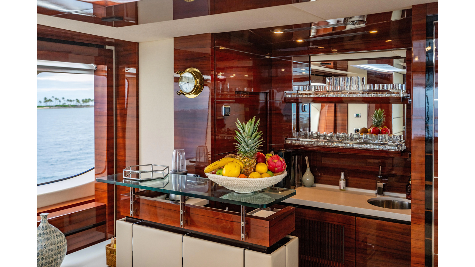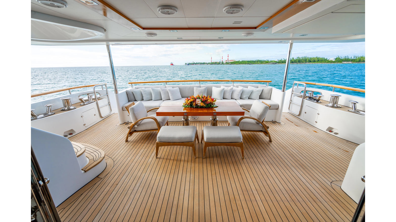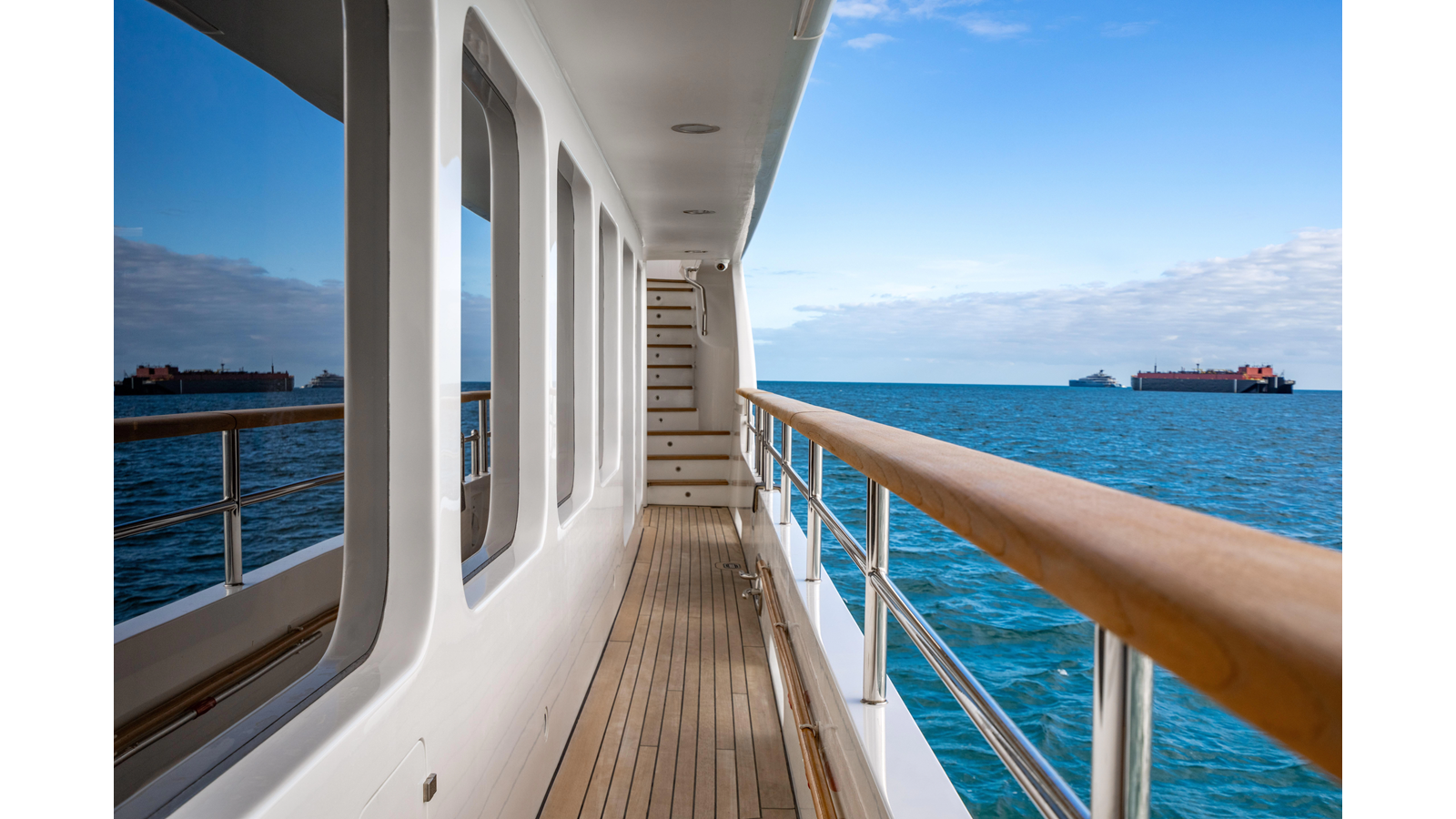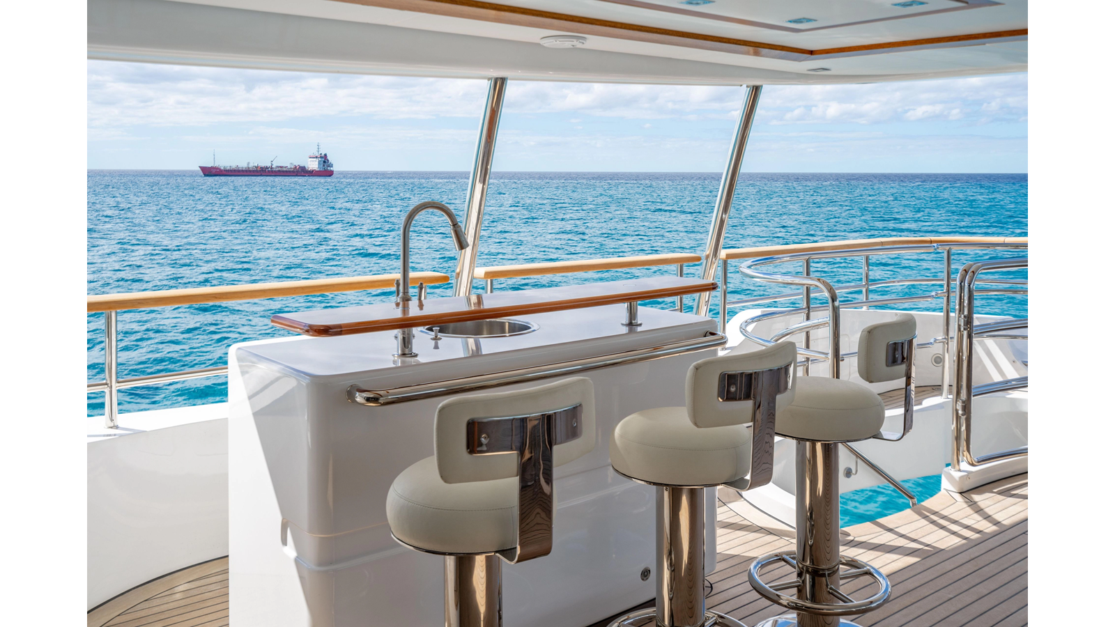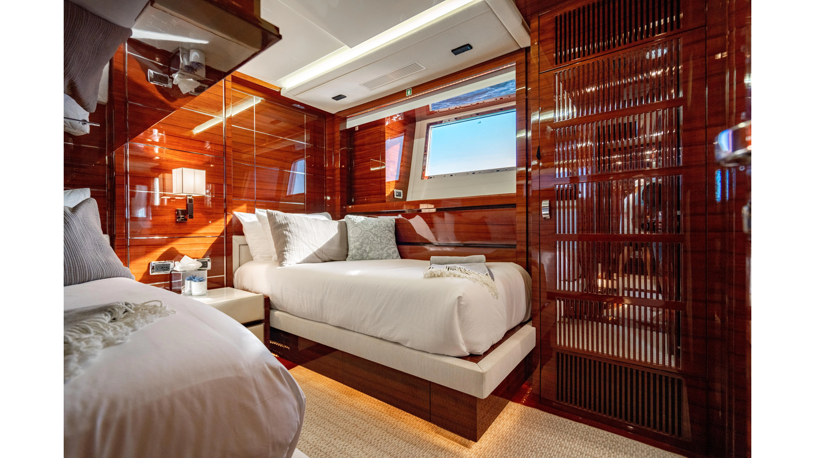 The interior was further updated in 2022/2023 to a more modern décor by Patrick Knowles at a cost of approximately $2 million. Interior soft goods, blinds, and furniture were replaced, and the pilothouse navigation system was upgraded to Garmin electronics, featuring five 22-inch Garmin screens and an additional 10-inch GPS unit with monitoring in the captain’s cabin and crew area.
