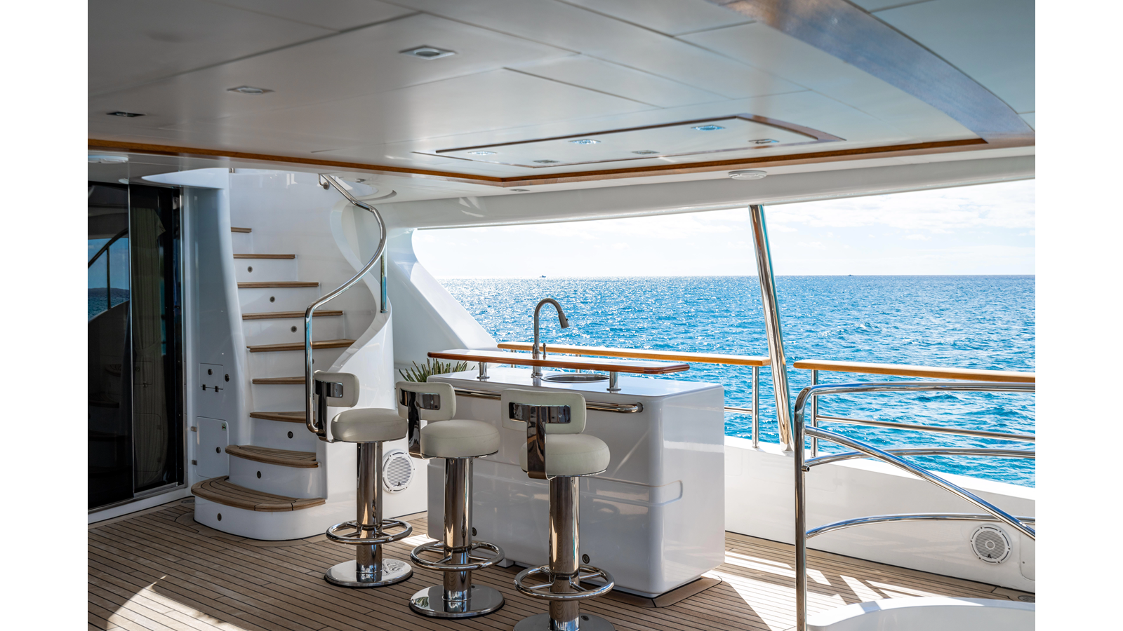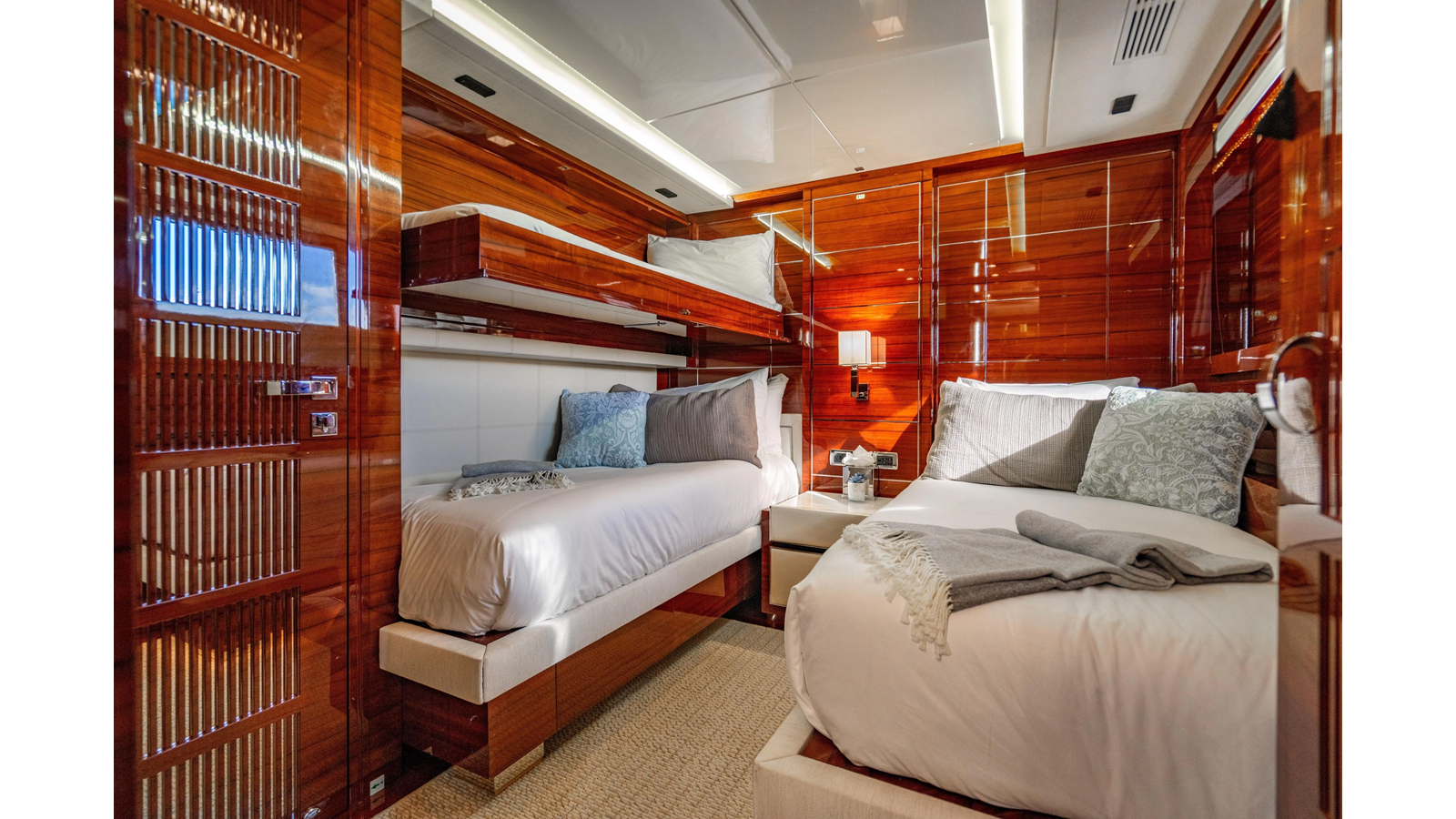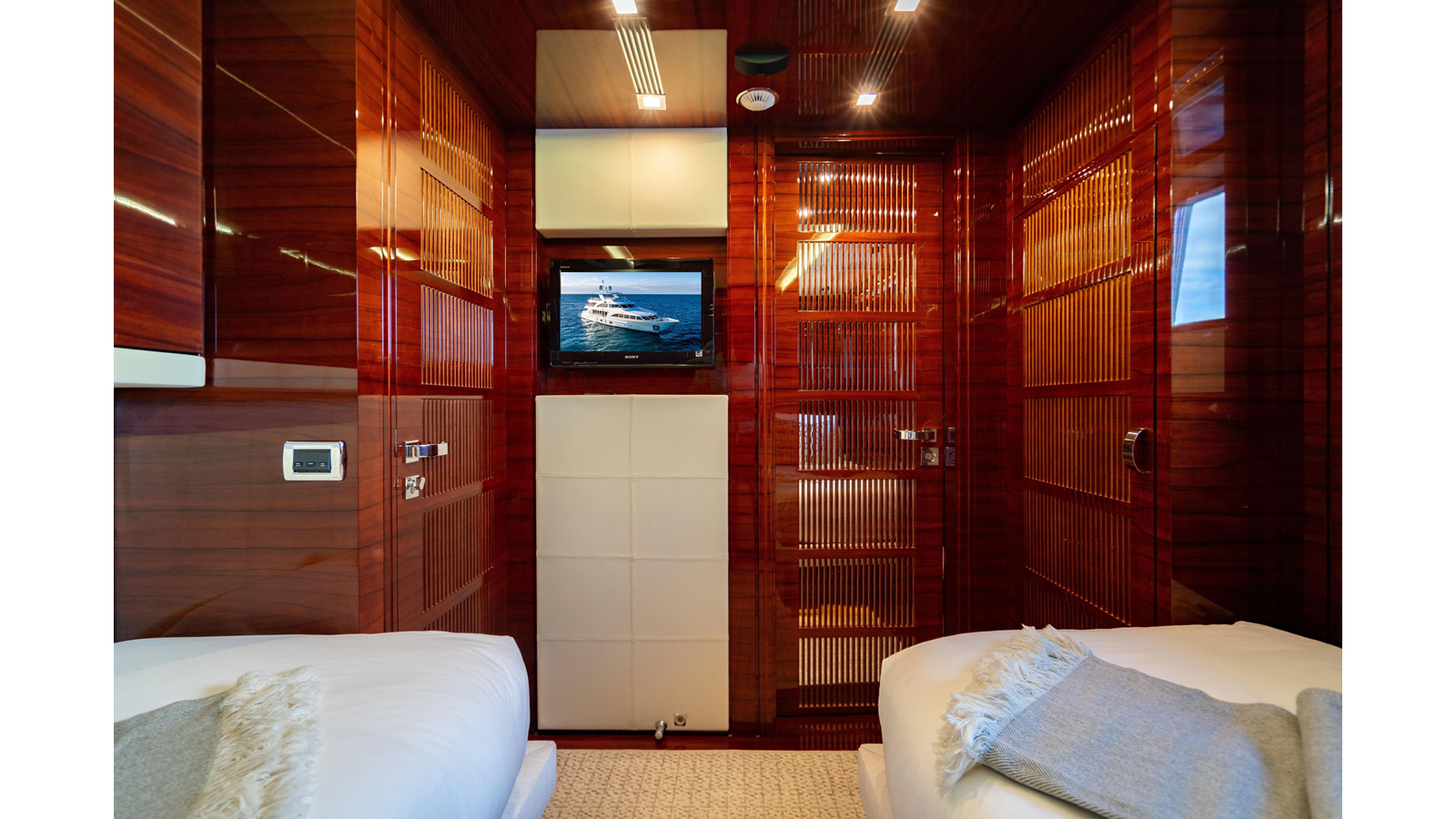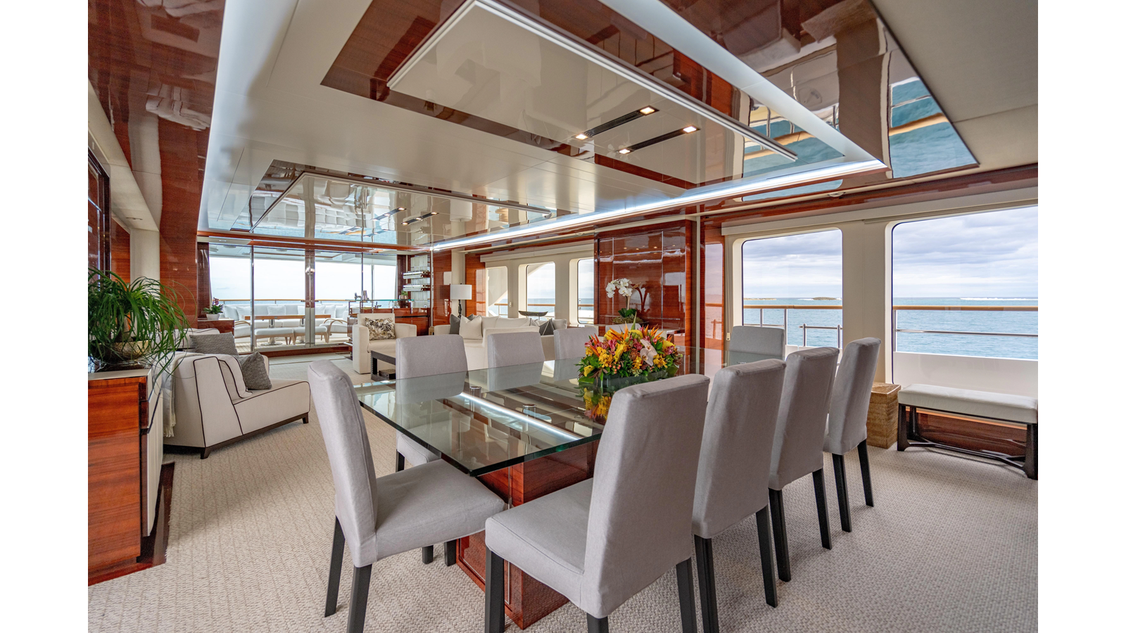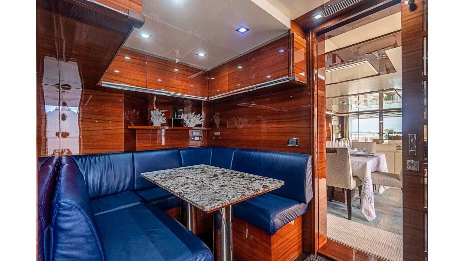 The interior was further updated in 2022/2023 to a more modern décor by Patrick Knowles at a cost of approximately $2 million. Interior soft goods, blinds, and furniture were replaced, and the pilothouse navigation system was upgraded to Garmin electronics, featuring five 22-inch Garmin screens and an additional 10-inch GPS unit with monitoring in the captain’s cabin and crew area.