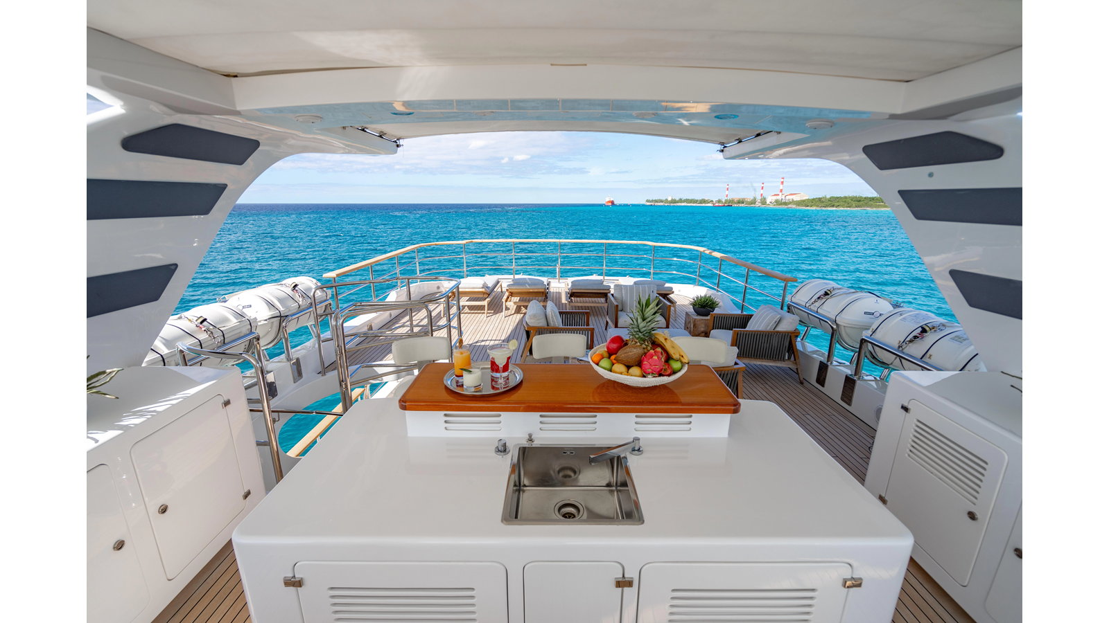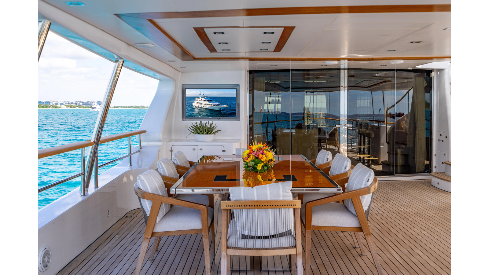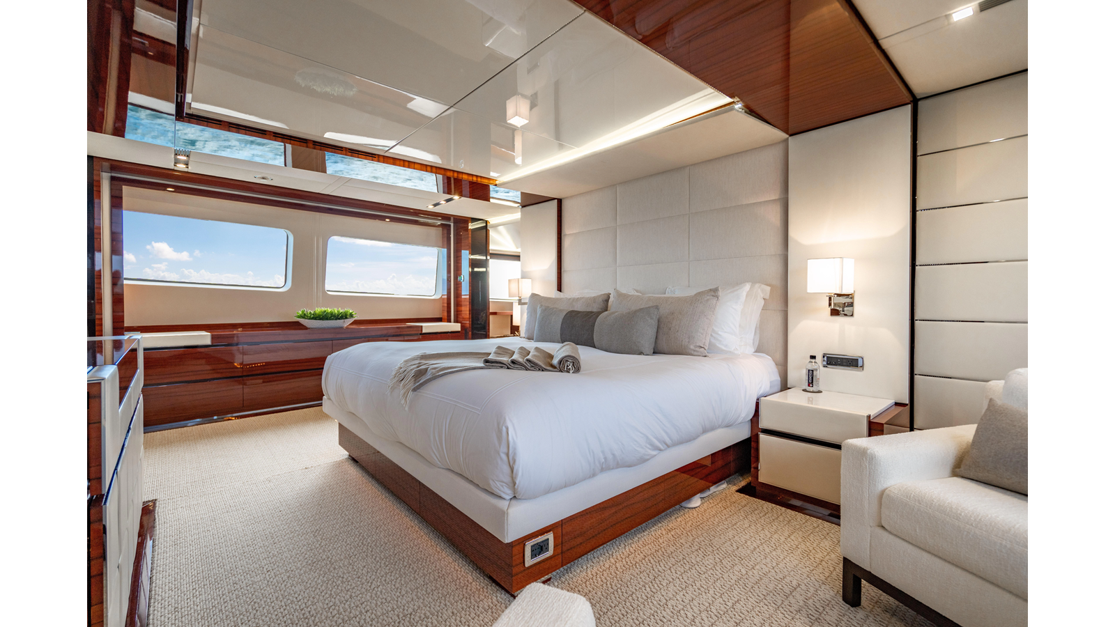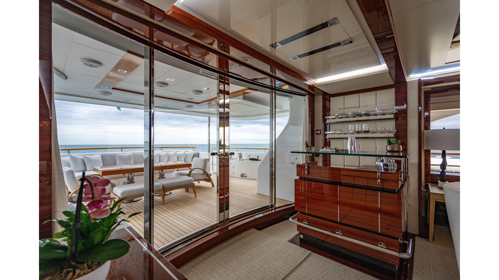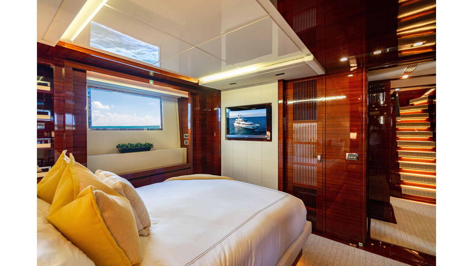 The interior was further updated in 2022/2023 to a more modern décor by Patrick Knowles at a cost of approximately $2 million. Interior soft goods, blinds, and furniture were replaced, and the pilothouse navigation system was upgraded to Garmin electronics, featuring five 22-inch Garmin screens and an additional 10-inch GPS unit with monitoring in the captain’s cabin and crew area.