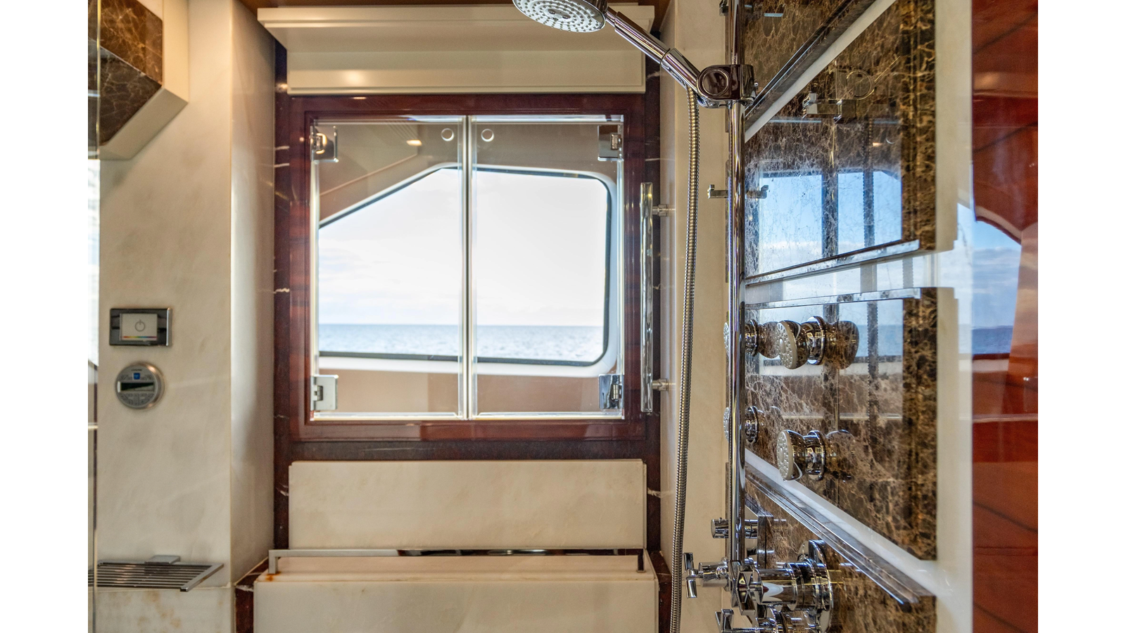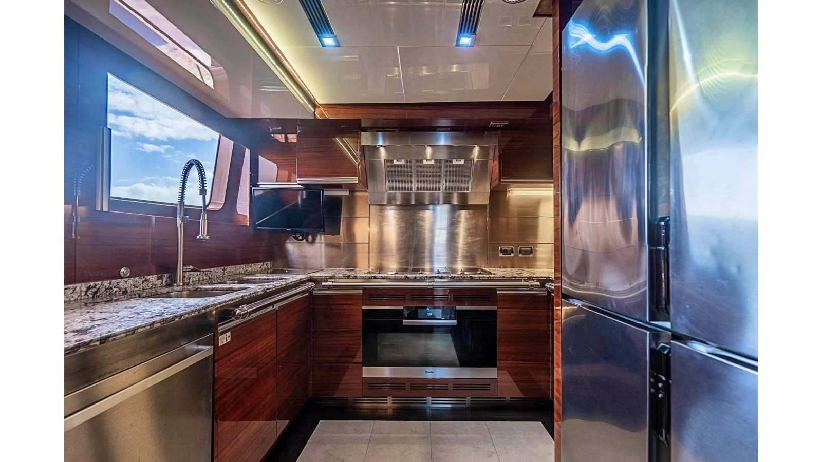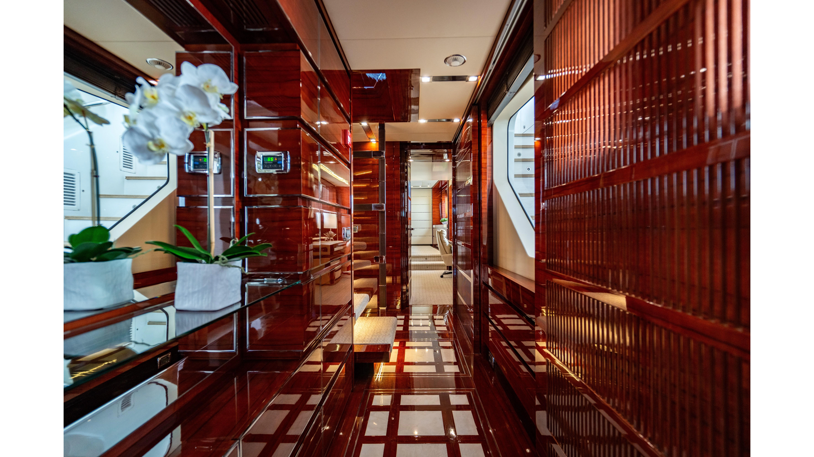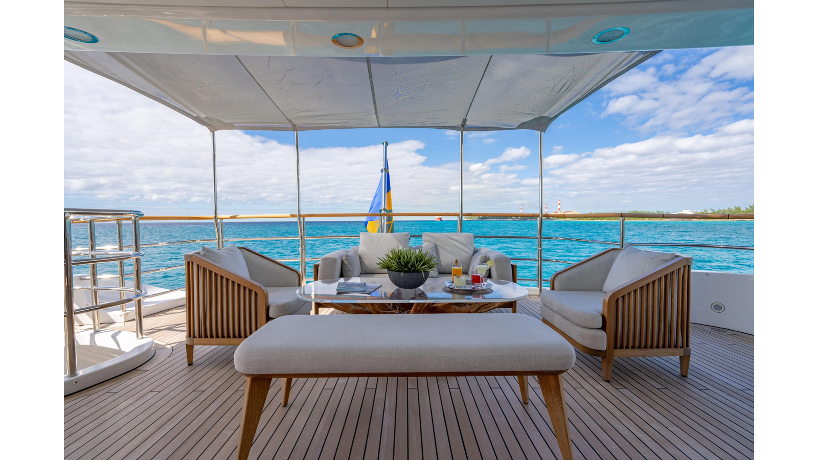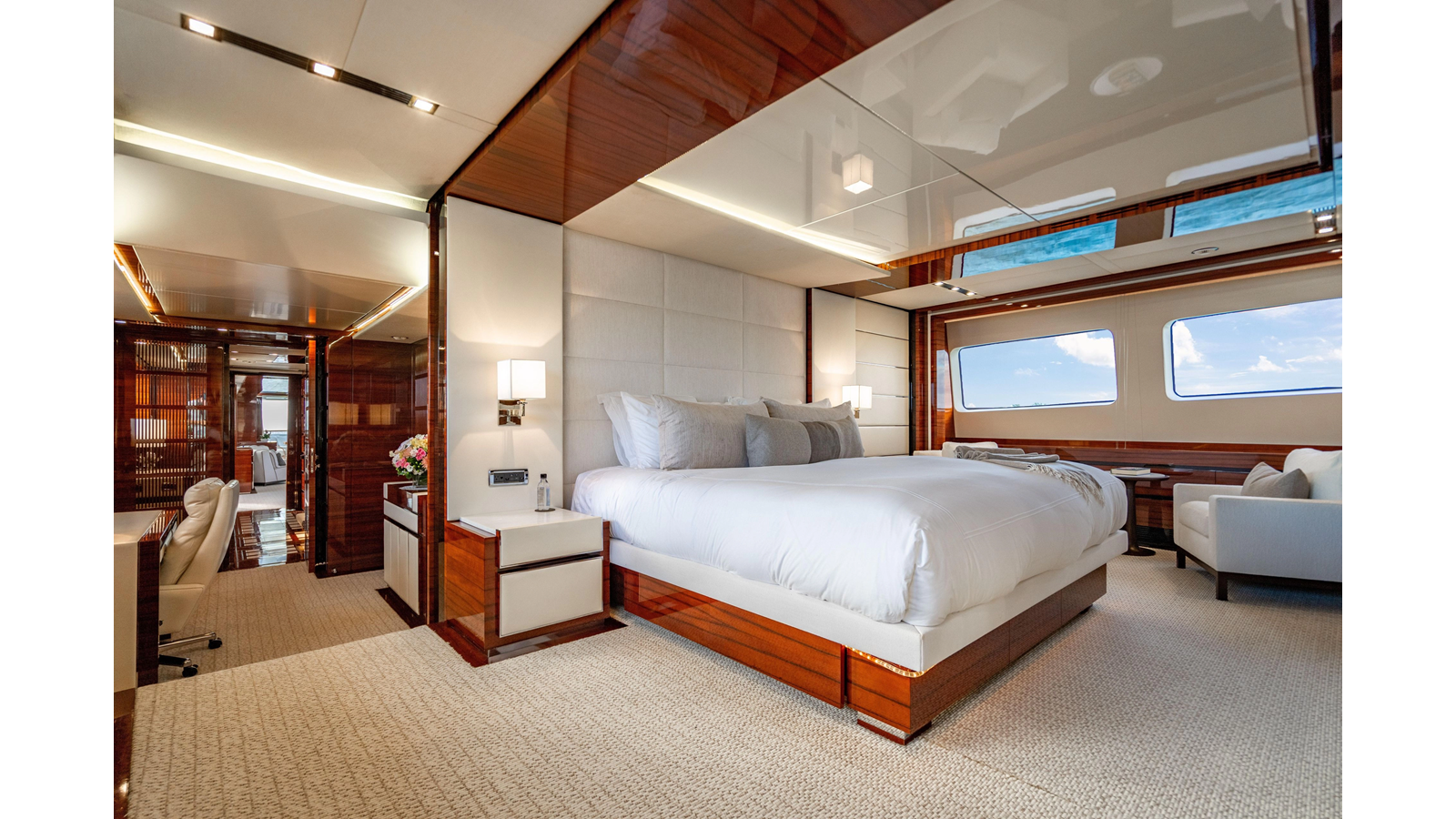The interior was further updated in 2022/2023 to a more modern décor by Patrick Knowles at a cost of approximately $2 million. Interior soft goods, blinds, and furniture were replaced, and the pilothouse navigation system was upgraded to Garmin electronics, featuring five 22-inch Garmin screens and an additional 10-inch GPS unit with monitoring in the captain’s cabin and crew area.