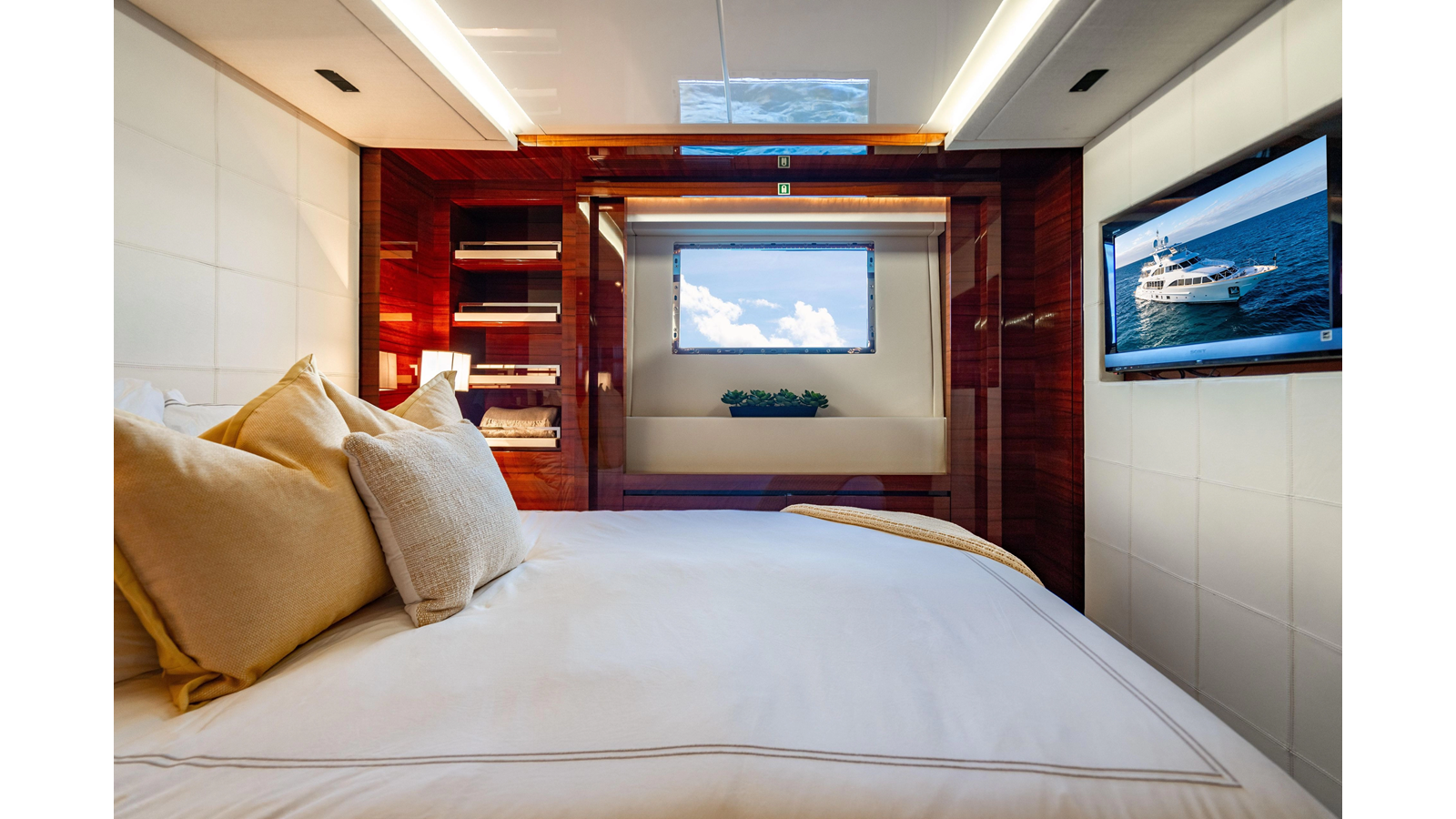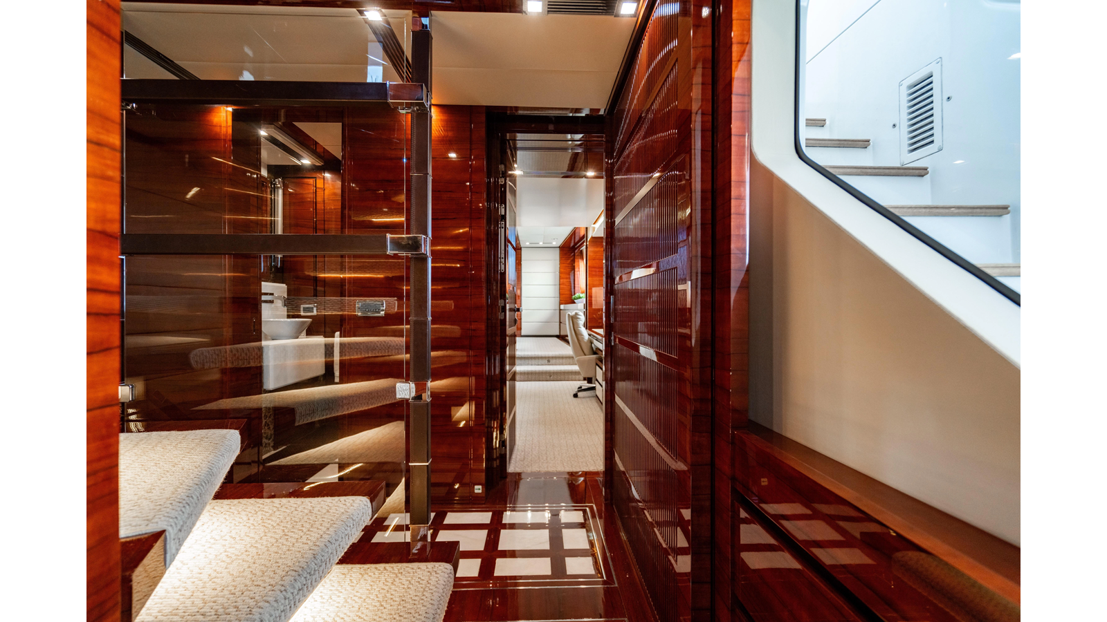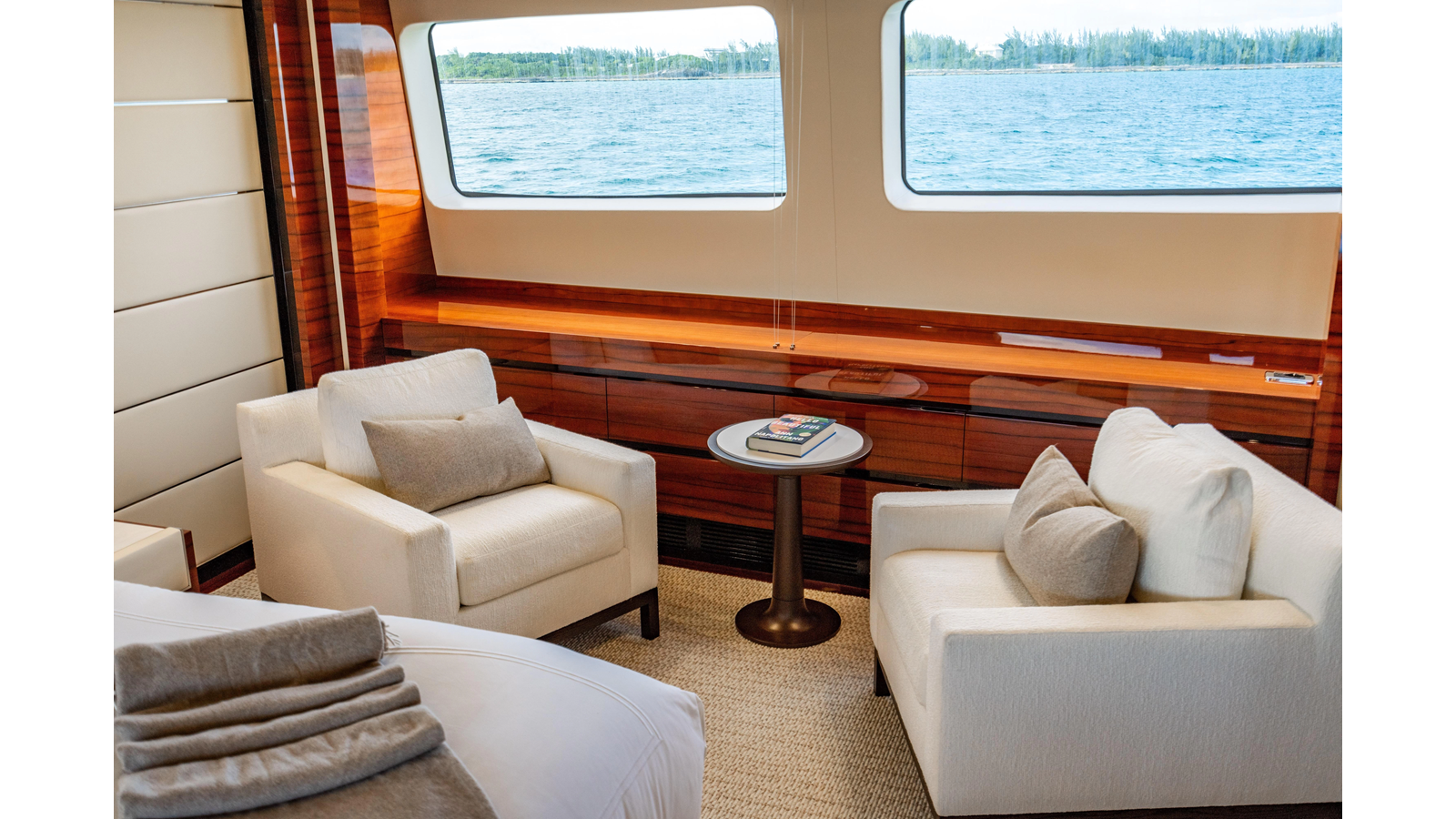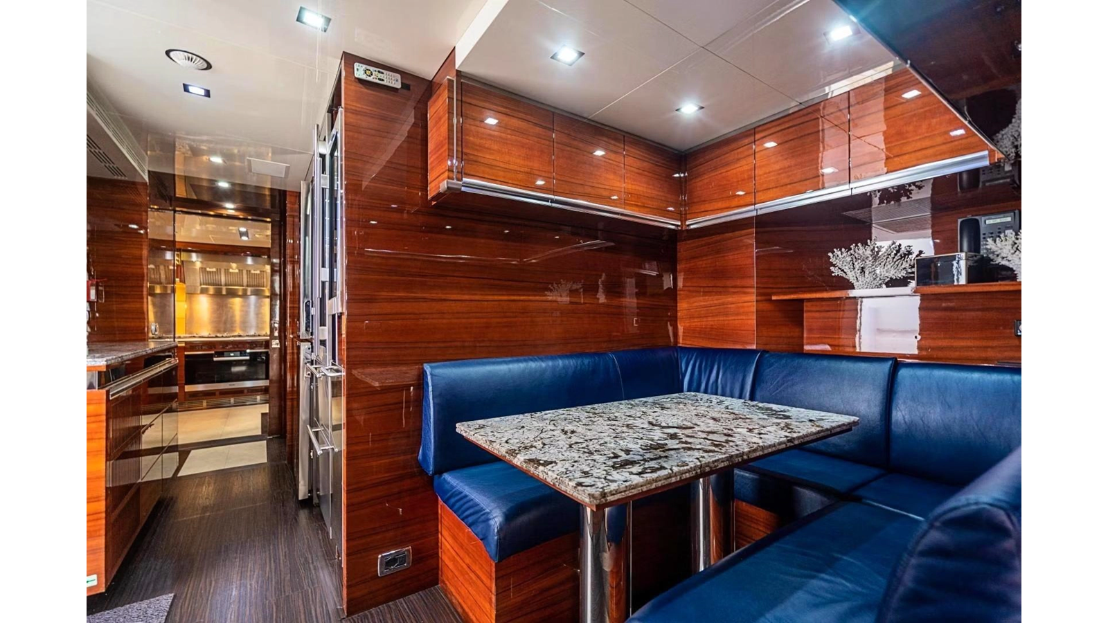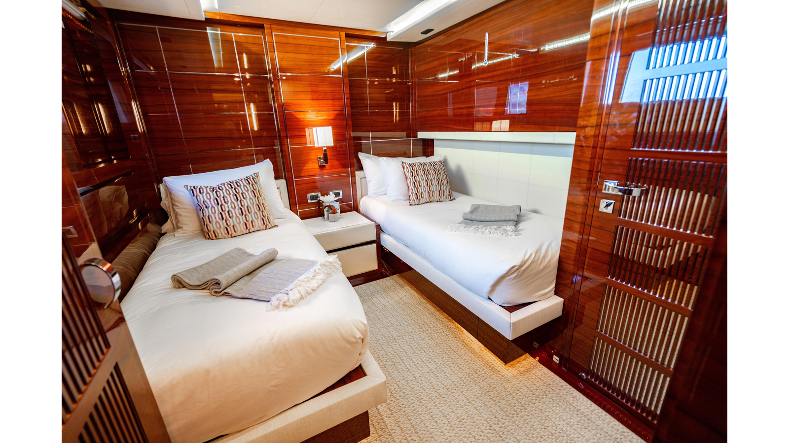 The interior was further updated in 2022/2023 to a more modern décor by Patrick Knowles at a cost of approximately $2 million. Interior soft goods, blinds, and furniture were replaced, and the pilothouse navigation system was upgraded to Garmin electronics, featuring five 22-inch Garmin screens and an additional 10-inch GPS unit with monitoring in the captain’s cabin and crew area.