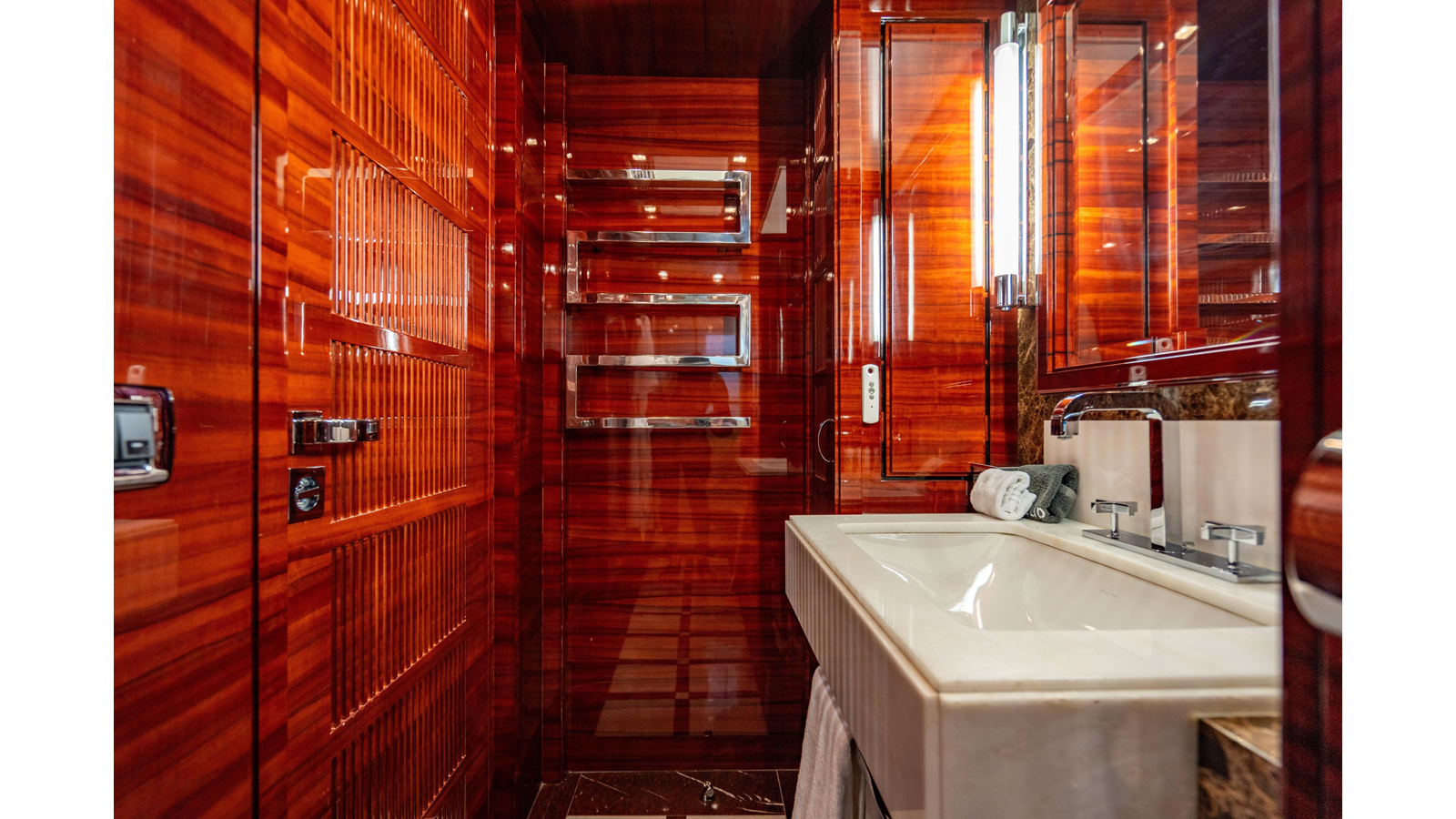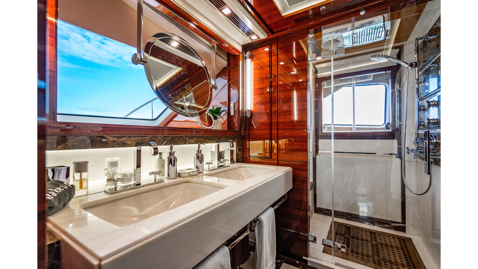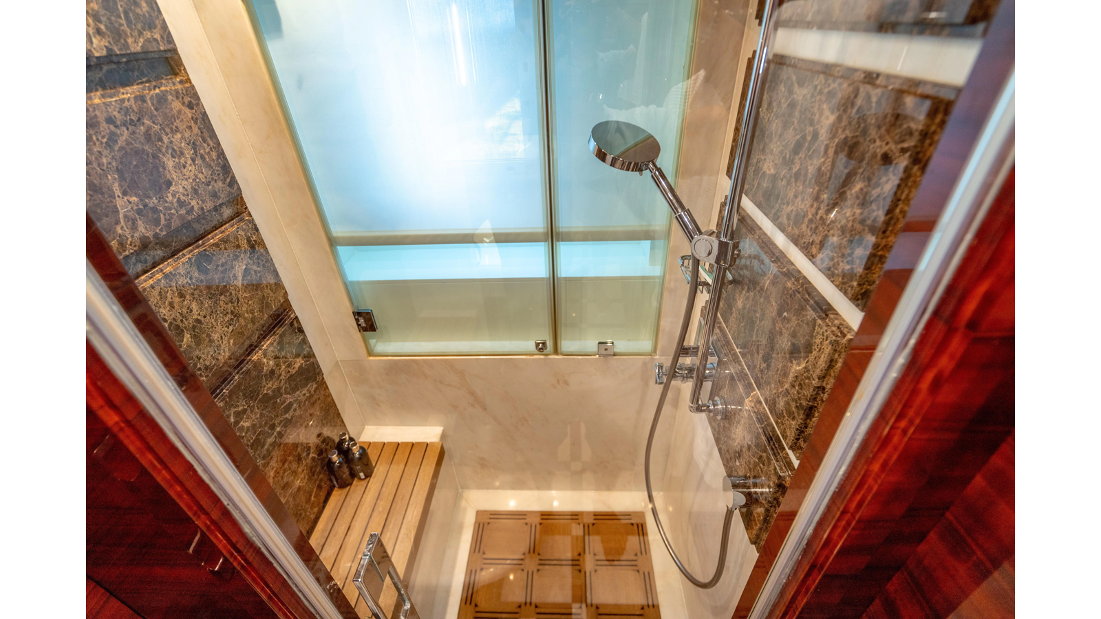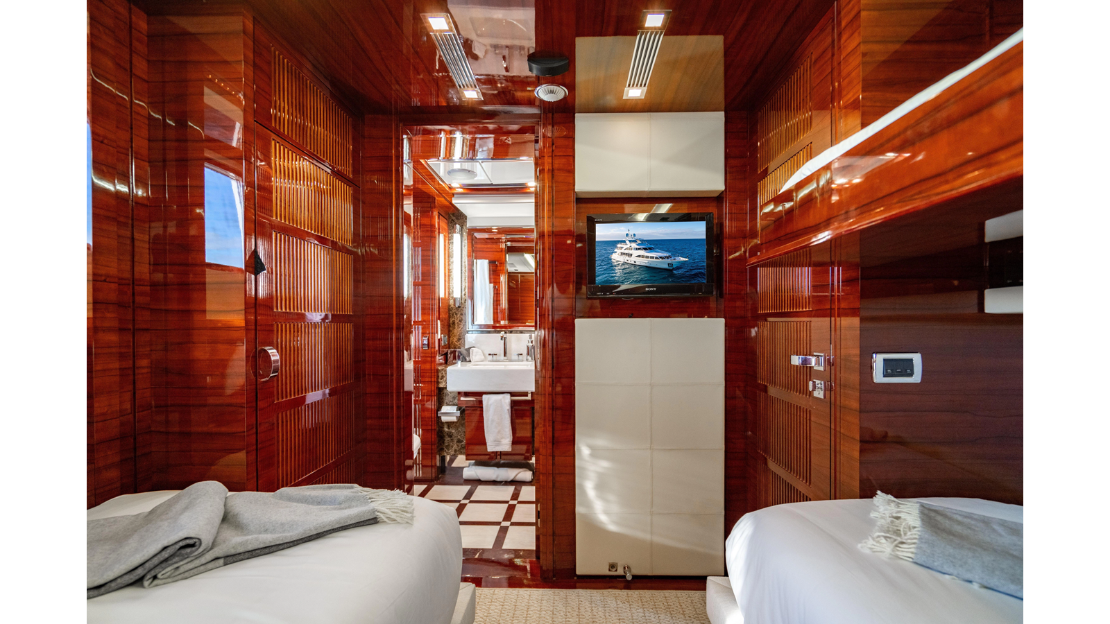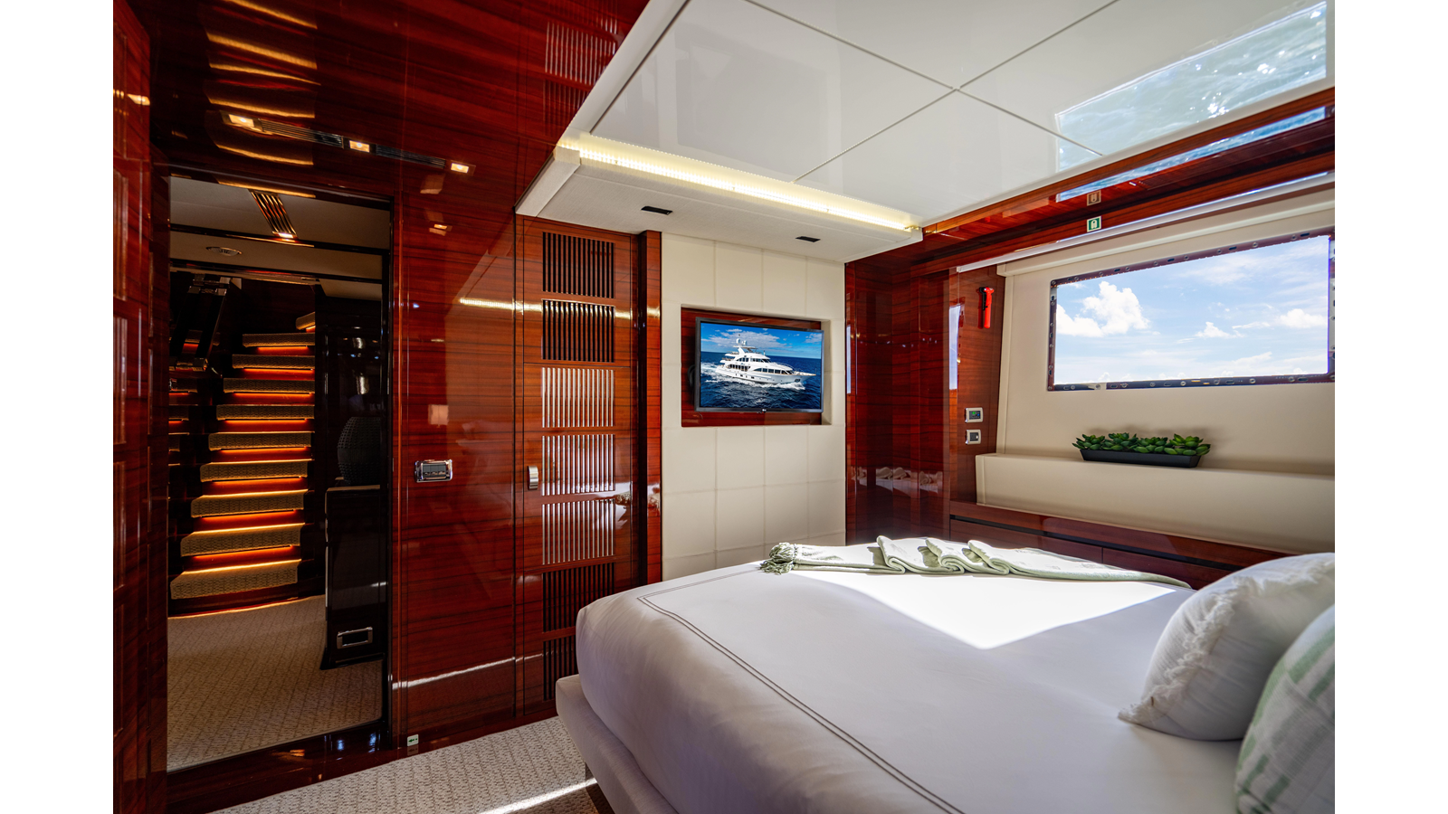 The interior was further updated in 2022/2023 to a more modern décor by Patrick Knowles at a cost of approximately $2 million. Interior soft goods, blinds, and furniture were replaced, and the pilothouse navigation system was upgraded to Garmin electronics, featuring five 22-inch Garmin screens and an additional 10-inch GPS unit with monitoring in the captain’s cabin and crew area.